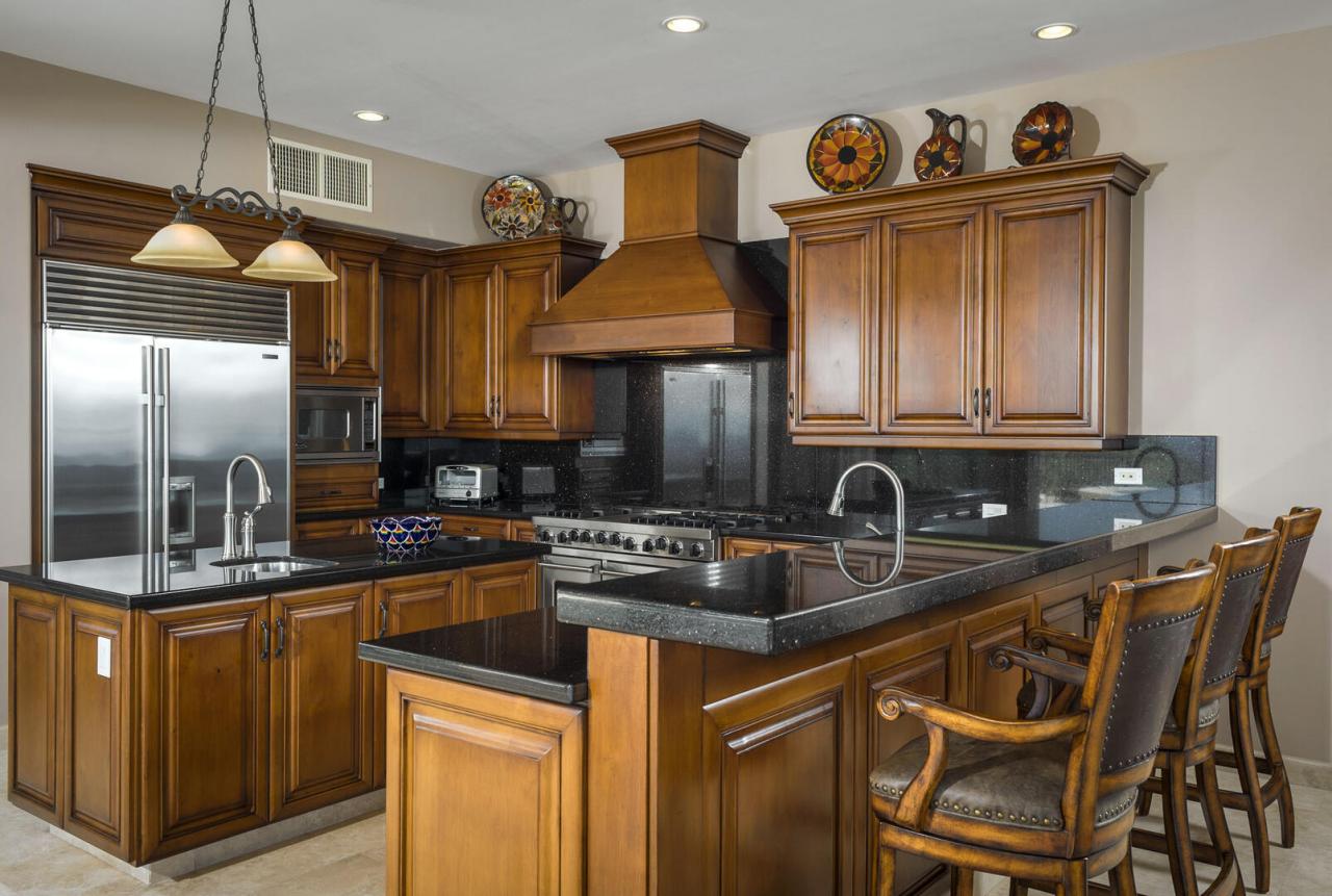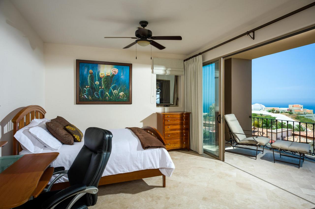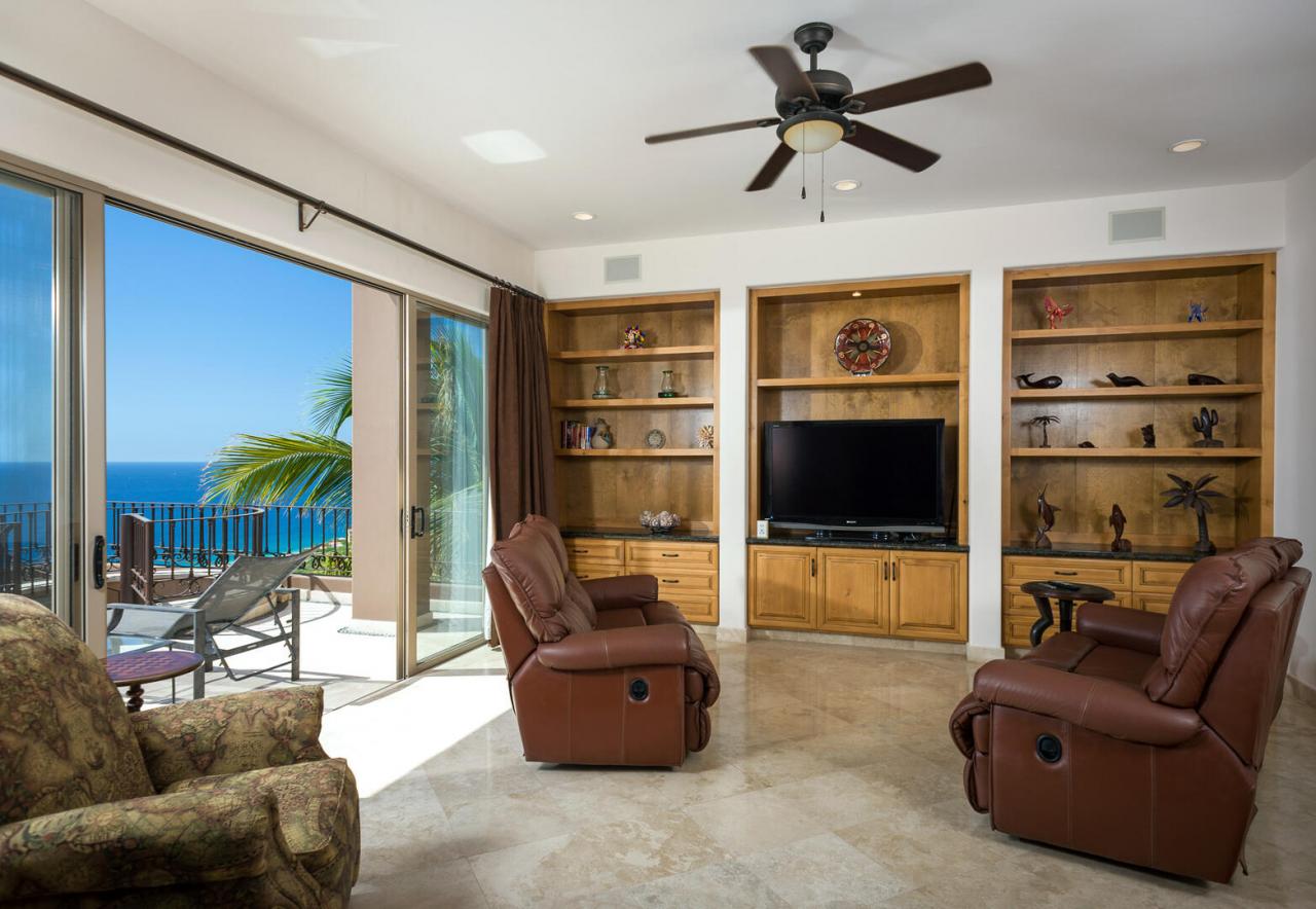 Upscale rich leather and wood furnishings adorn this Los Cabos villa, from the private bedrooms to the grand living areas and the gourmet kitchen. For added convenience, the home also features a smaller kitchenette and extra living space, enhanced by the stunning views from the numerous windows and glass doors throughout. The villa includes a formal dining area with seating for up to 10 guests, overlooking the expansive outdoor space.