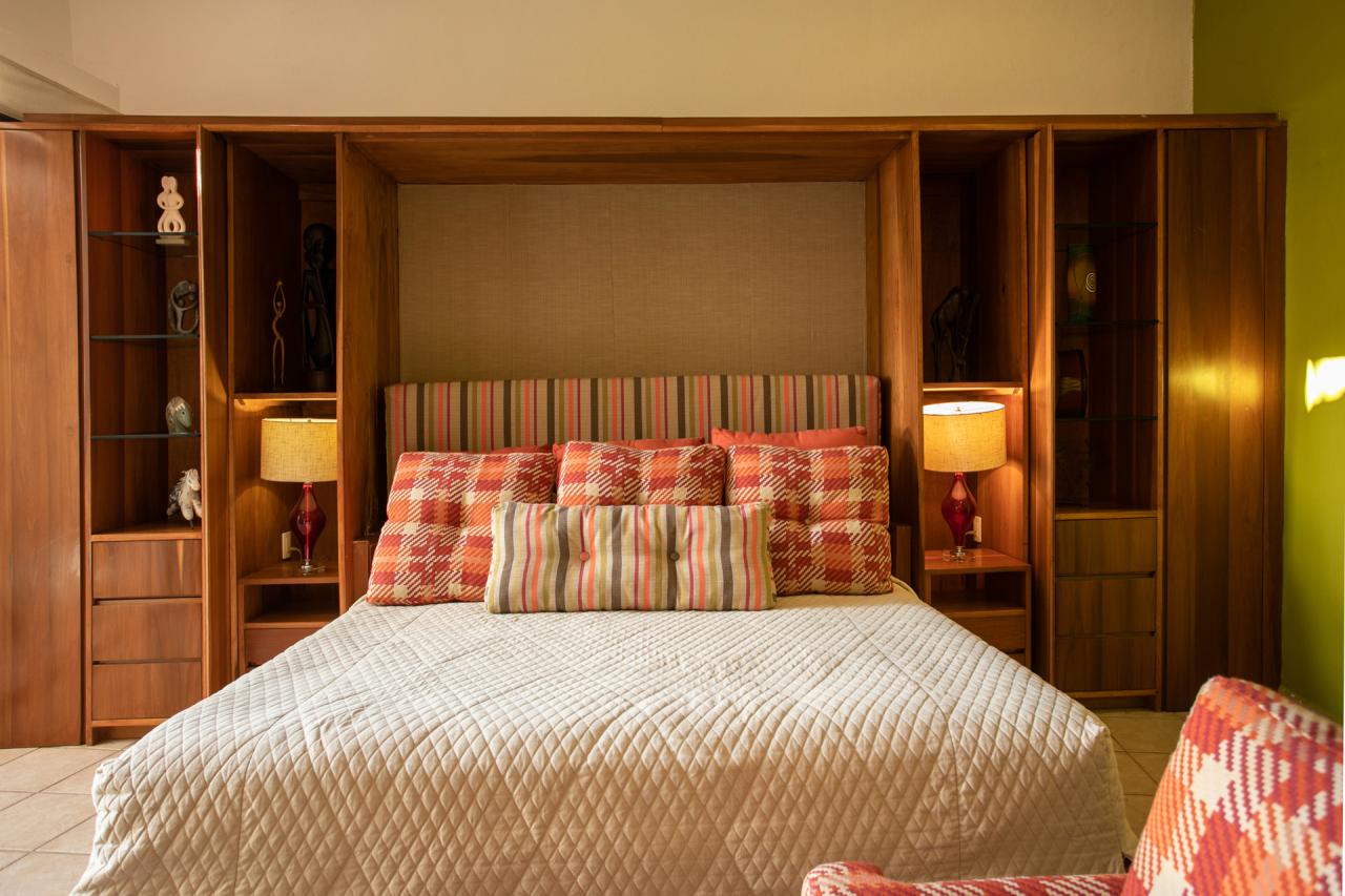 - Bedroom 7: King bed, en suite bathroom, view of interior water garden