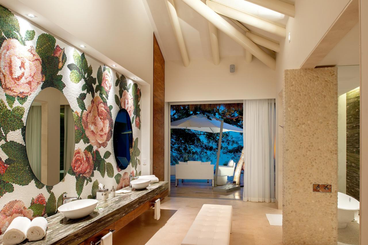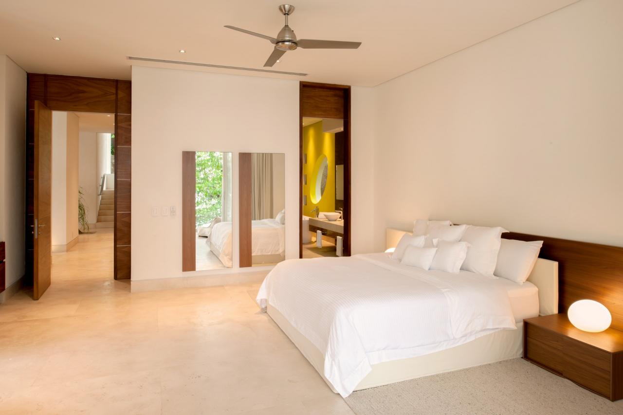 Casa Papelillos is a unique mix of sleek contemporary furnishings and natural features. Trees growing through the oceanfront balconies have been left intact, making the open-plan living areas feel as though they’ve grown out of the landscape. In the living room, clean-lined white seating is cool and modern, while pops of color like a red carpet and yellow cushions add a whimsical touch. A statement stone dining table has room for twelve, and the fully equipped kitchen has a spacious breakfast bar.