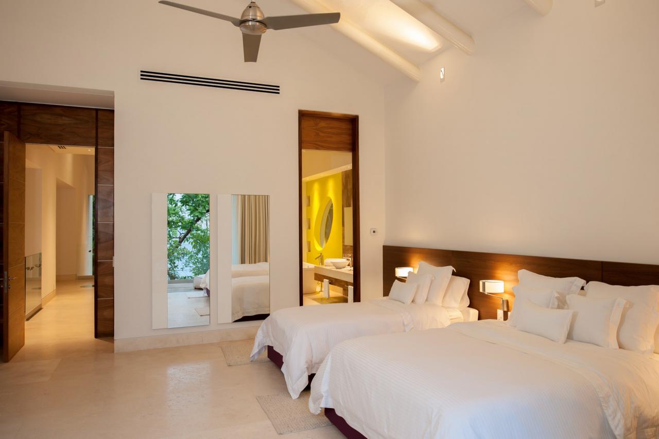 Bedroom 2: Two queen beds, en suite bathroom, in room air, ceiling fans, TV, Bluray DVD player, telephone, interphone, walk-in closet, balcony, ocean and pool view