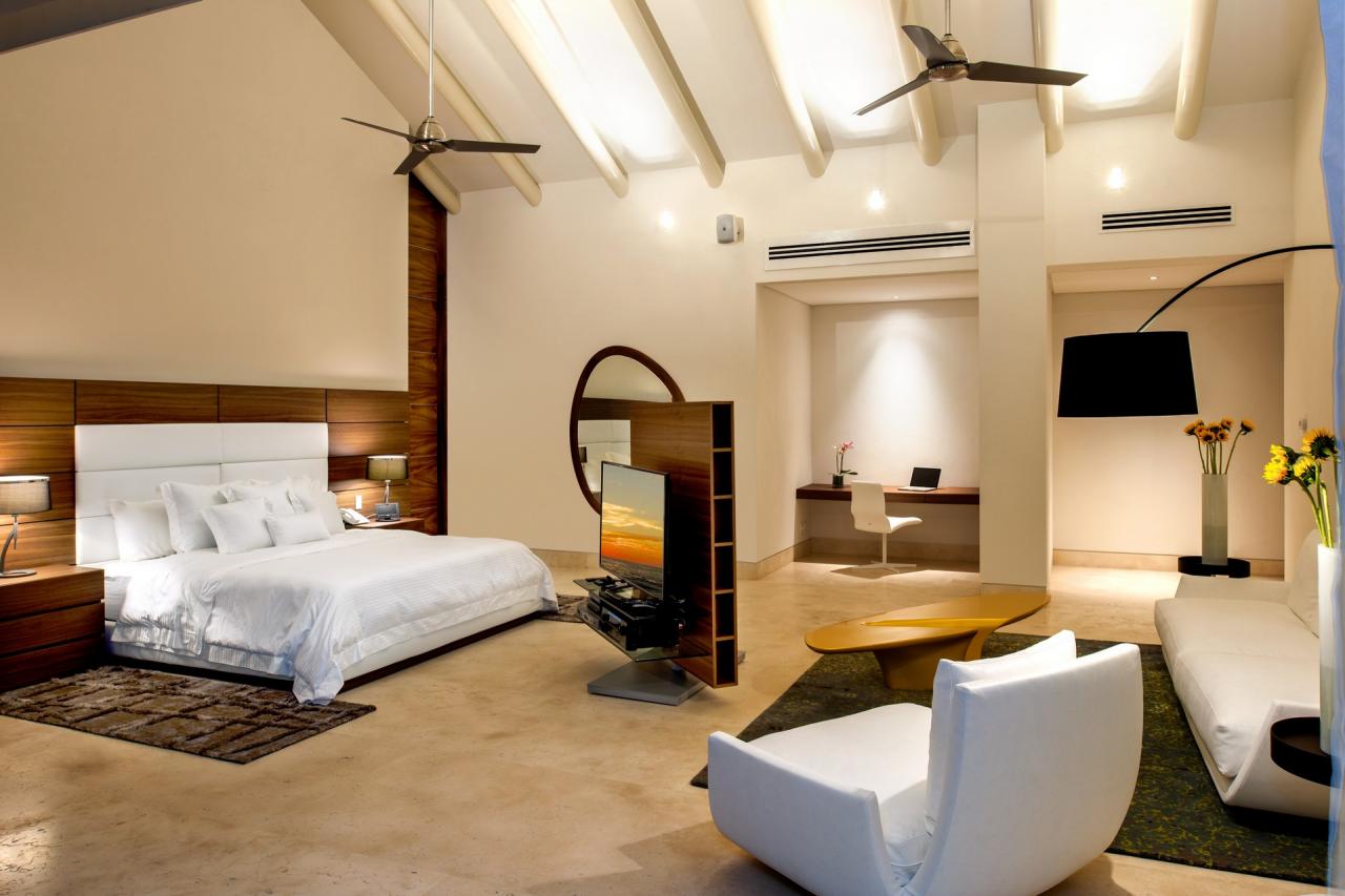 Bedroom 1: Primary with king bed, en suite bathroom with shower, bathtub and bidet, in room air, ceiling fans, TV, Blueray DVD player, sound system, telephone, interphone, safe, walk-in closet, access to terrace, ocean view