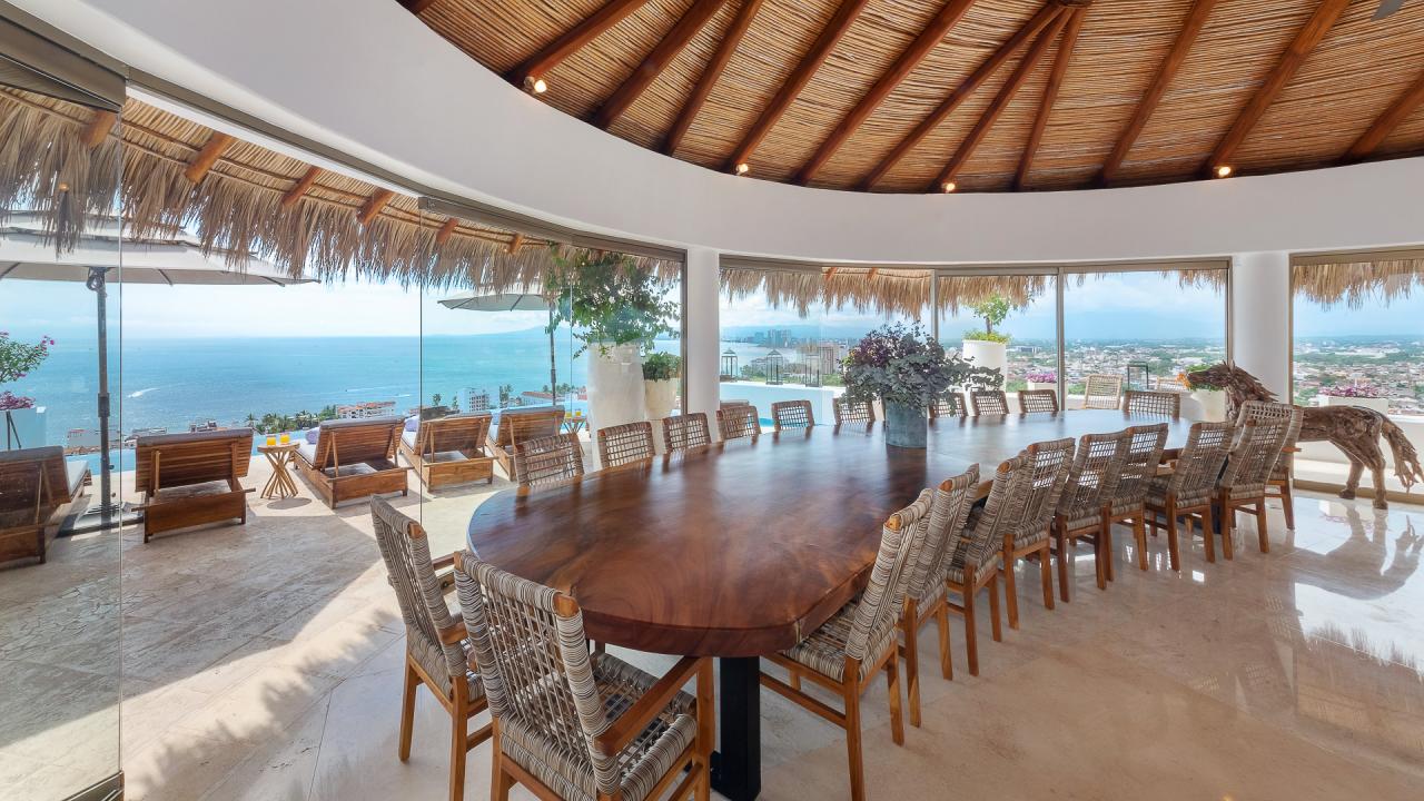Villa Iris is a spacious nine-bedroom villa located in Puerto Vallarta, Mexico. This Puerto Vallarta villa rental is located hillside with breathtaking views of the bay and a short walk to the sandy beach Playa Camerones. Villa Iris showcases contemporary architecture with elegant details and a calming neutral palate, the perfect complement of sophistication with natural organic textures.