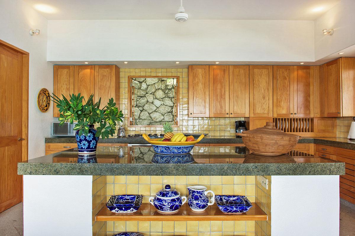 Merging indoor and outdoor space is a key element of Lucia’s serene environment. Fresh ocean breeze and natural sunlight flows easily throughout the interior spaces thanks to wide opening on the terrace. The interior decor is bright and cheerful, with plenty of natural wood and colourful local art. The fully equipped kitchen features plenty of functional workspace on its granite countertops and centre island. At dinner, the formal dining area has space for eight guests. If you’re feeling a little more casual, there’s a barbecue on the terrace and lots of space to dine alfresco.