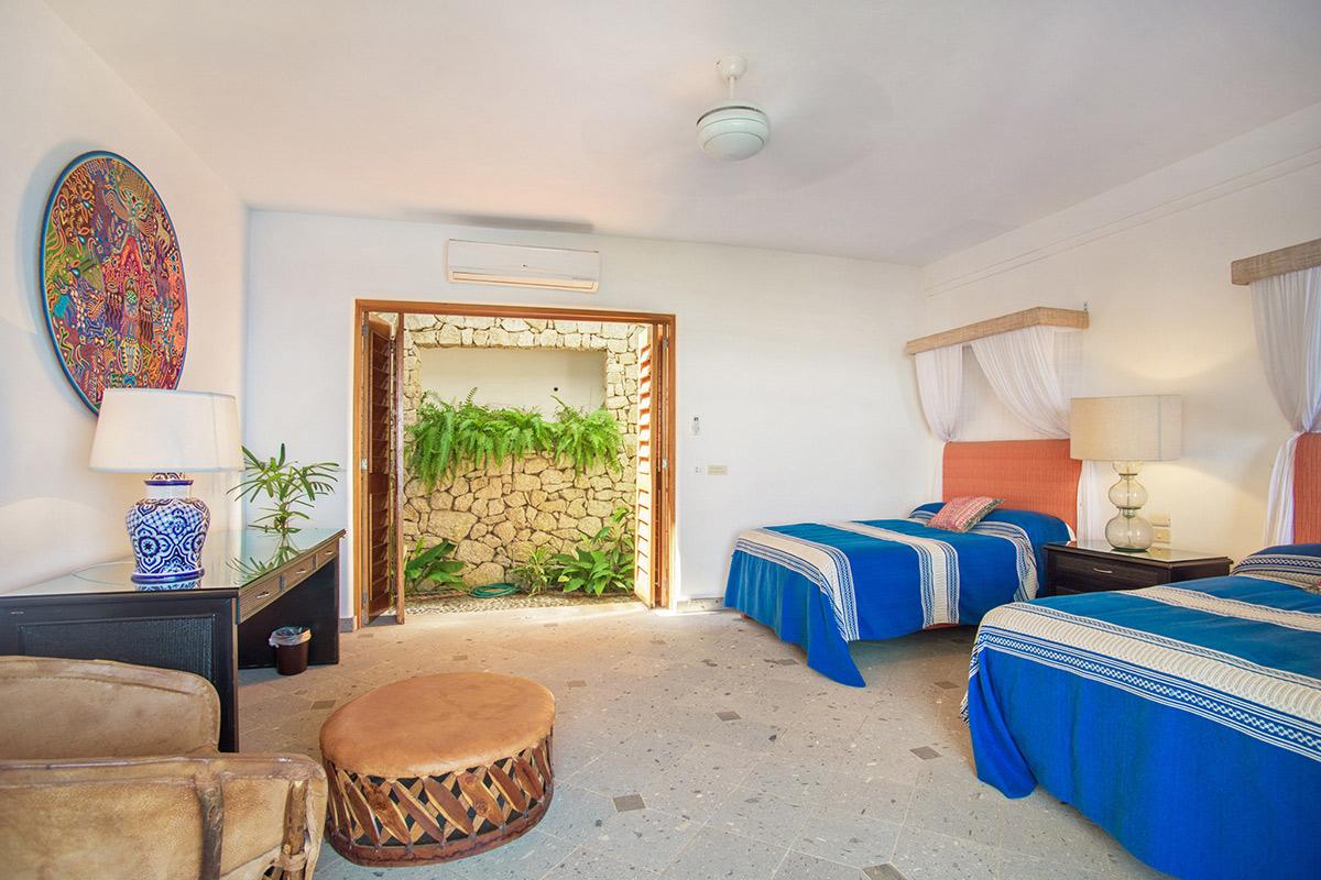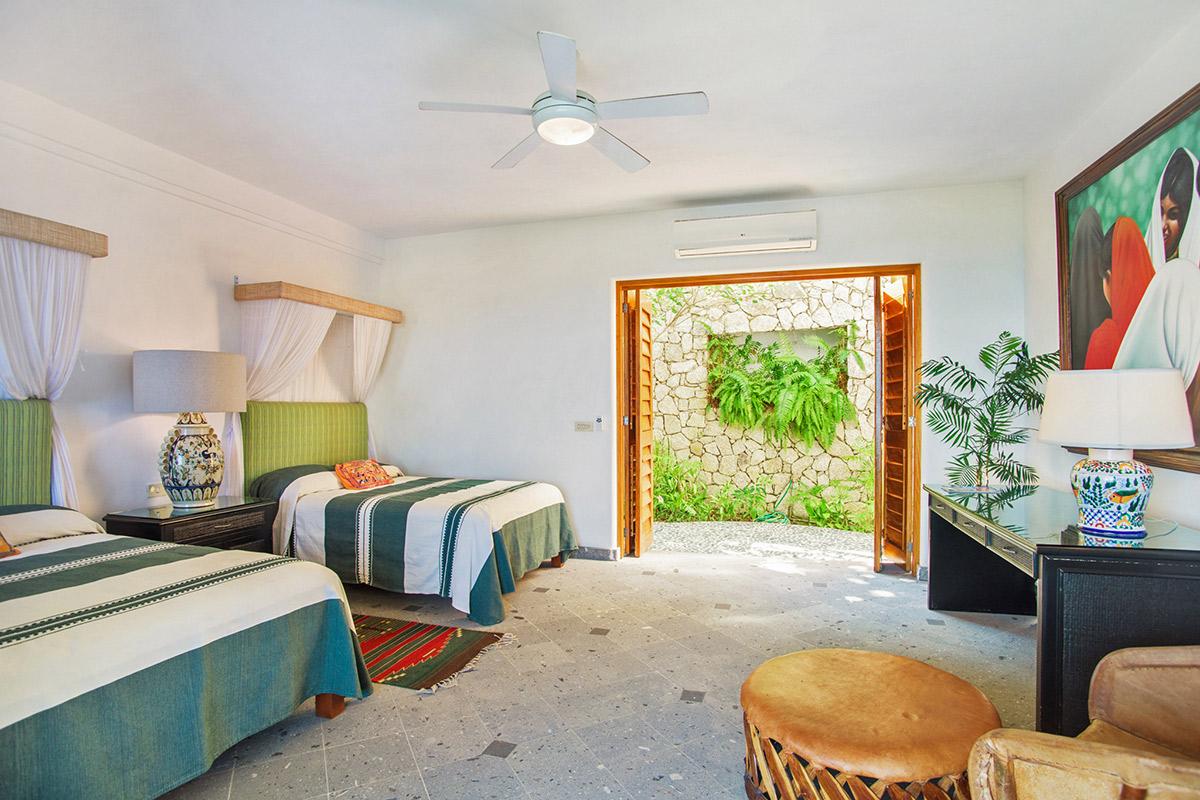 - Bedroom 4: Two queen beds, en suite bathroom with shower, AC, ceiling fan, private terrace, safe, ocean view
