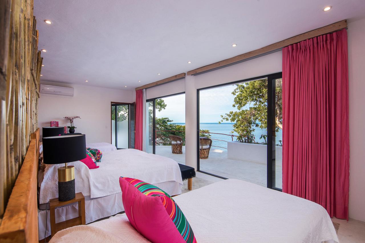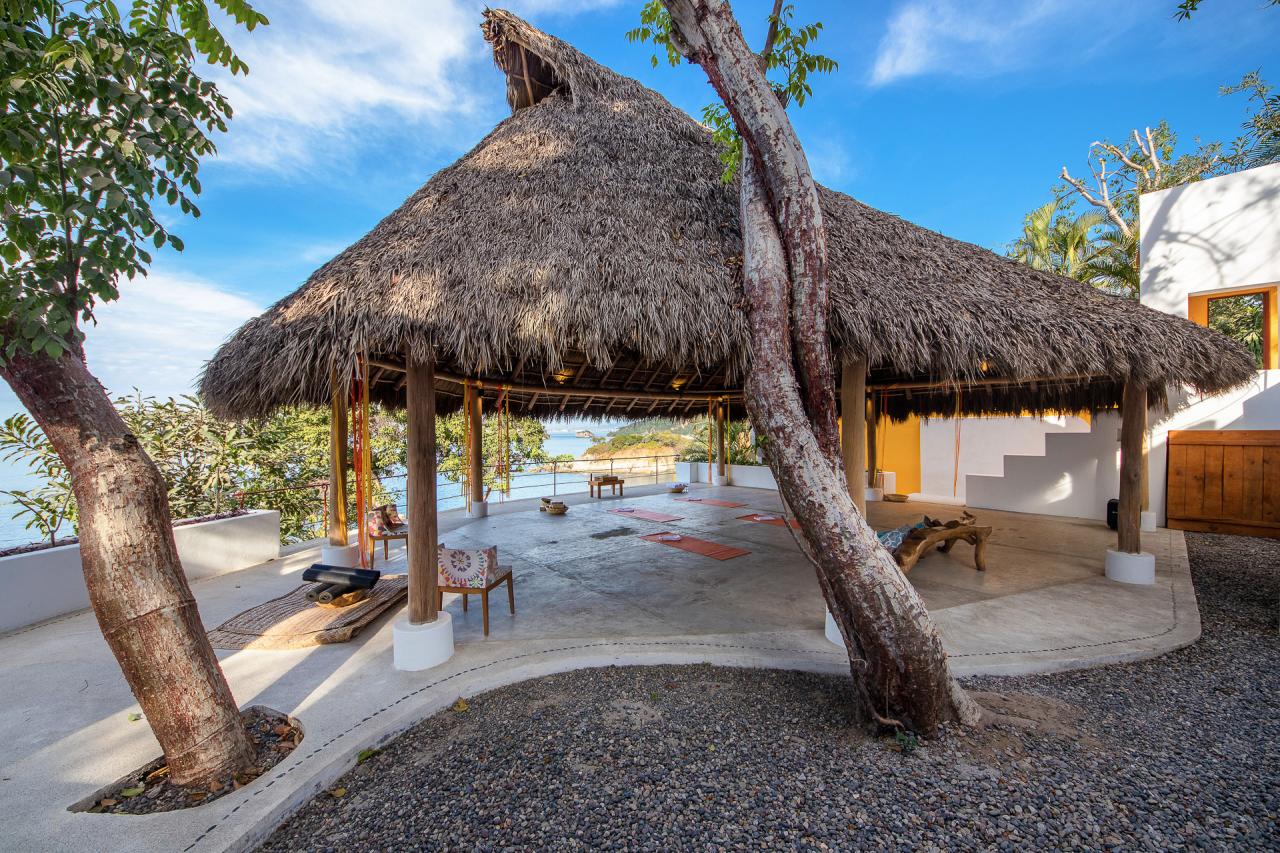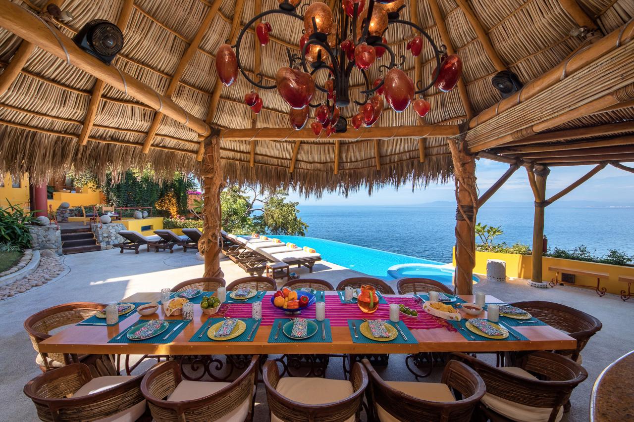 When you turn into the estates beautiful stone driveway, you are invited to enter Villa Mardarinas by the fluid and graceful opening of the soaring accordion garage doors. Made of honey colored primavera wood, these doors are only the first example of the innovation and beauty this estate holds. When you pull through the doors and park at the zenith of the cliffs of Mismaloya, you are greeted by the best view you have had on the entire journey. Soaring ceilings and conjoined great rooms open onto terraces, bedrooms, landings and patios throughout the house and the myriad variety of windows and glass doors. The cathedral like openness makes the privacy of the home that much more surprising. Four custom made hand blown chandeliers complement the loftiness of the home and accent the home’s custom furniture elements. The chandelier in the dining room hovers below the ceiling illuminating the one of a kind sabino wood table carved from a single tree which can seat 16 guests. The stairs, made from beautiful dark stained haya wood, act as the visual hub of the home. The base of the stairs below flows organically into a massive boulder bisecting the kitchen and dining area from the main living room. Each of the seven master bedrooms has a spectacular view of the bay with individual private terraces shaded by bamboo which gracefully compliments the colors of the estate. The unique features of each master bathroom speak to the creativity and artistic inspiration of Villa Mandarinas' designers. In one bedroom a half ton sink has been carved from a volcanic boulder so massive that the piece was installed and the room was built around it. Two of the master bathrooms share a single monolithic boulder stretching through two floors to bind the rooms with the natural elements of the land. In another master bathroom, a custom window offers a graceful curve of etched glass that accents the view of Los Arcos across the bay. Villa Mandarinas offers its guests an amenity unique even in the community of Mismaloya - the ability to arrive at your destination from the land or the sea. When you approach the estate by water, the home’s earthy and vibrant colors draw your eye from miles away. The property’s dramatic castle walls rising to the terraces, gardens and lawns above grow more and more impressive as you pass Los Arcos and continue over the water to the estate. As you step off the boat onto Villa Mandarina’s private pier the final chapter of the estate’s story is presented to you as the first. A private beach on one side of the property balances itself against a spacious natural salt water pool on the other. These features are completely unique and are an expression of Architect Alberto Alvarez’s vision of what a home this amazing deserves. The nature of this home is such that words and pictures can only offer a suggestion of the homes unique beauty, location and the inspiration of its architect and designer. Those who are fortunate enough to visit this estate will come away with a true understanding of what it is to live “La Pura Vida."