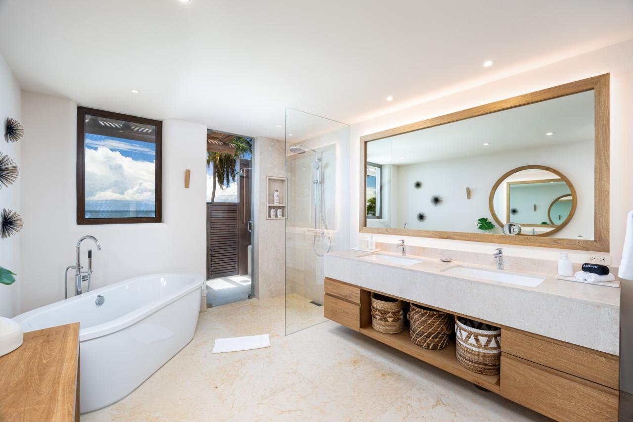 - Bedroom 1: Primary with king bed, en suite bathroom, al fresco shower, walk-in closet, TV, sitting area, terrace, sunset view