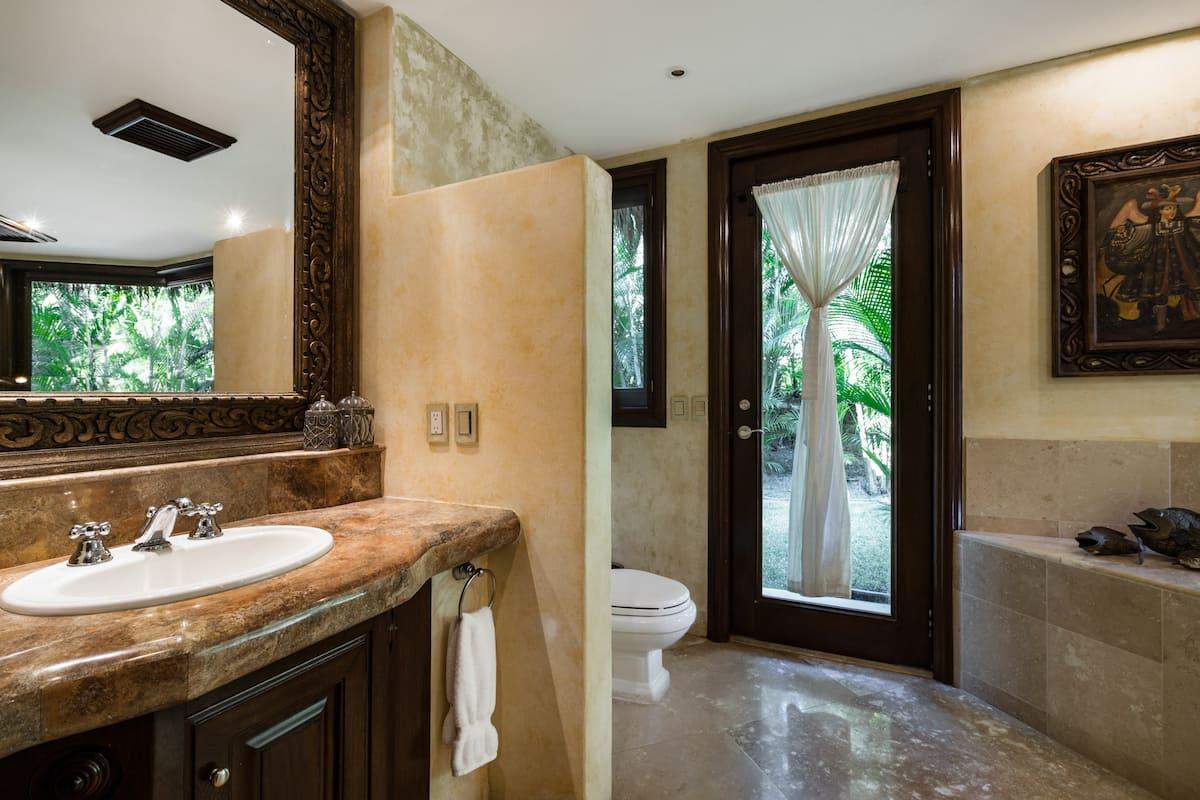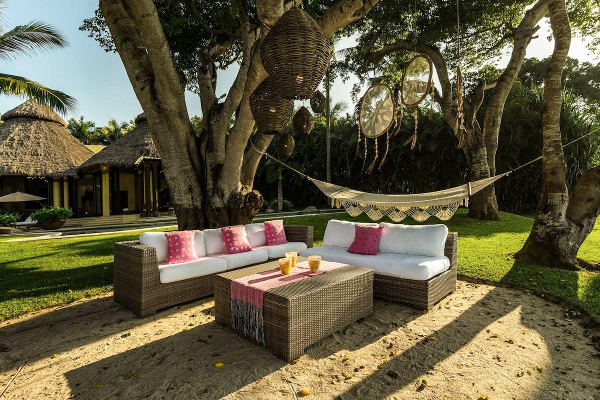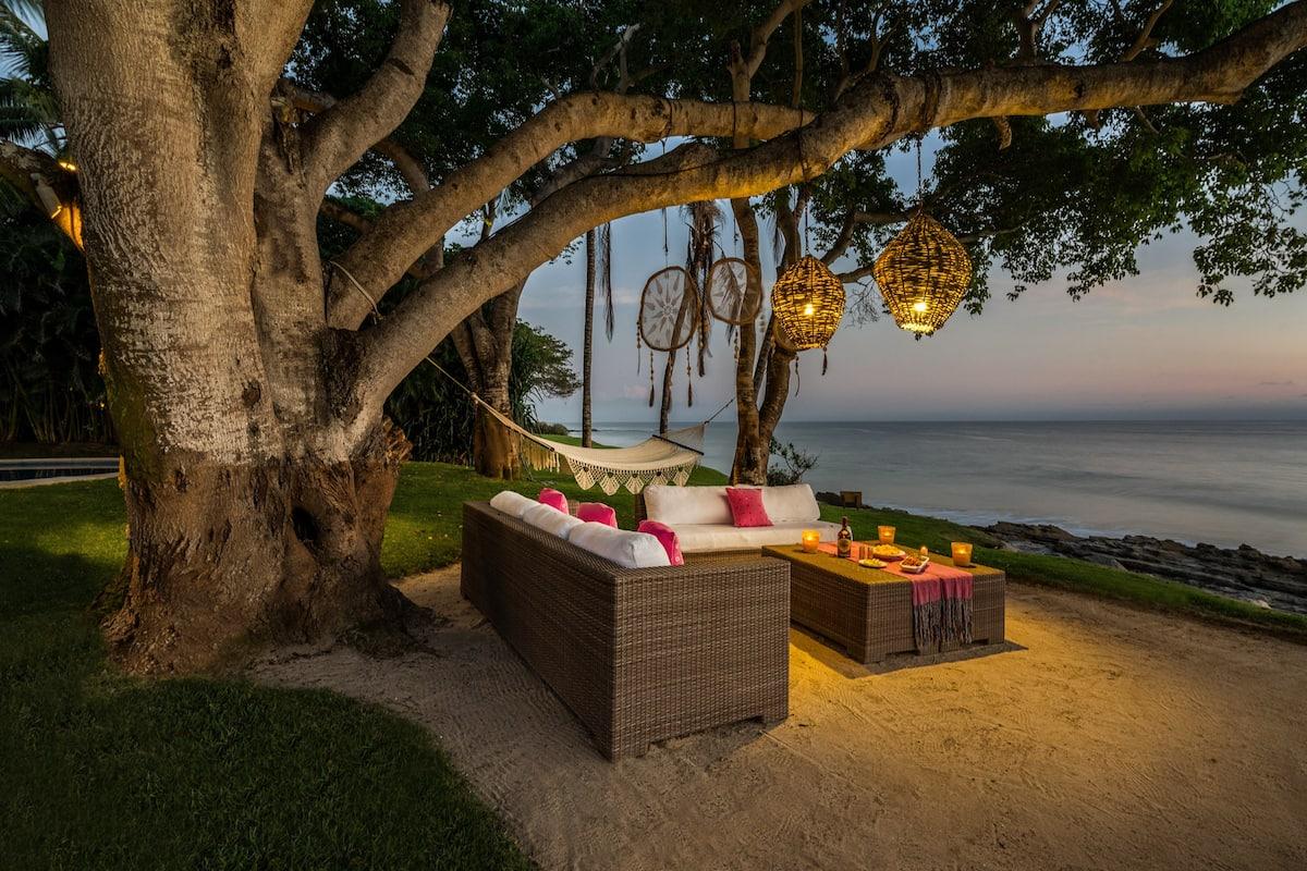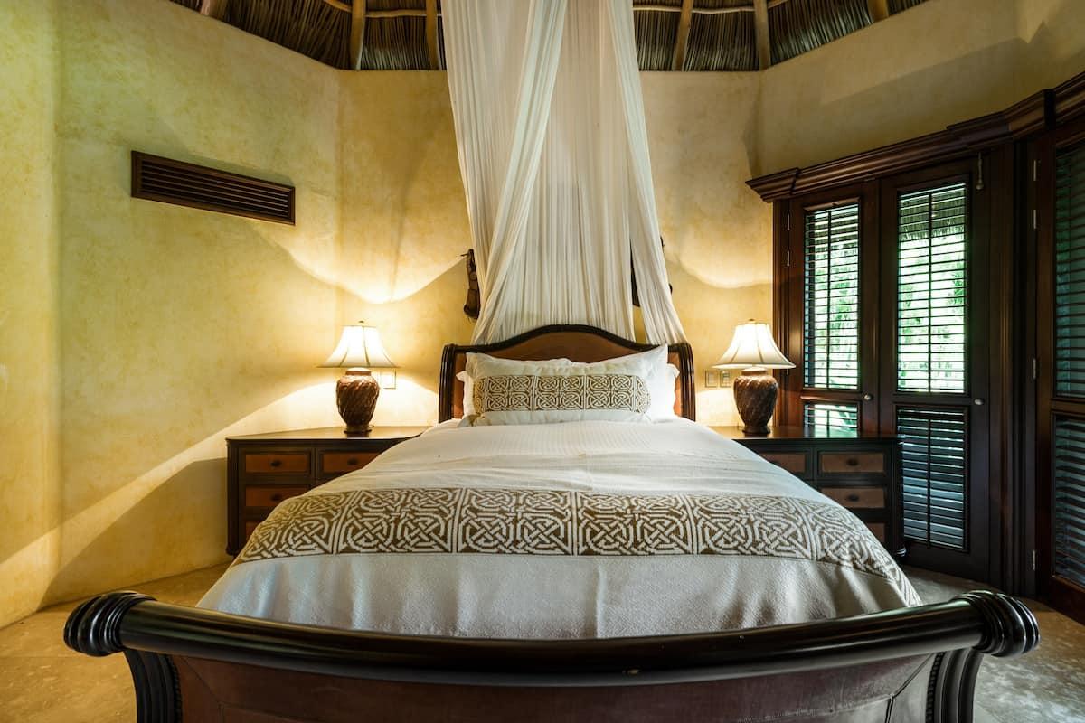 Spending time outdoors at Casa Bella is a must. The sprawling, resort style pool is the first thing to draw the eye. As you walk along the pool you stumble upon even more amenities like the alfresco dining area, palapas with outdoor living furniture, and sun loungers scattered about. As you move closer to the white sandy beach you find a secluded hammock and seating area under a beautiful tree, the perfect place to gaze at the stars after a long, relaxing day at Casa Bella.