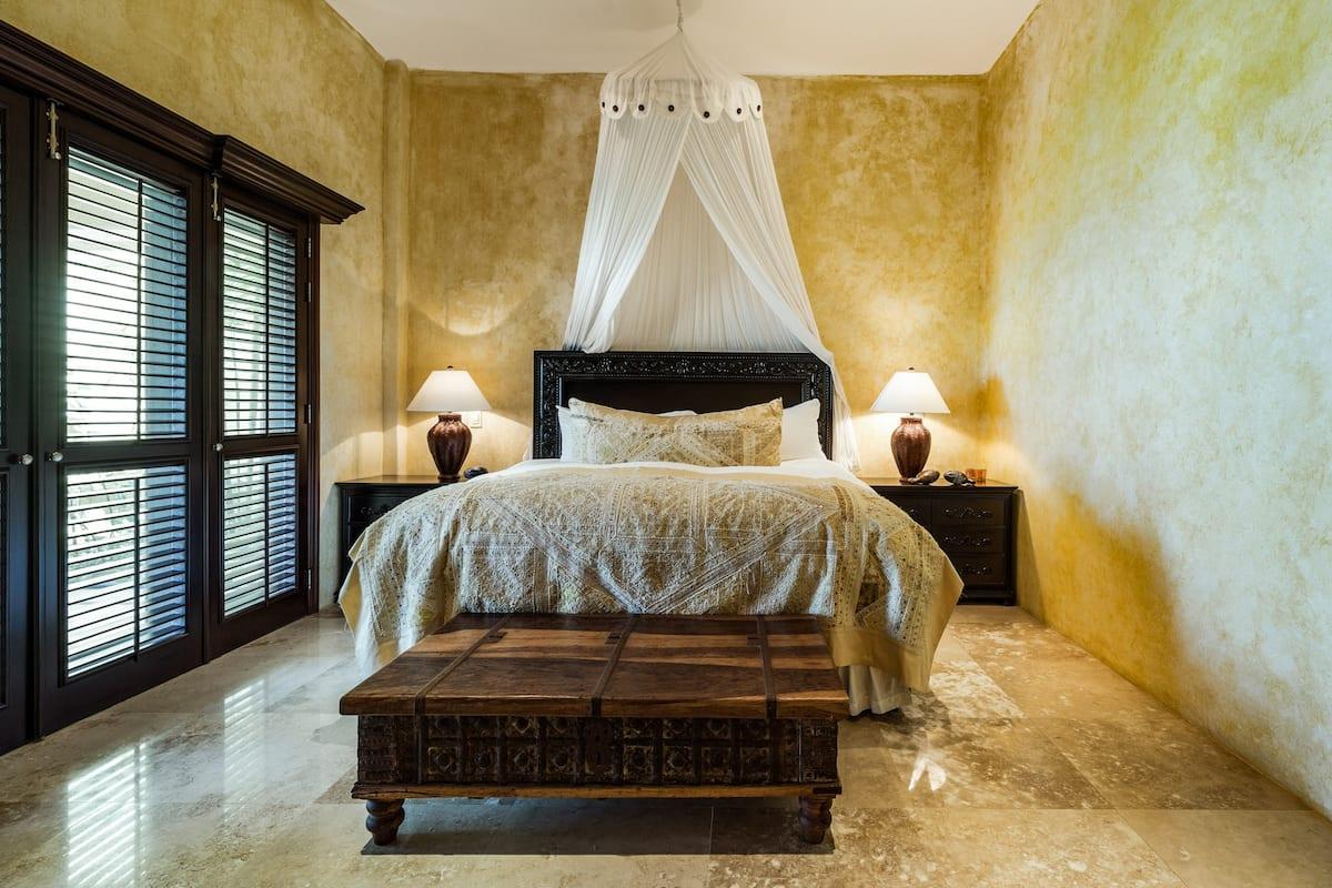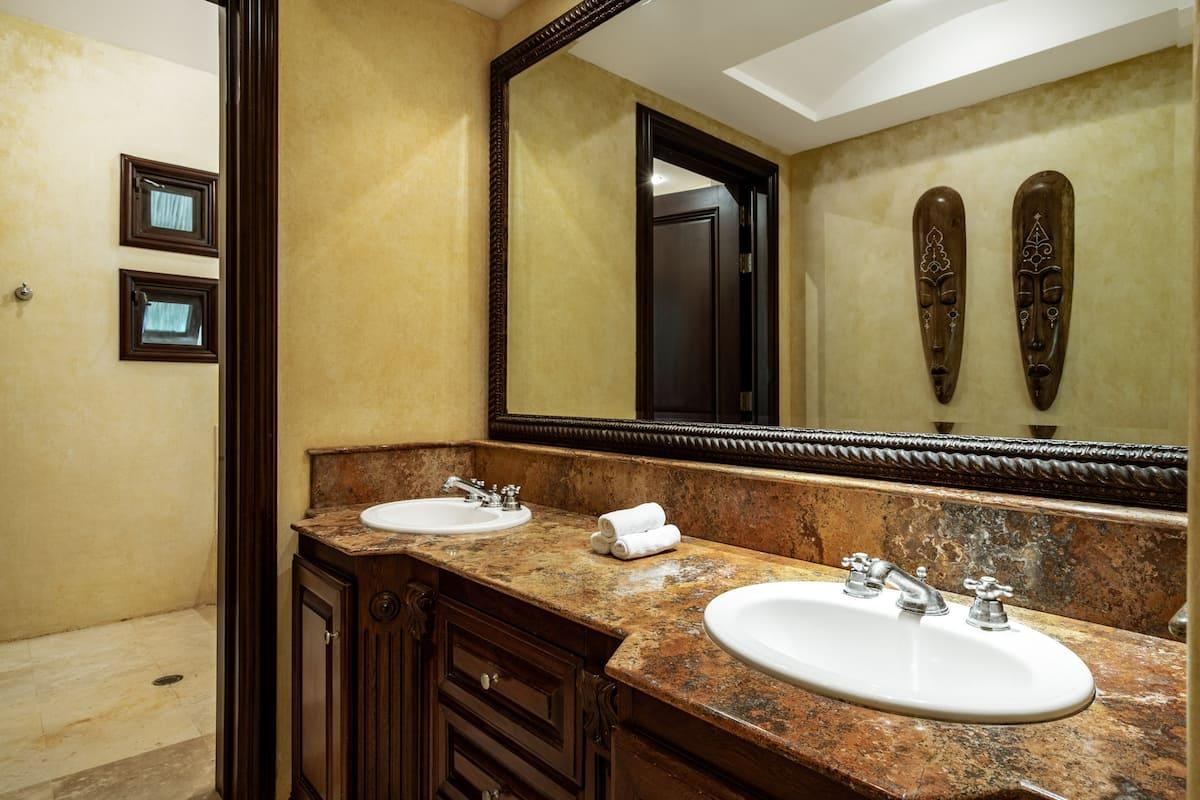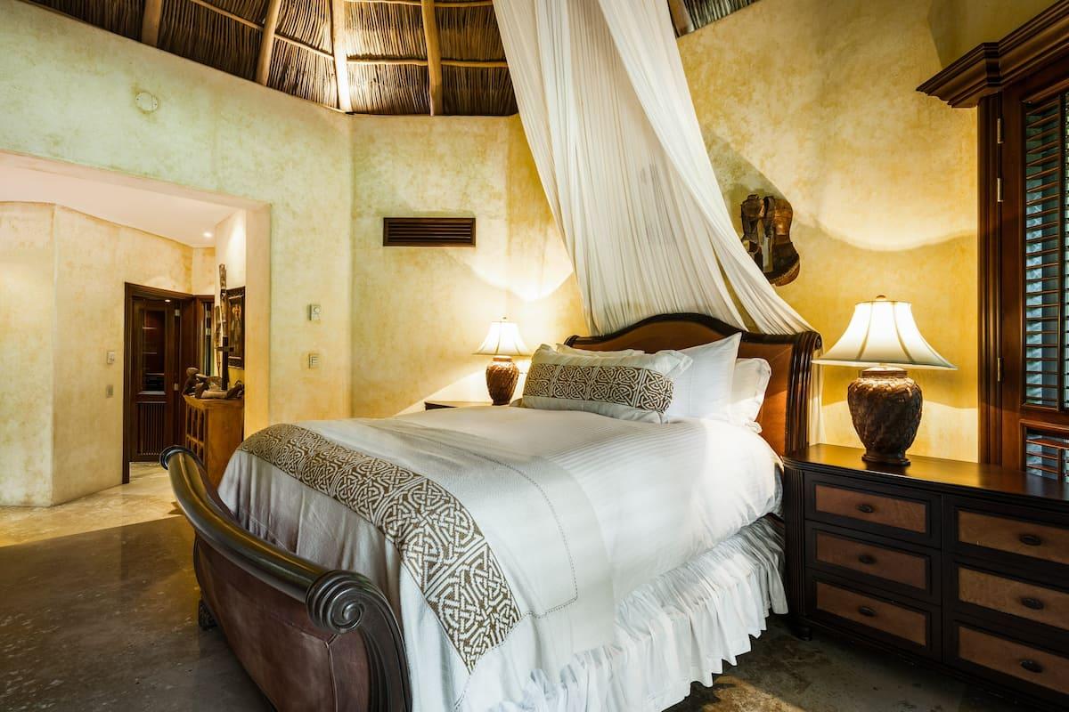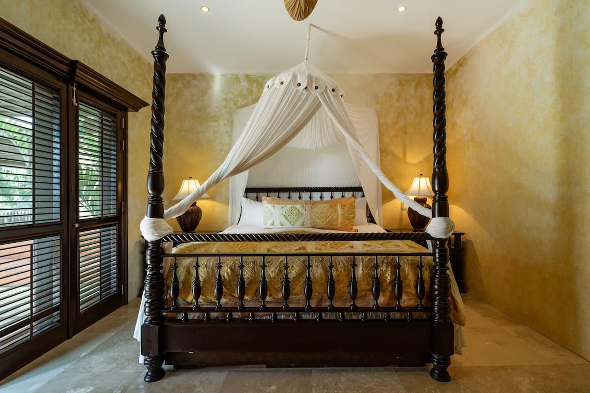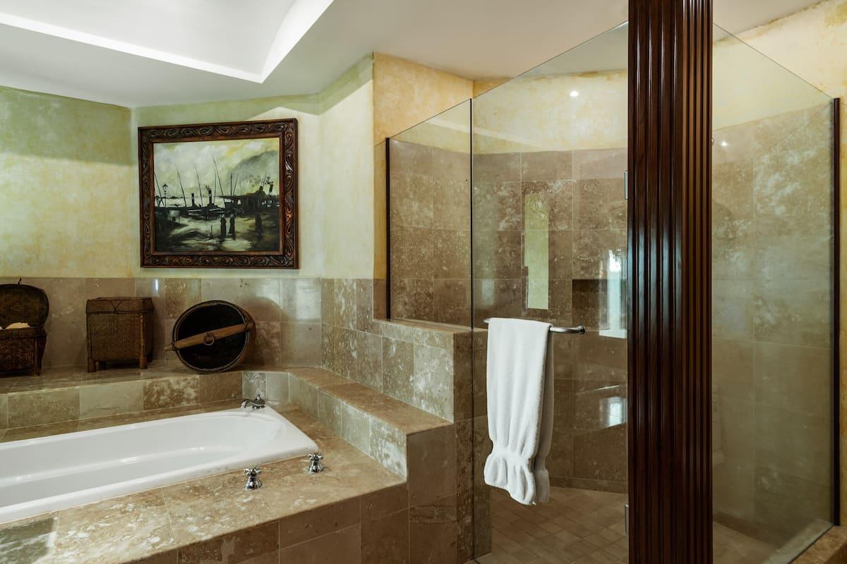 - Bedroom 4: King bed, en suite bathroom with stand along shower & bathtub, walk-in closet, TV, AC, desk, safe, ceiling fan, private terrace, access to pool area, ocean view