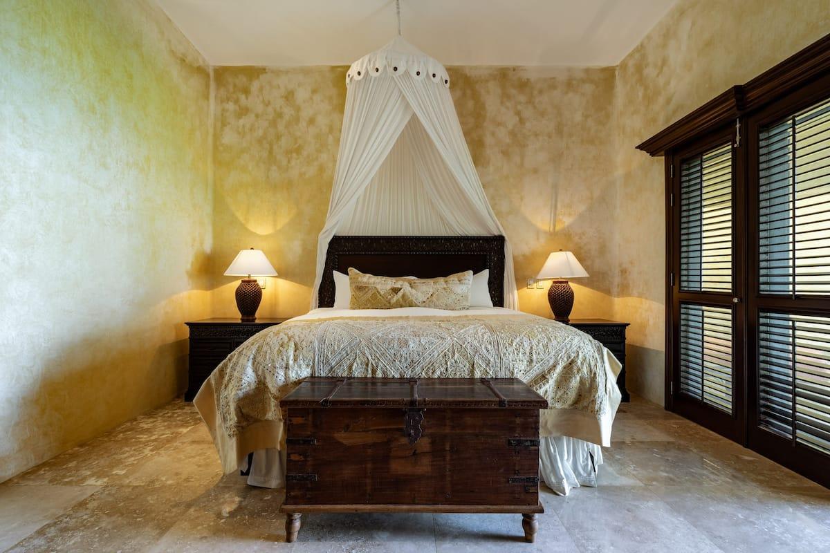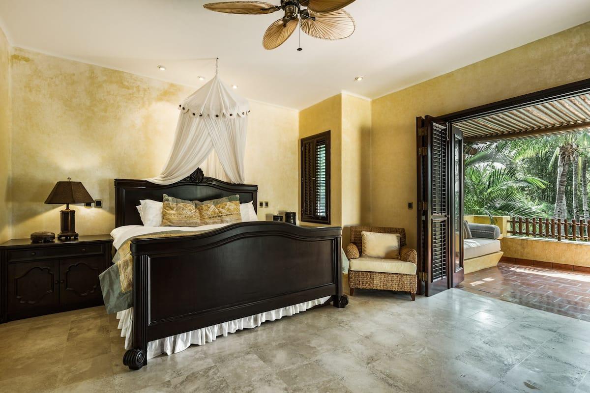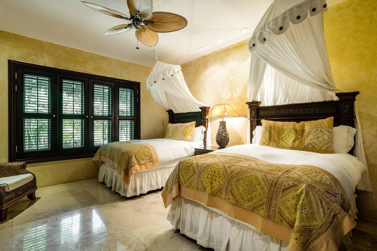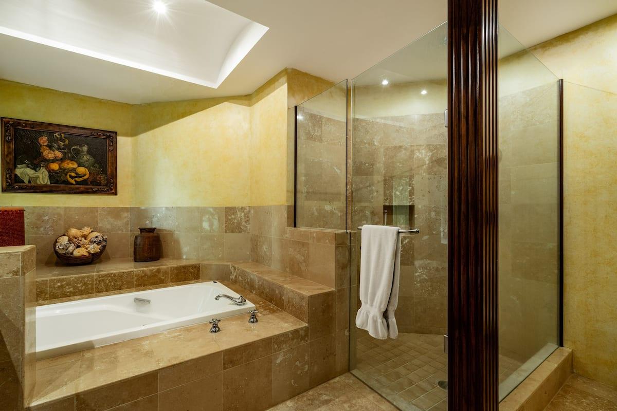 - Bedroom 4: King bed, en suite bathroom with stand along shower & bathtub, walk-in closet, TV, AC, desk, safe, ceiling fan, private terrace, access to pool area, ocean view