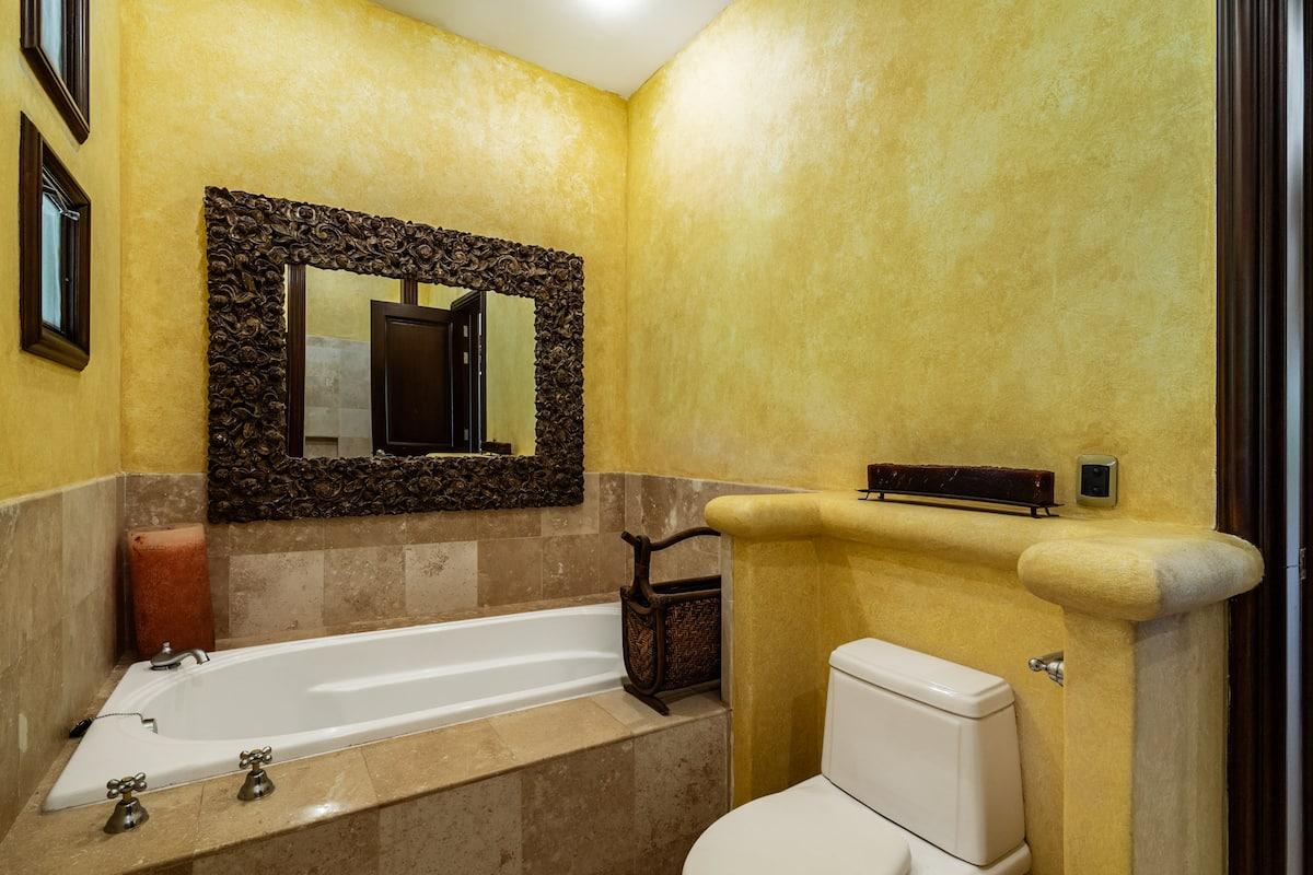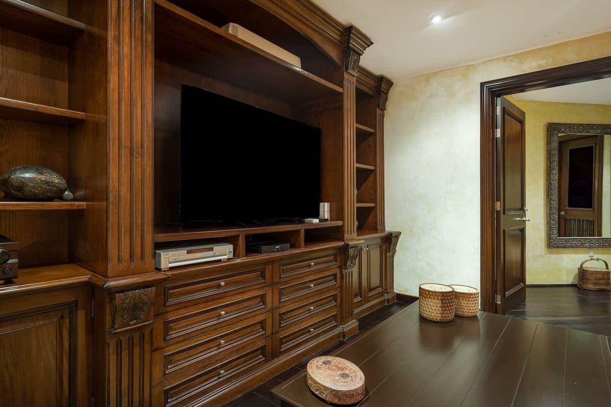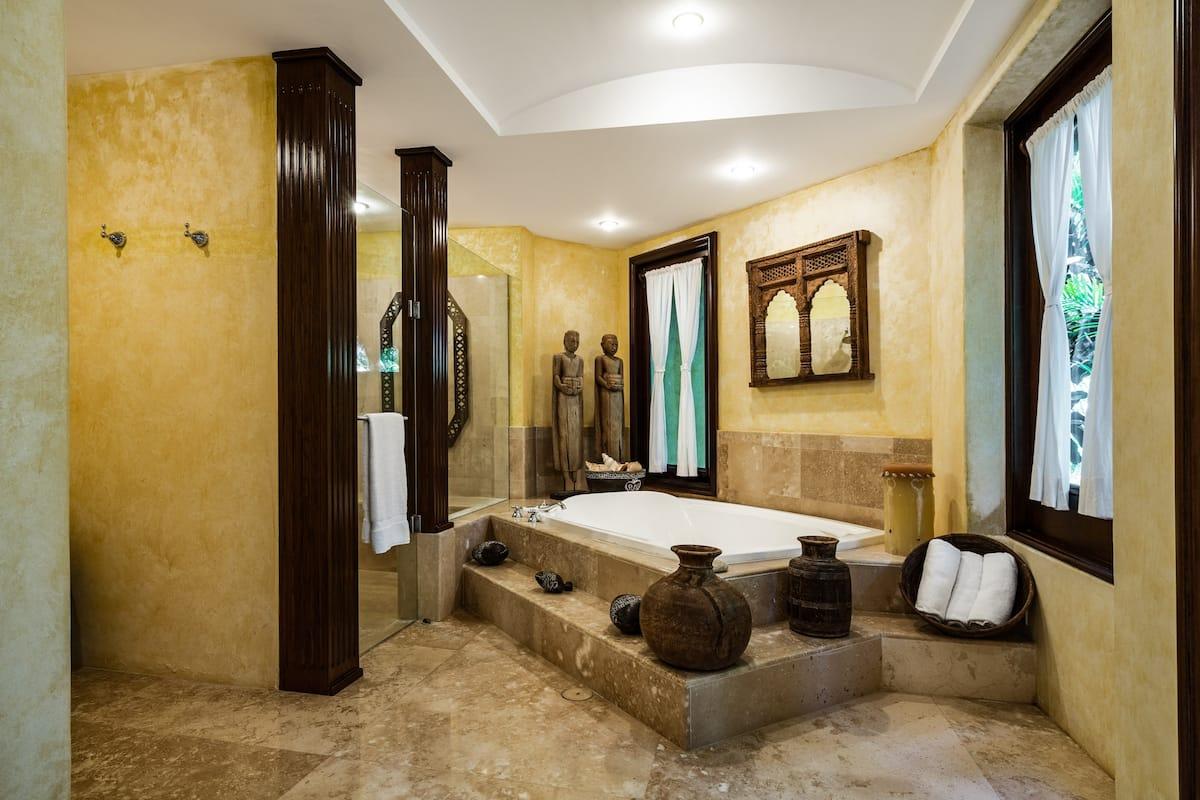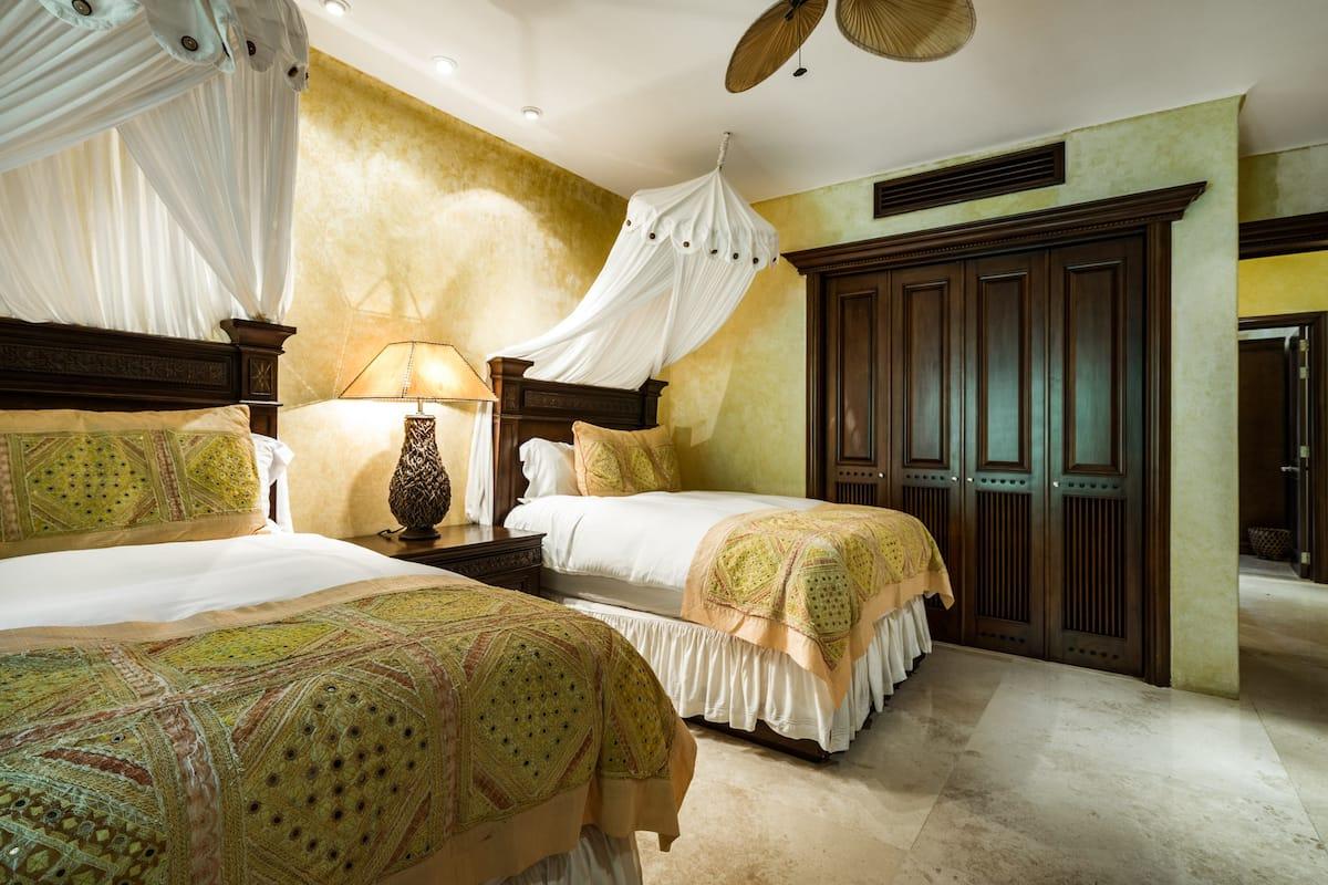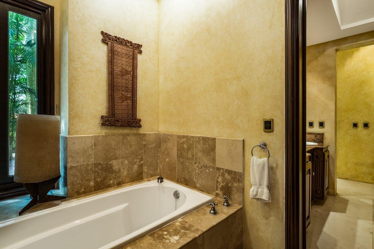 - Bedroom 4: King bed, en suite bathroom with stand along shower & bathtub, walk-in closet, TV, AC, desk, safe, ceiling fan, private terrace, access to pool area, ocean view