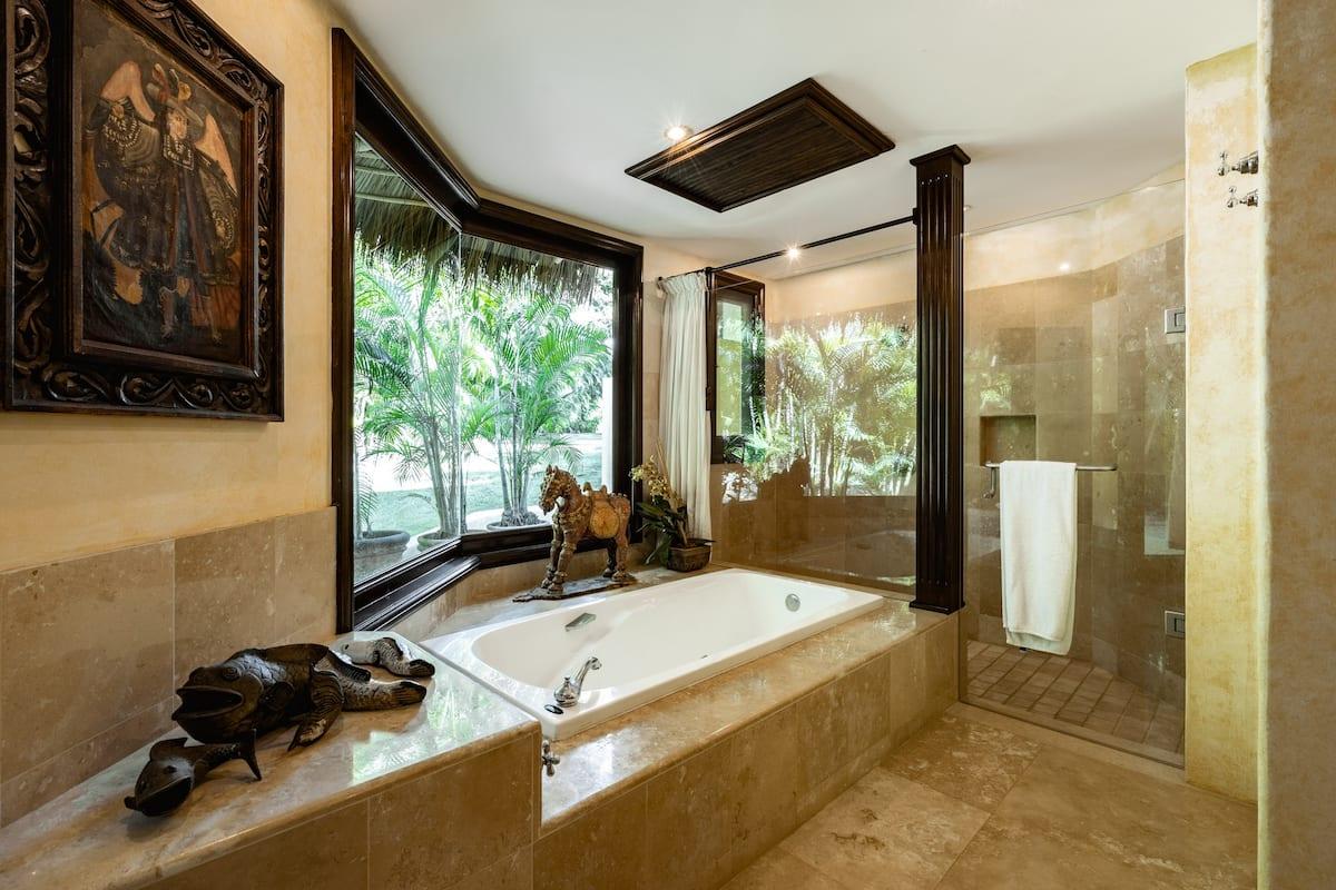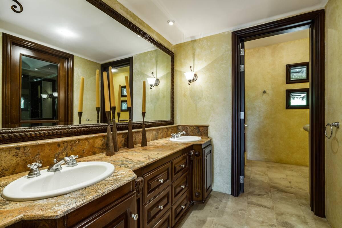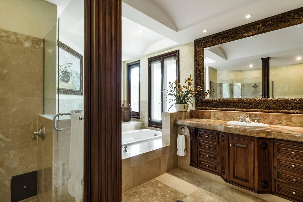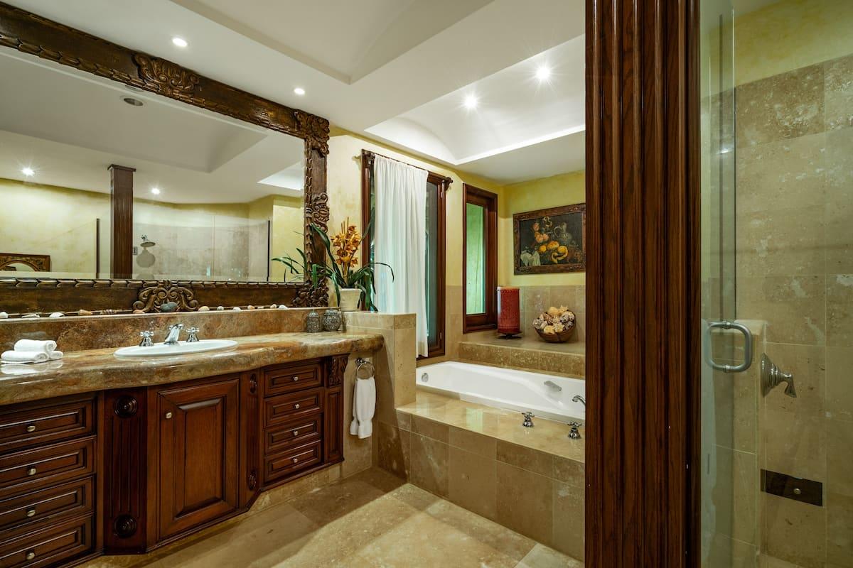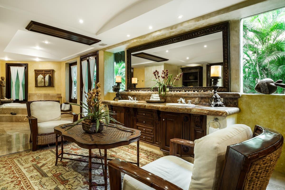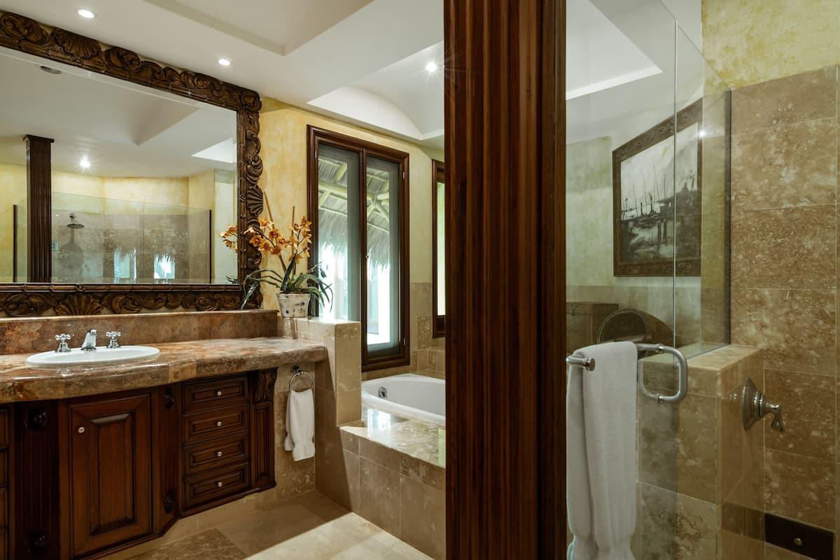 - Bedroom 7: King bed, en suite bathroom with stand alone shower & bathtub, dual vanity, TV, safe, AC, ceiling fan, access to pool area