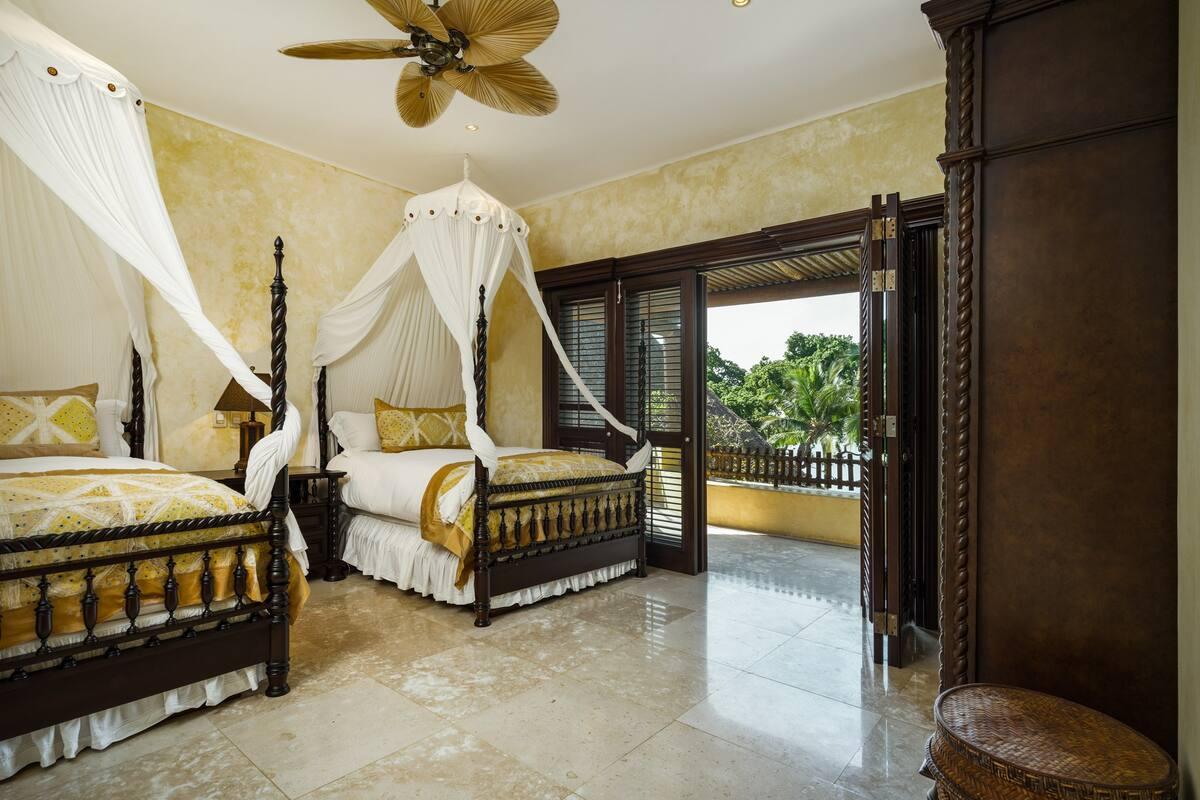 - Bedroom 6: Two double beds, en suite bathroom with stand alone shower & bathtub, TV, AC, safe, ceiling fan, private balcony with seating, ocean view