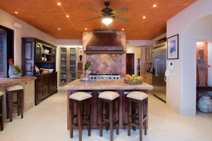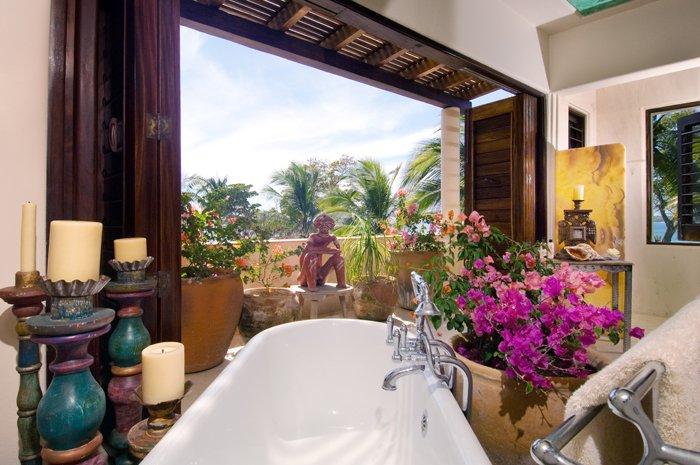 Upon entry to Casa Christina, the grand private garden estate features over 100 magestically towering palms, plus hundreds of smaller palms, trees, flora, and fauna. Facing south overlooking Banderas Bay, this Punta Mita villa's main 2 story house has its principal rooms, the living room, dining room, kitchen, outdoor eating/BBQ area, office, and media room, all on the main level facing a garden. Clever landscaping provides maximum privacy. A stand alone guest bungalow, Casita Christina, contains 2 separate bedroom suites, each with 2 queen beds, private terraces, and ensuite baths. The bungalow also comes with its own fully equipped kitchenette and covered casual dining area. Off the pool deck is a Mexican marble terrace connecting two bungalows, each containing a master bedroom suite with pergola covered terraces, separated by a garden and fountain.