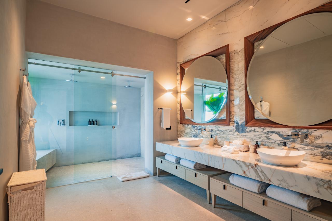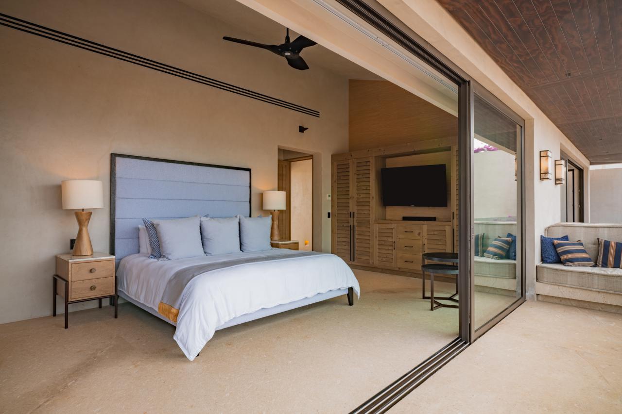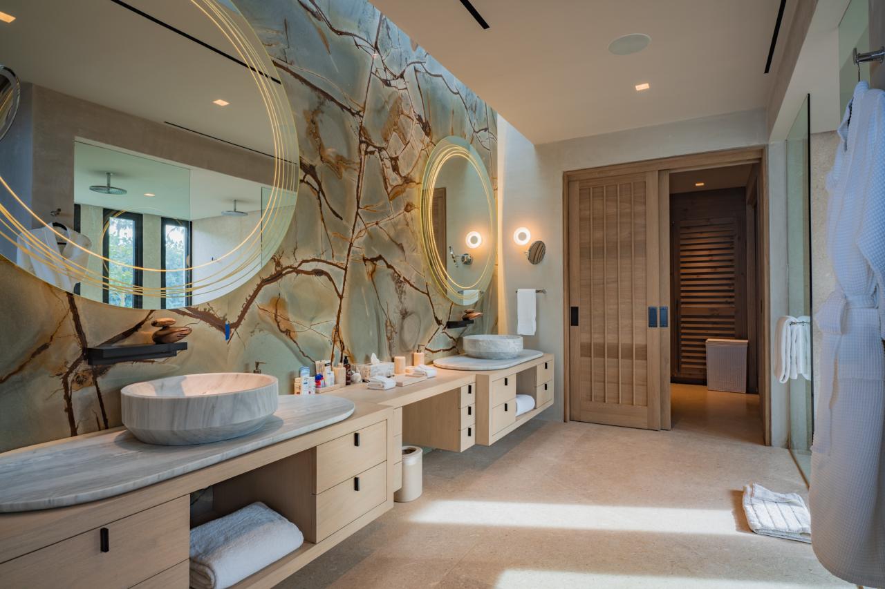 Primary Bedroom: King bed, ensuite bathroom with dual vanities, two showers and bathtub, TV, private terrace, ocean view