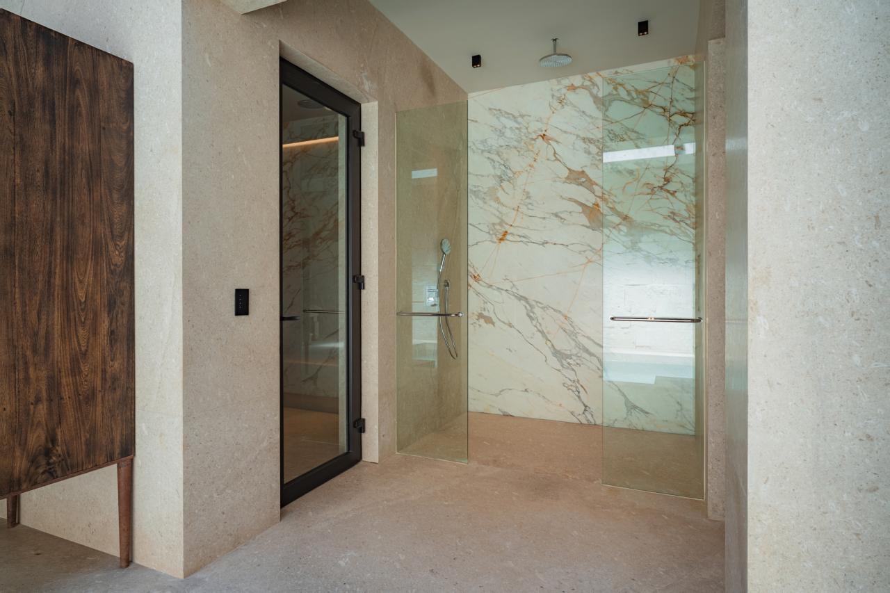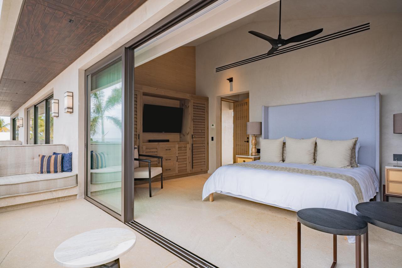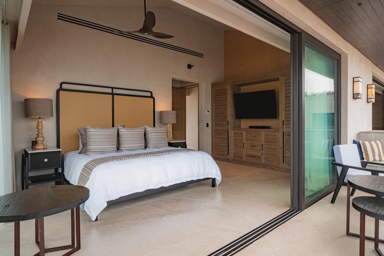 Primary Bedroom: King bed, ensuite bathroom with dual vanities, two showers and bathtub, TV, private terrace, ocean view