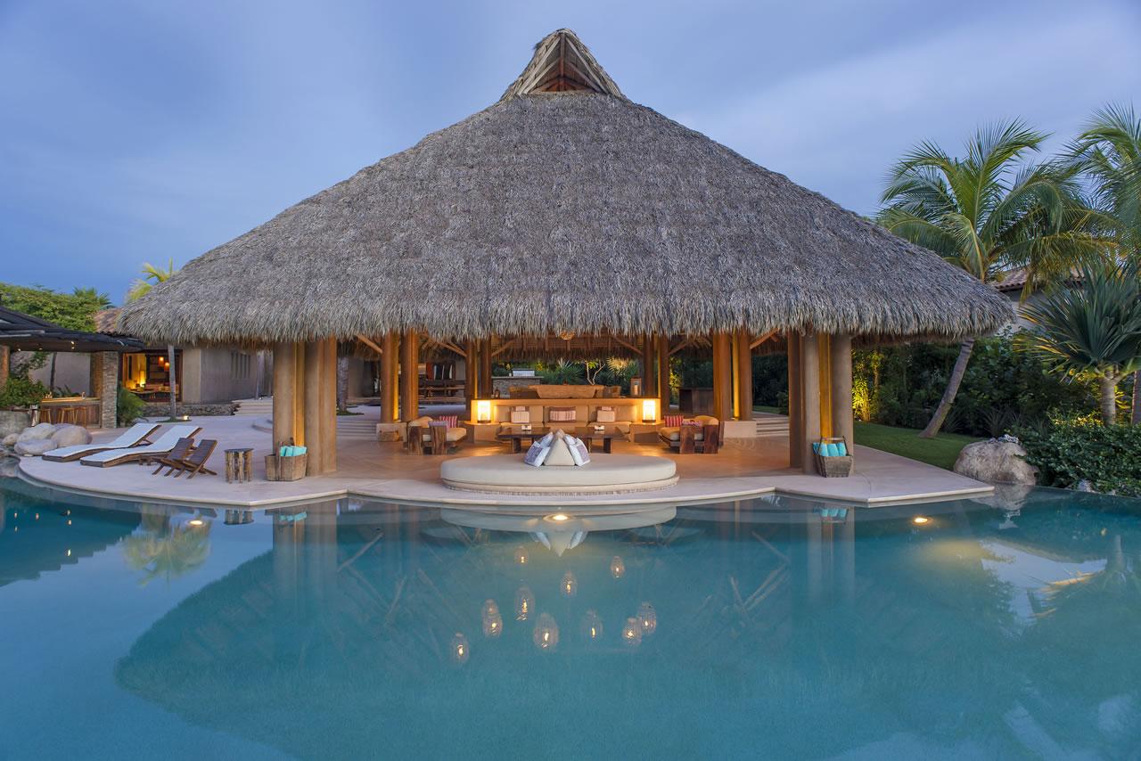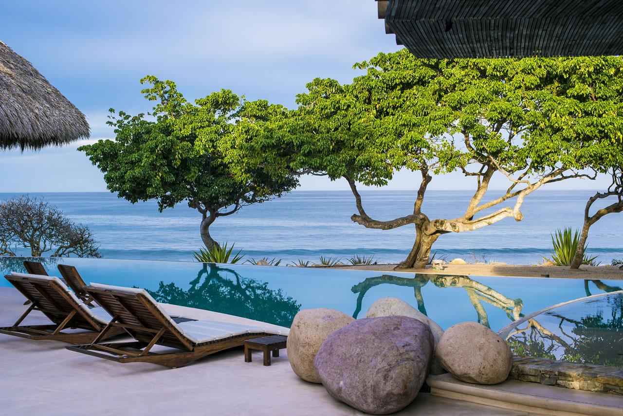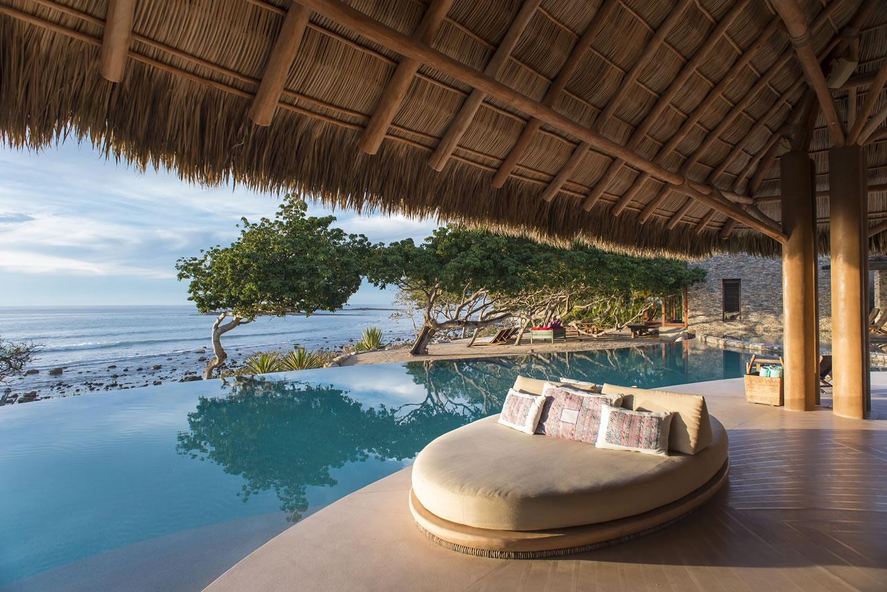 From world-renowned architects Manolo Mestre and Juan Collignon comes Casa Majani. Their holistic approach to architecture pays homage to the natural while incorporating the contemporary. Native simplicity and warm colors complement modern conveniences resulting in an alluring and meditative experience. Every room is designed with intention. A network of pathways through expansive reflection pools connects each unique structure, creating the illusion this remarkable casa is suspended over the powerful Pacific. Situated on the northern most tip of the Punta Mita peninsula, Casa Majani is located in La Punta Estates within the gates of the Punta Mita resort. Two connecting pools blend with sea and sky, enhancing undisturbed views of the blue horizon with over 150 ft. of infinity edge. The smaller of the pools encircles the Keili Suite, offering a dynamic and diverse swimming experience. Nearby, the whimsical bar extending unsupported from the wall is a restored vintage surf board. A ground level fire pit for intimate gatherings and fantastic sunsets is situated on the sand beach terrace. Come see why visitors fall in love with this Punta Mita villa!