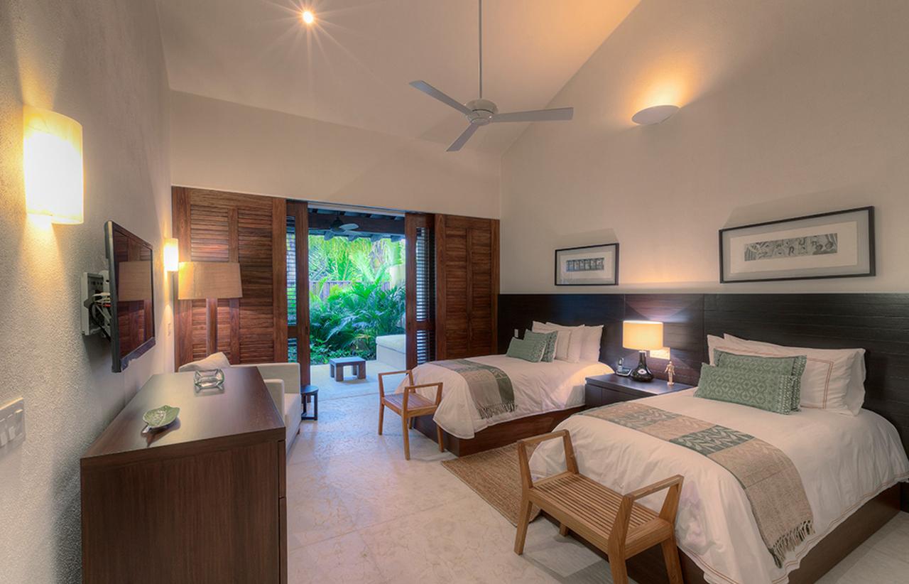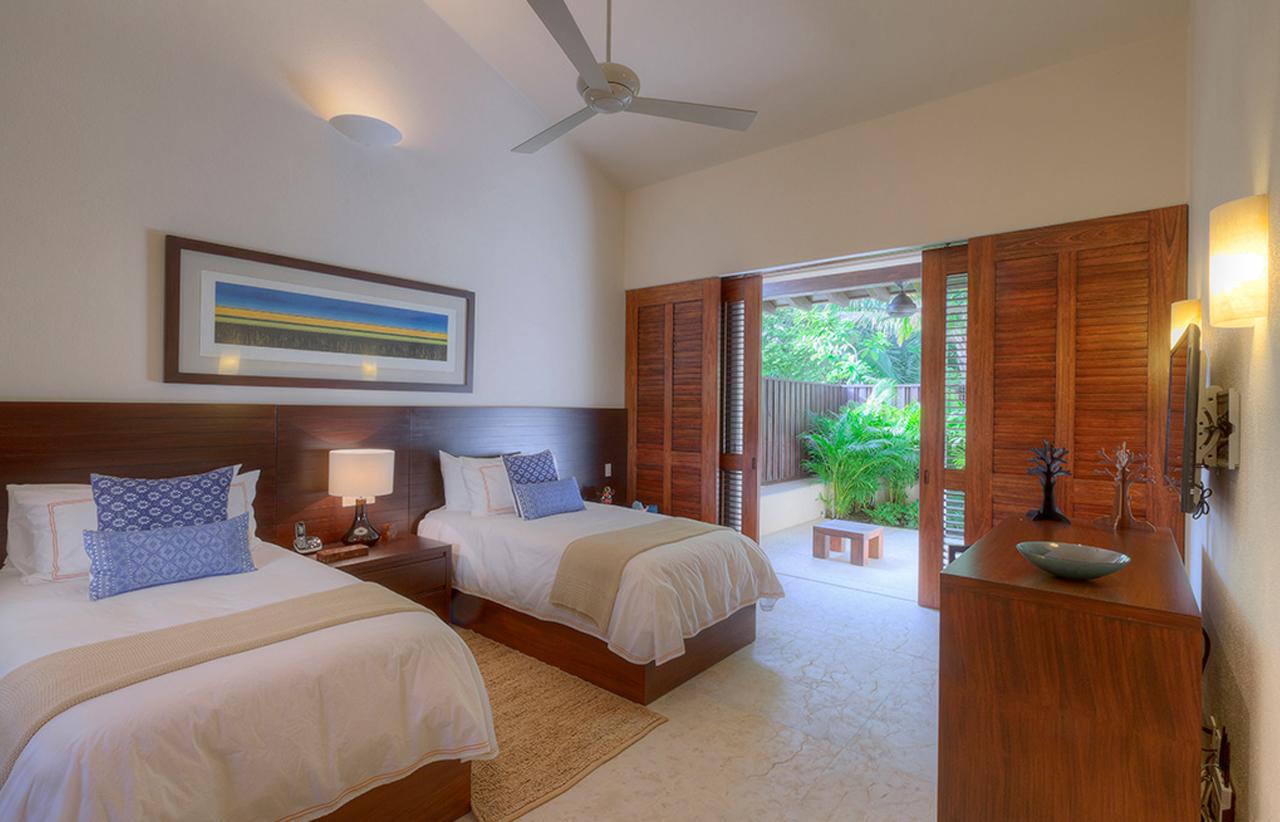 Bedroom 5: Two single beds, garden view, AC, fan, patio, TV, safe, iPod dock, DVD/CD player