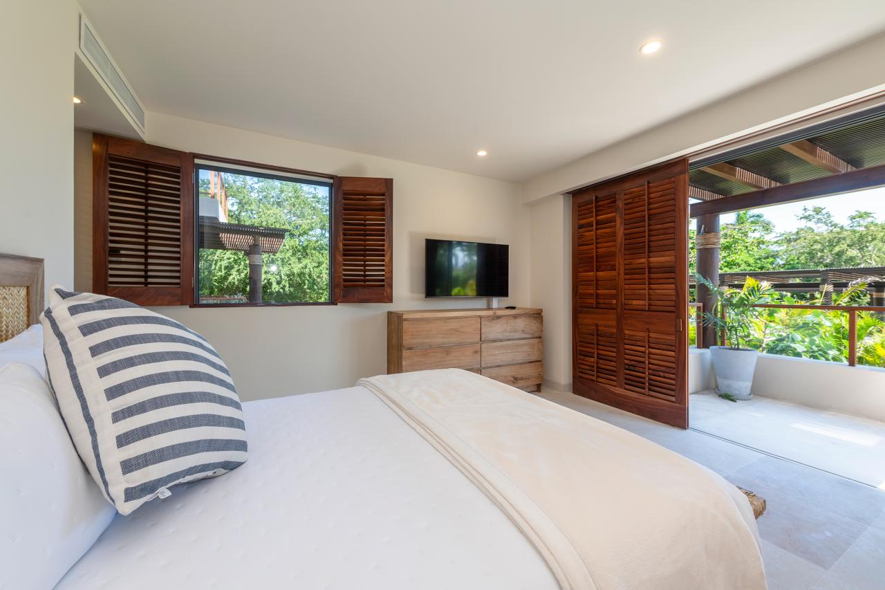 Primary Bedroom: This room is equipped with a king-sized bed, a TV, access to a private patio, and an ensuite bathroom.