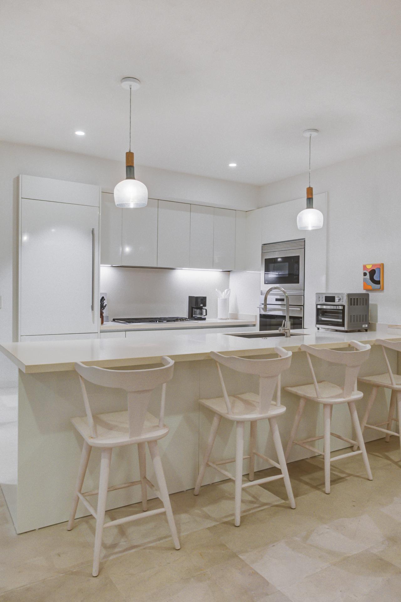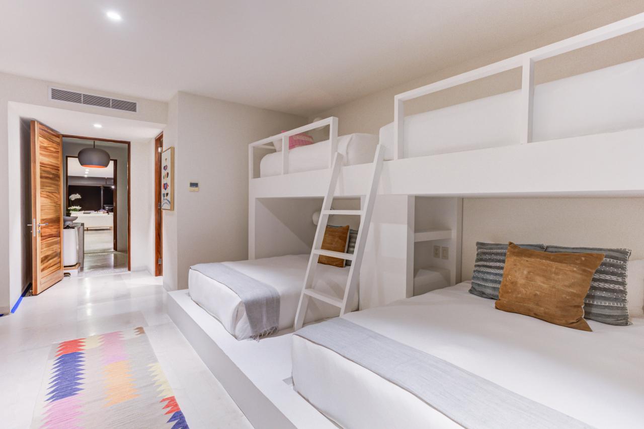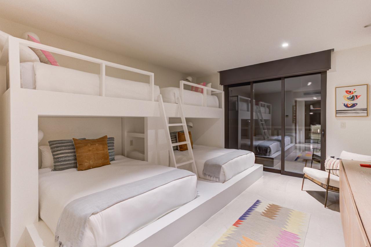 The sleeping quarters are thoughtfully designed for both relaxation and versatility. The main bedroom is adorned with a luxurious king-size bed and TV, along with an en-suite bathroom that includes twin vanities, a bathtub, and both indoor and outdoor showers. A shared patio extends from the room, offering breathtaking views of the beach, ocean, and fairway. The second bedroom also features a plush king-size bed and a spa-like en-suite with a standalone tub, separate rain shower, and oversized vanity. Ideal for families or groups, the third bedroom includes two queen beds and two single bunk beds, as well as an en-suite bathroom with a rain shower, large vanity, and bathtub—providing both comfort and flexibility for guests of all ages.