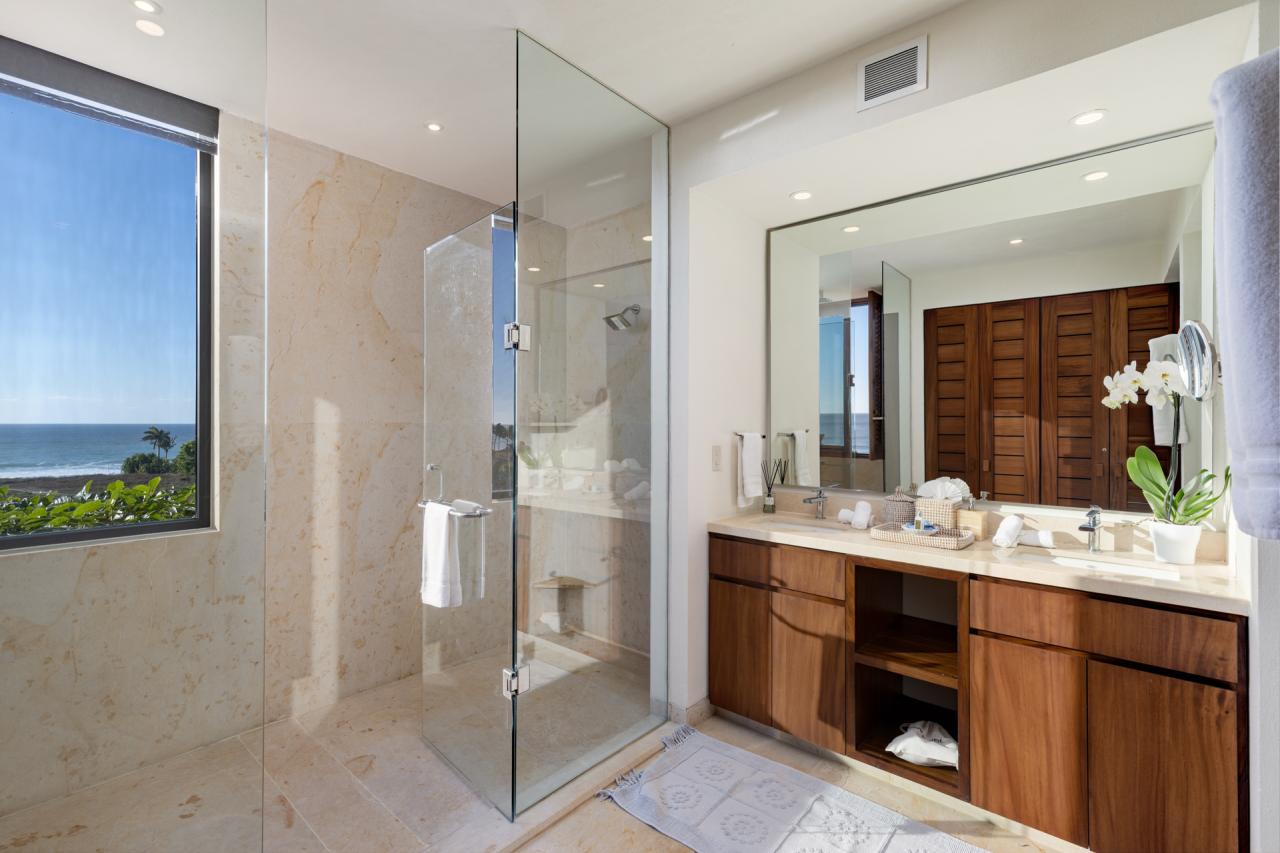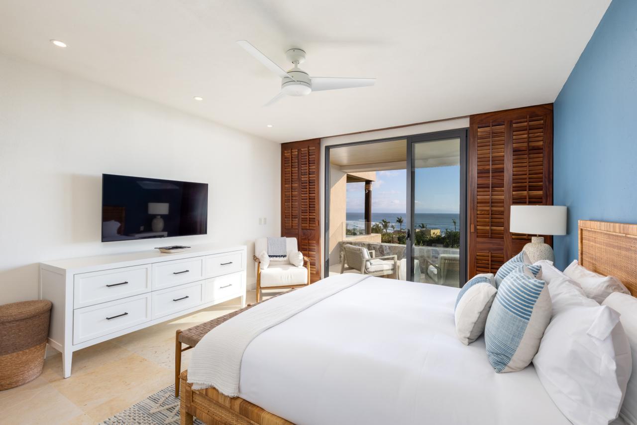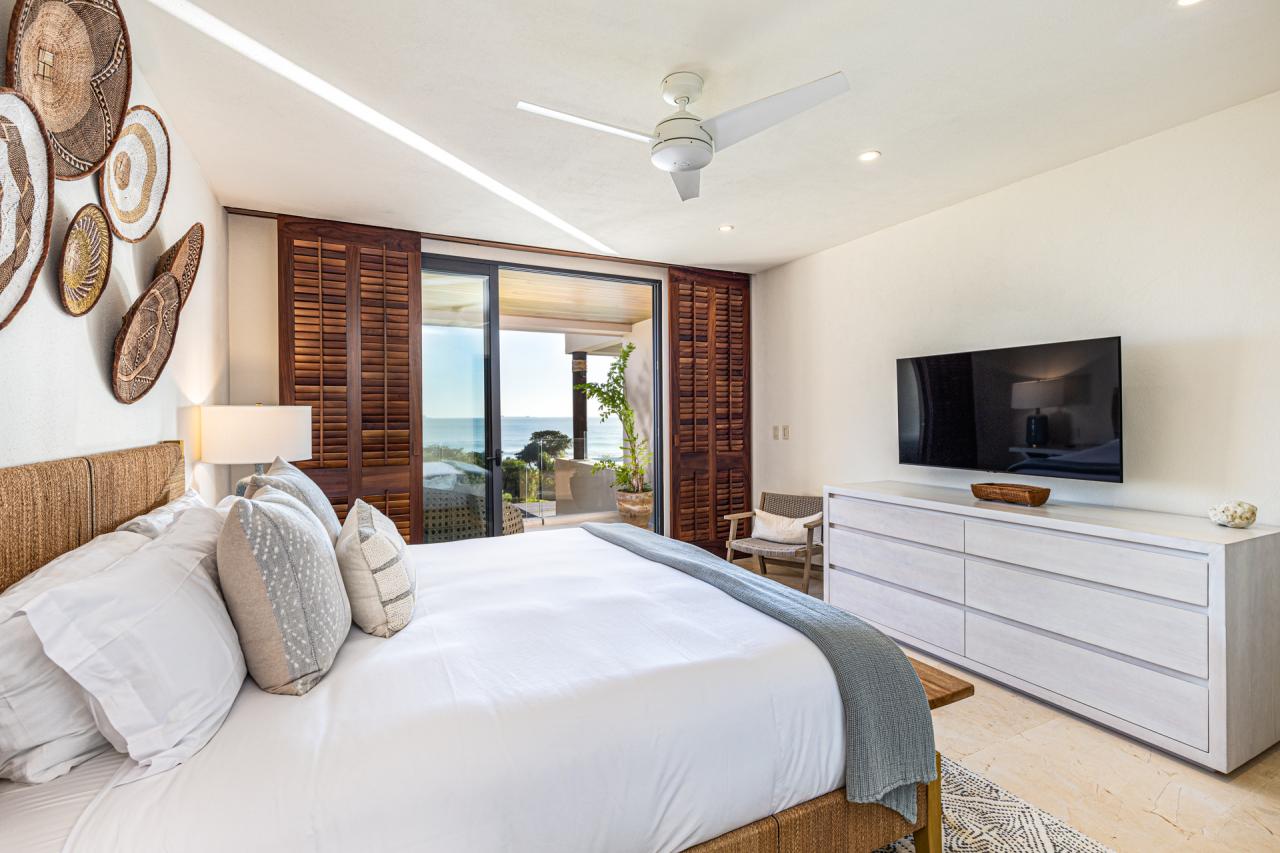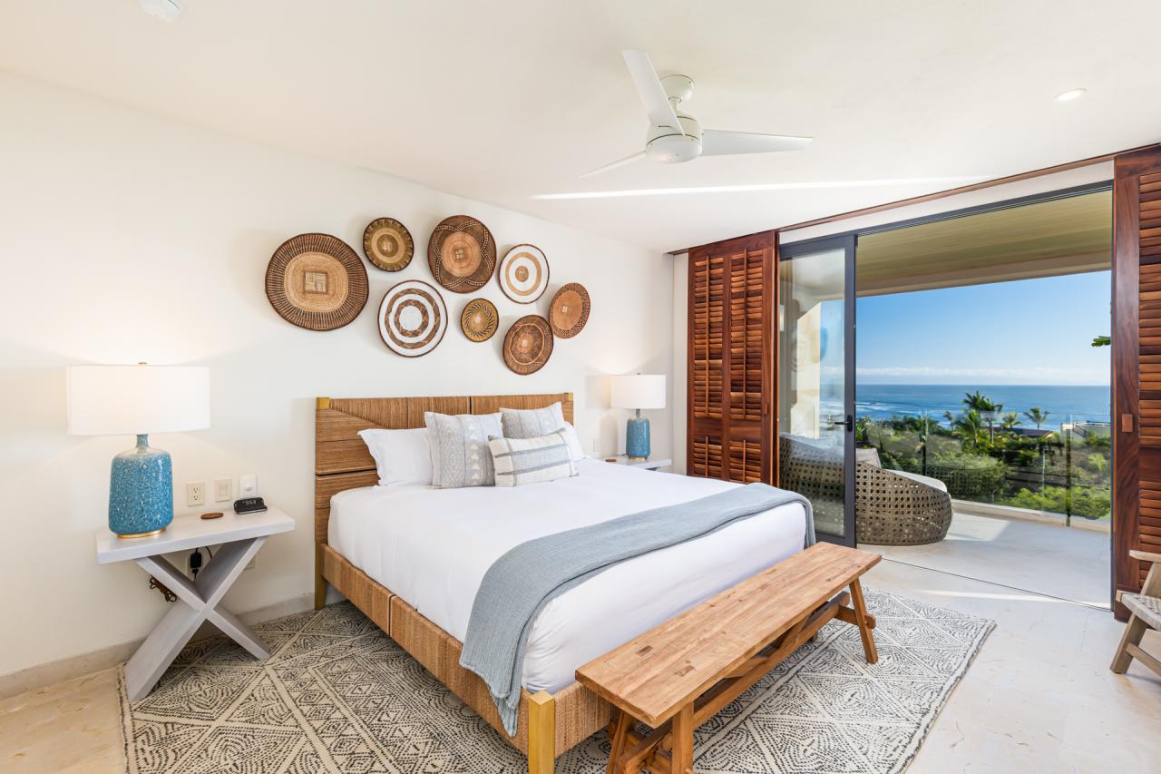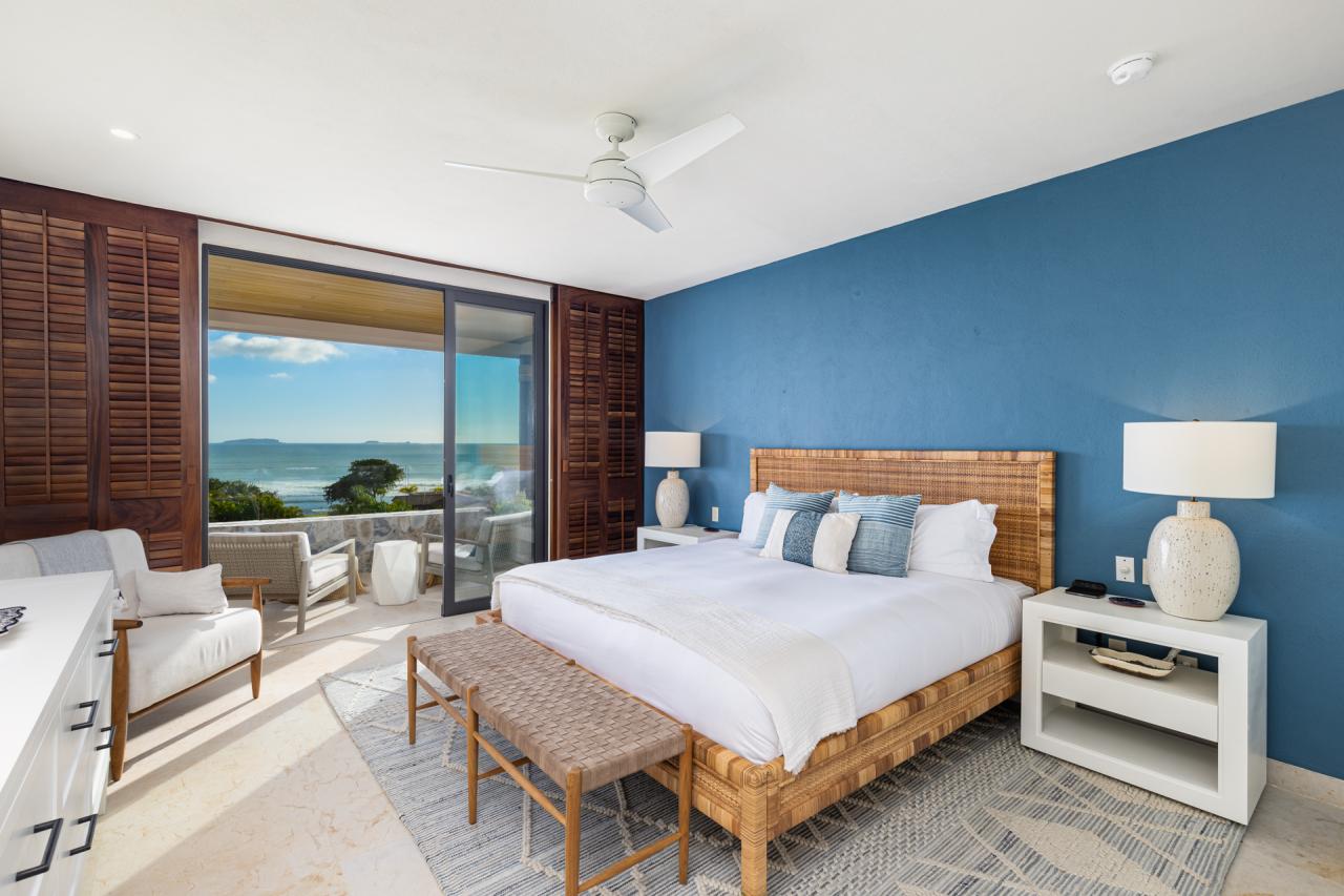 Primary Bedroom: King-size bed. Opens to a front balcony that offers an ocean view. Ensuite bathroom equipped with dual vanities and a shower.