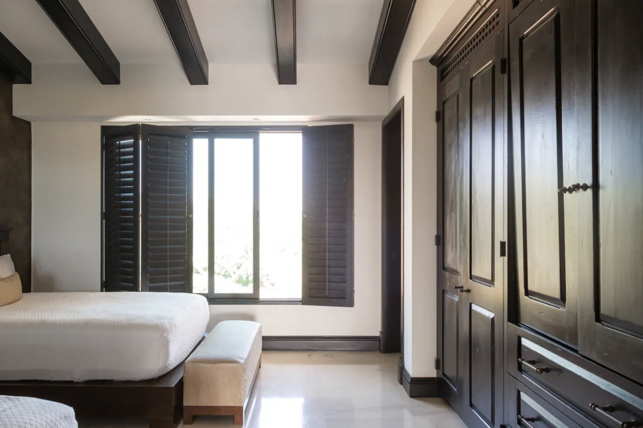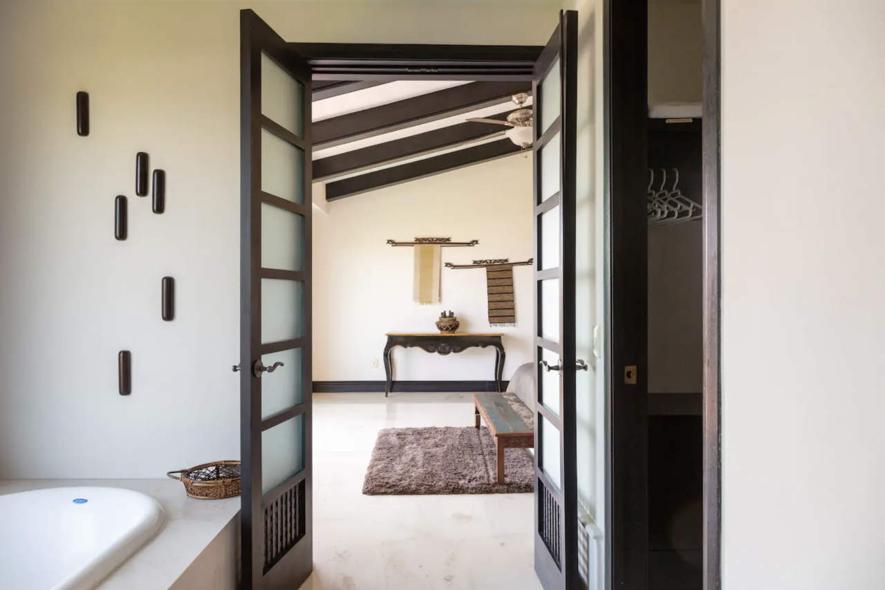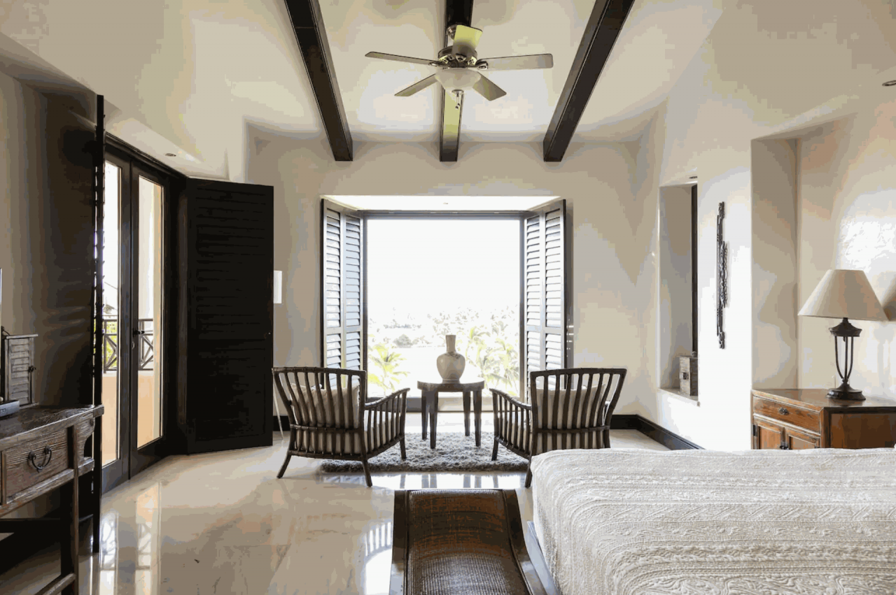 Primary Bedroom 1: This bedroom has a king-sized bed, a jacuzzi, ceiling fan, air-conditioning, a TV, and an ensuite bathroom.