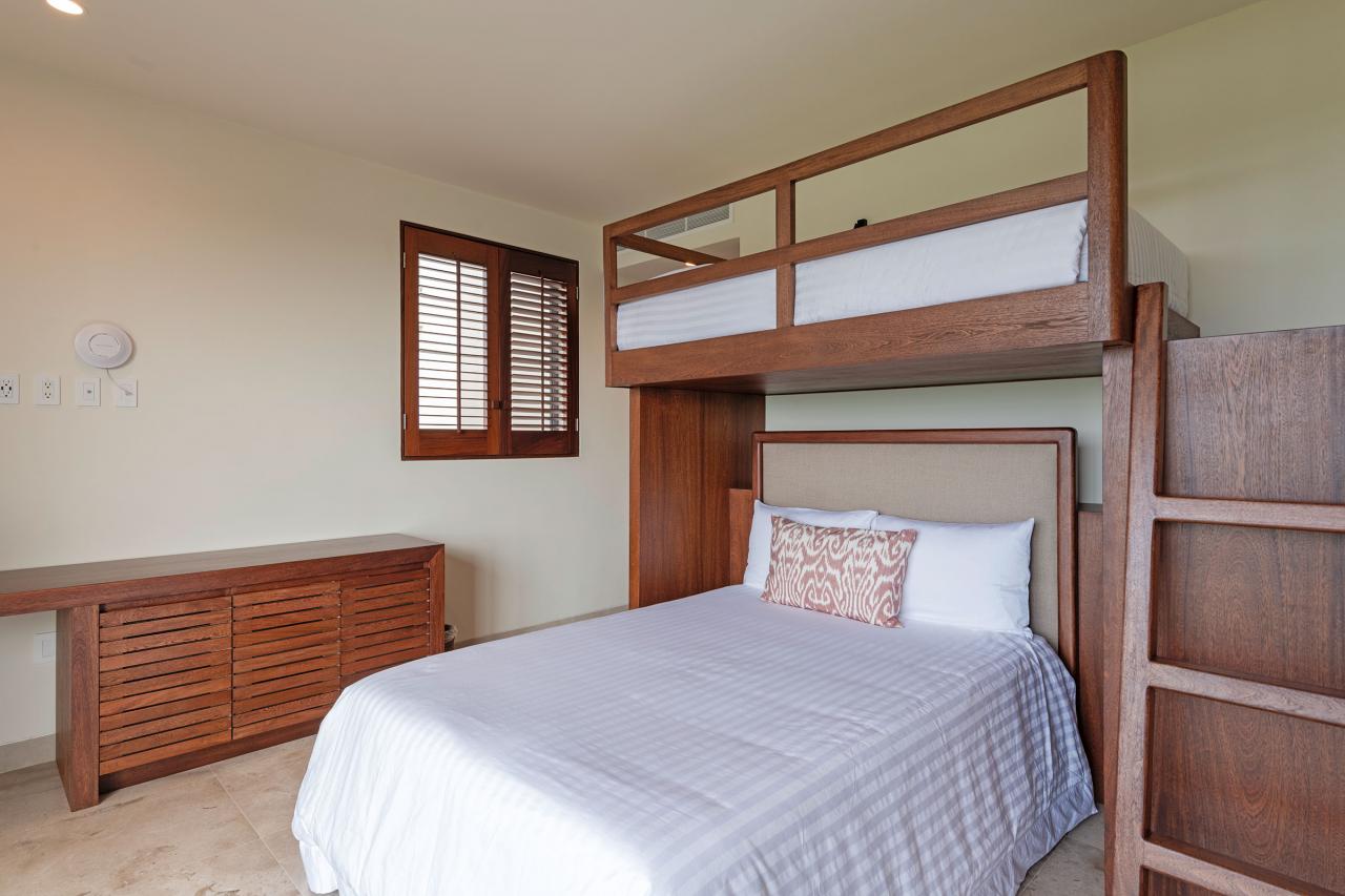 Bedroom 4: This room is equipped with two bunk beds, one double-sized bed and one twin-sized bed, a golf and lake balcony view, and an ensuite bathroom.