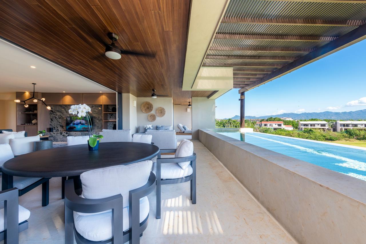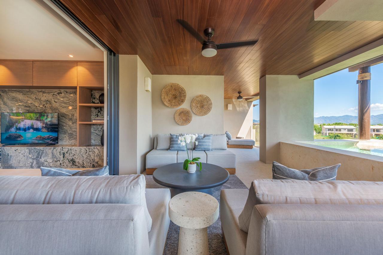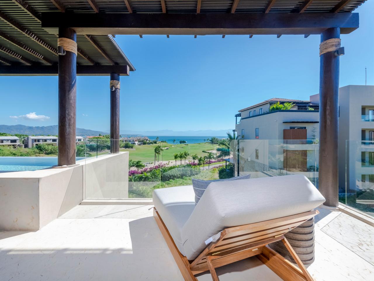 Condo Sardan is a lovely three-bedroom Punta Mita villa at Tau. This luxury resort rental is positioned between the mesmerizing ocean and the prestigious golf course, providing an unparalleled panorama view from every angle. Condo Sardan is a luxurious retreat with seamless integration of indoor and outdoor spaces that invite breathtaking views inside. The sleek designs extend throughout the condo, from the modern kitchen featuring top-tier appliances to the serene bedrooms designed for relaxation.
