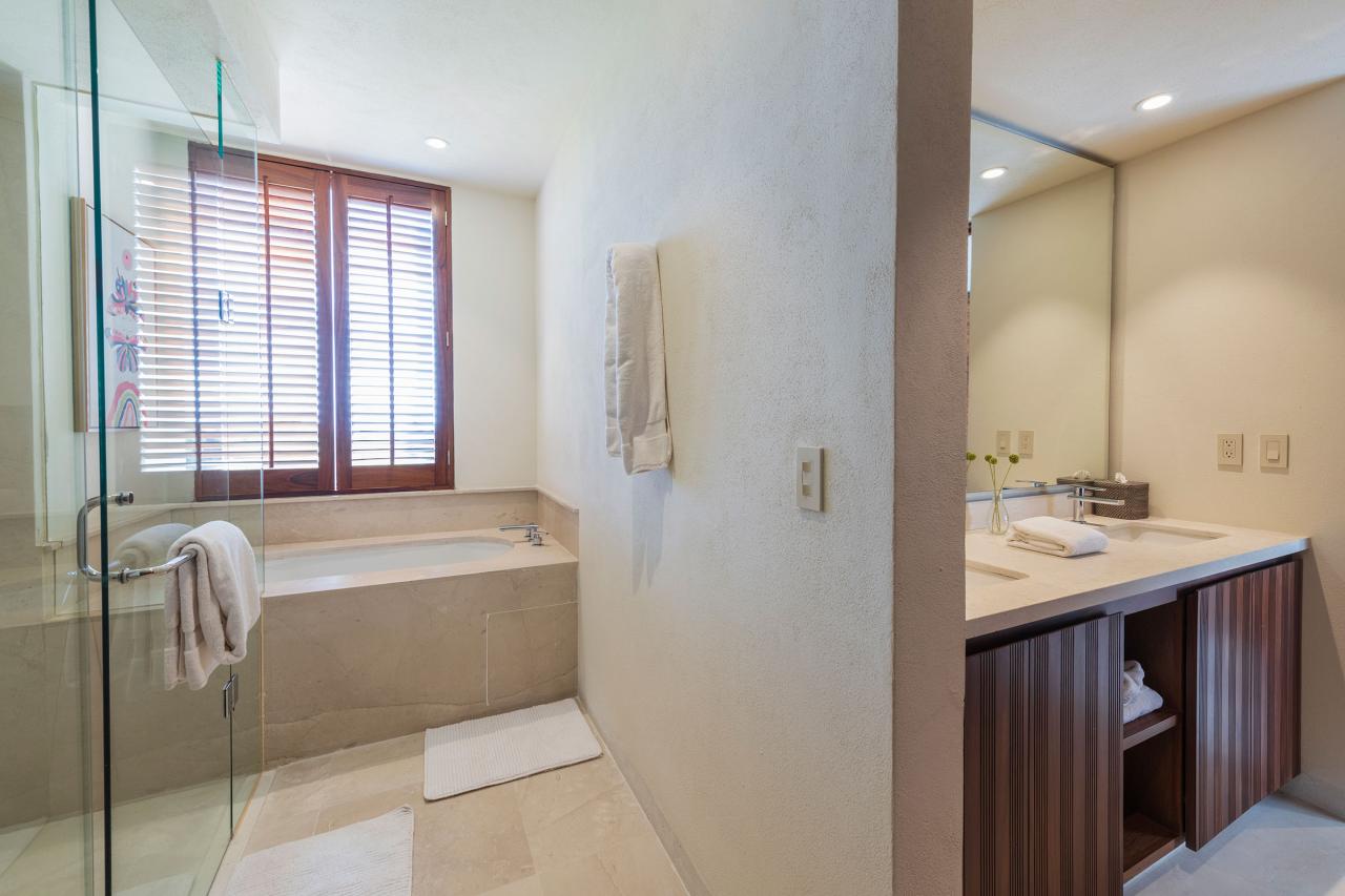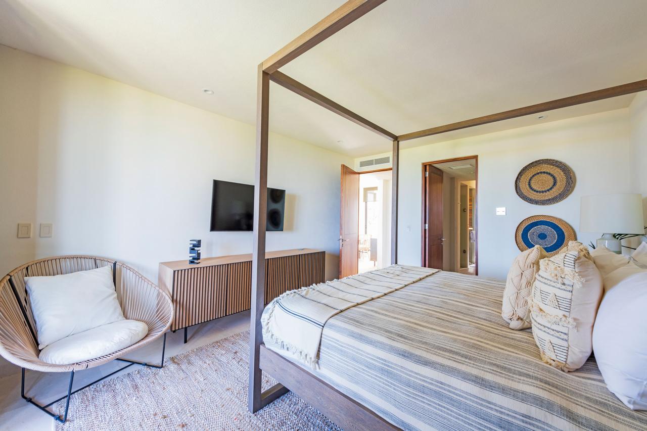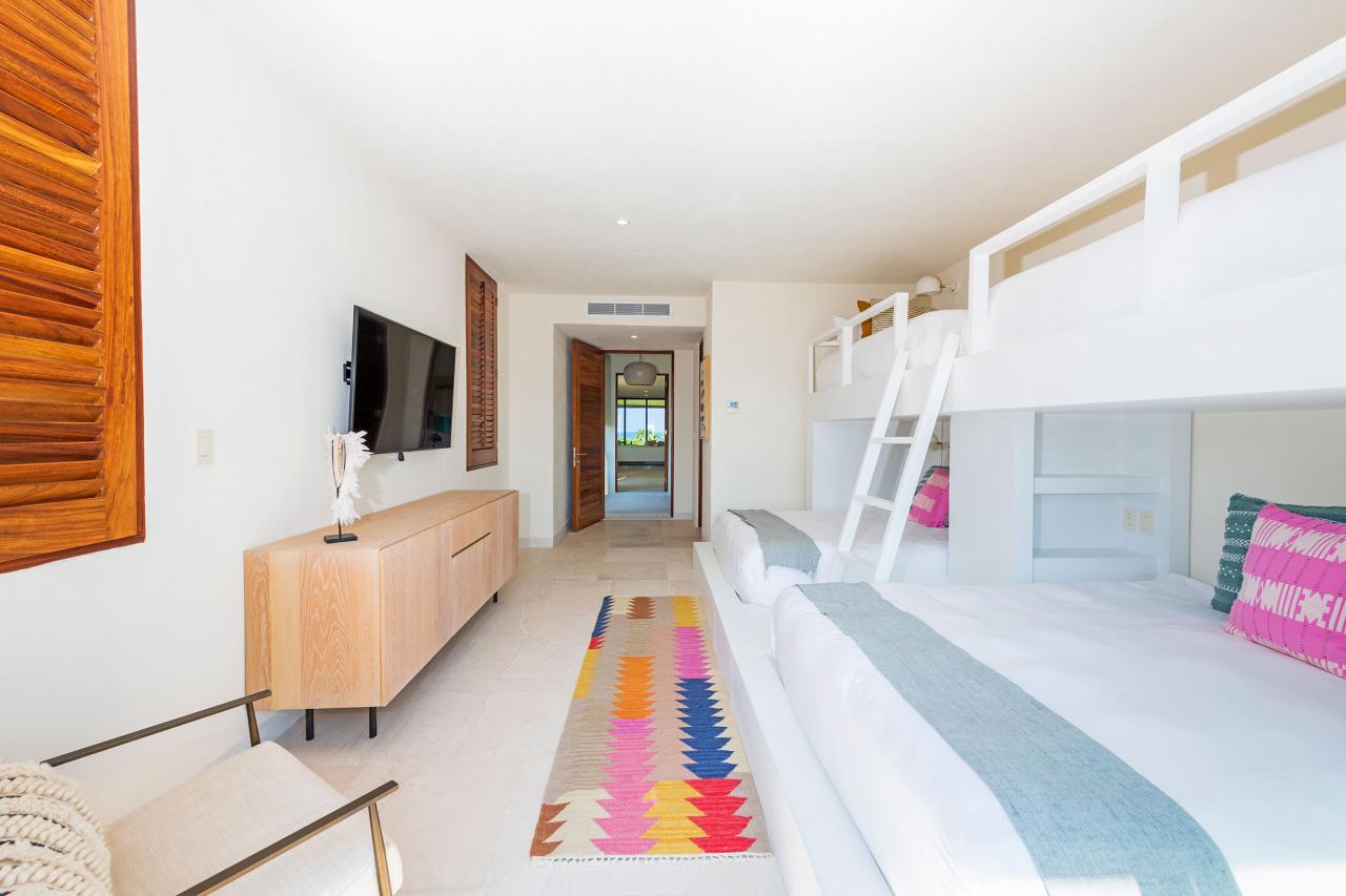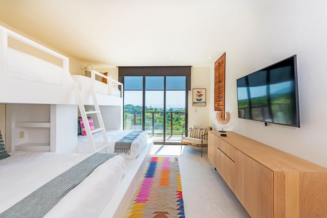 Condo Teresa is located inside the gates of Punta Mita, next to the 18th hole of the Jack Nicklaus Signature Bahía Golf Course. Condo Teresa has incredible outside features such as an outdoor shower and a private terrace with a plunge pool to make your stay as luxurious as possible. When inside Condo Teresa, there are two gorgeous master bedrooms, both with ensuite and amazing ocean views. The third bedroom has two queen beds and a set of bunk beds, with a great view of the ocean.