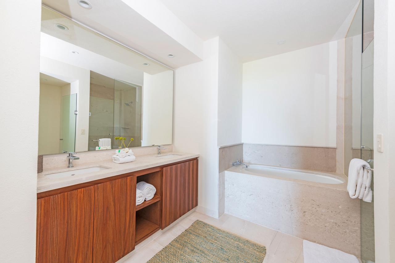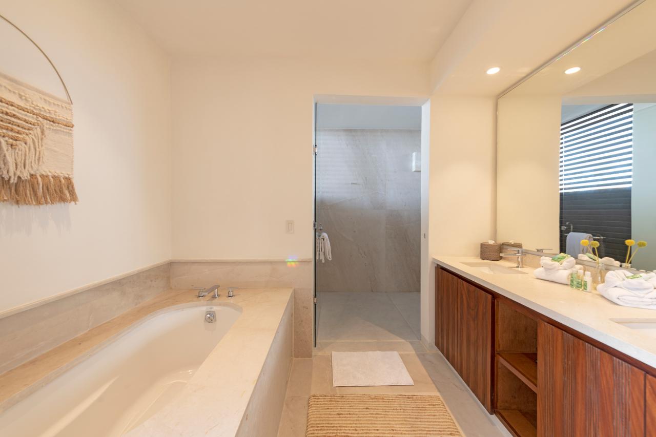 Primary Bedroom 2: King-size bed. Ensuite bathroom equipped with an oversized vanity, a free-standing tub, and a separate rain shower. Access to a fully furnished private balcony with views of the ocean.