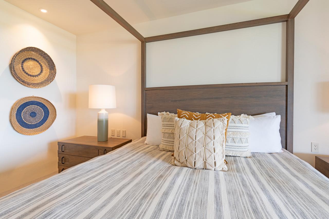 Bedroom 3: 2 queen-size beds and 2 single beds that are bunked. Access to a bathroom equipped with an oversized vanity, a tub, and a rain shower. Access to a patio that offers views of the shared lawn and ocean.
