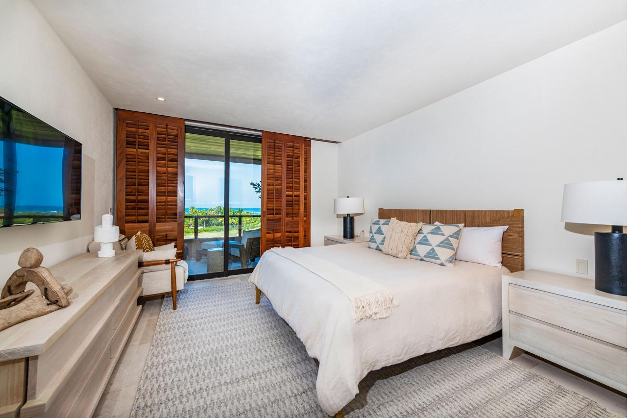 Primary Bedroom 1: King-size bed. TV. Ensuite bathroom equipped with twin vanities, a bathtub, indoor and outdoor showers. Access to a shared patio with views of the beach, ocean, and fairway.