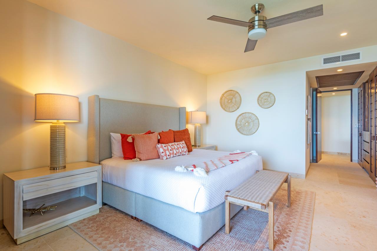 Primary Bedroom: The Primary Bedroom is equipped with a king-sized bed, a TV, access to a shared patio with spectacular views, a ceiling fan, air conditioning, and a private furnished patio with an ocean view. There is also an ensuite bathroom with a bathtub and shower.