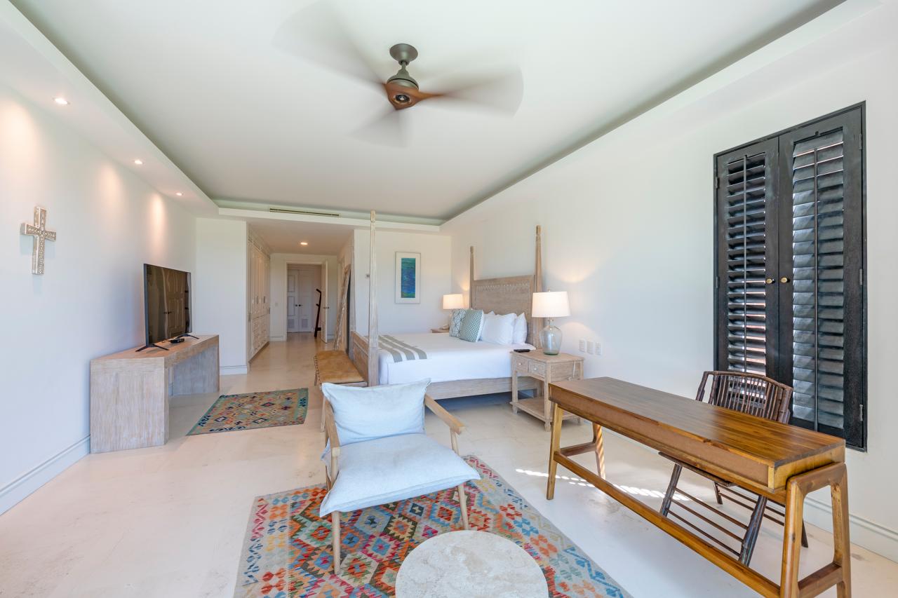 Primary Bedroom: The Primary Bedroom is equipped with a king-sized bed, a TV, a desk, air conditioning, and an ensuite bathroom with a tub and shower.