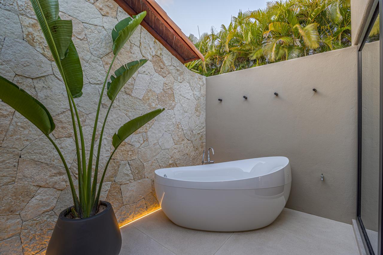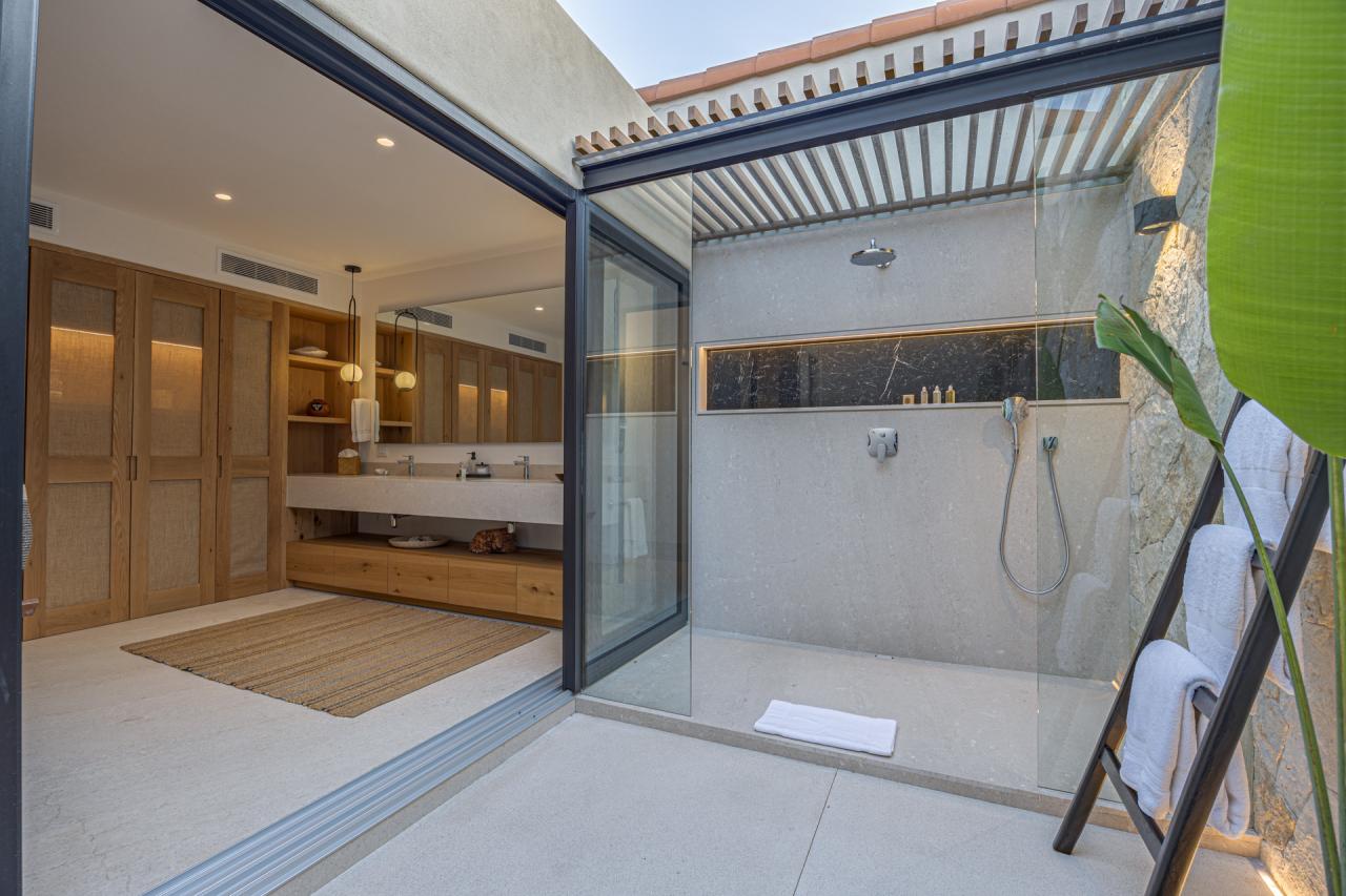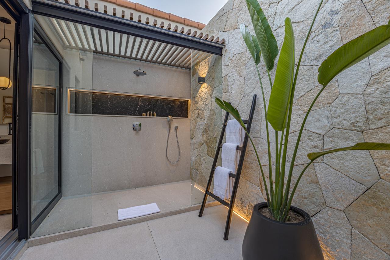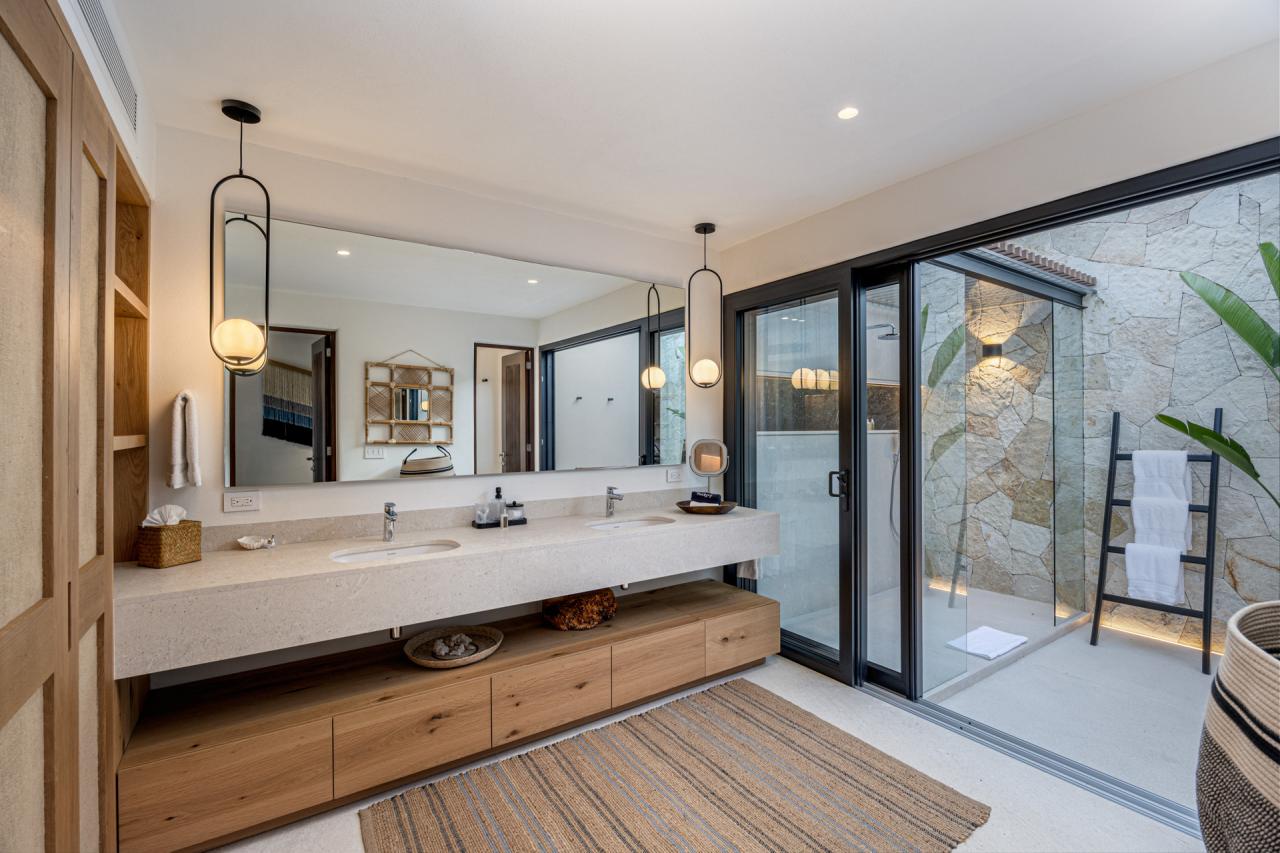 Primary Suite 1 – 1 King bed, workspace, TV, ensuite with outdoor double shower & soaking tub. Ocean view terrace with direct pool access.