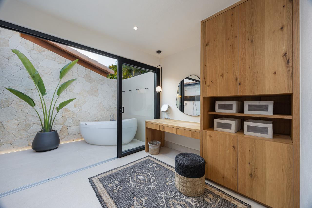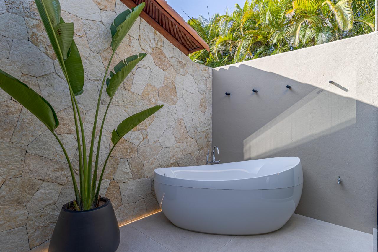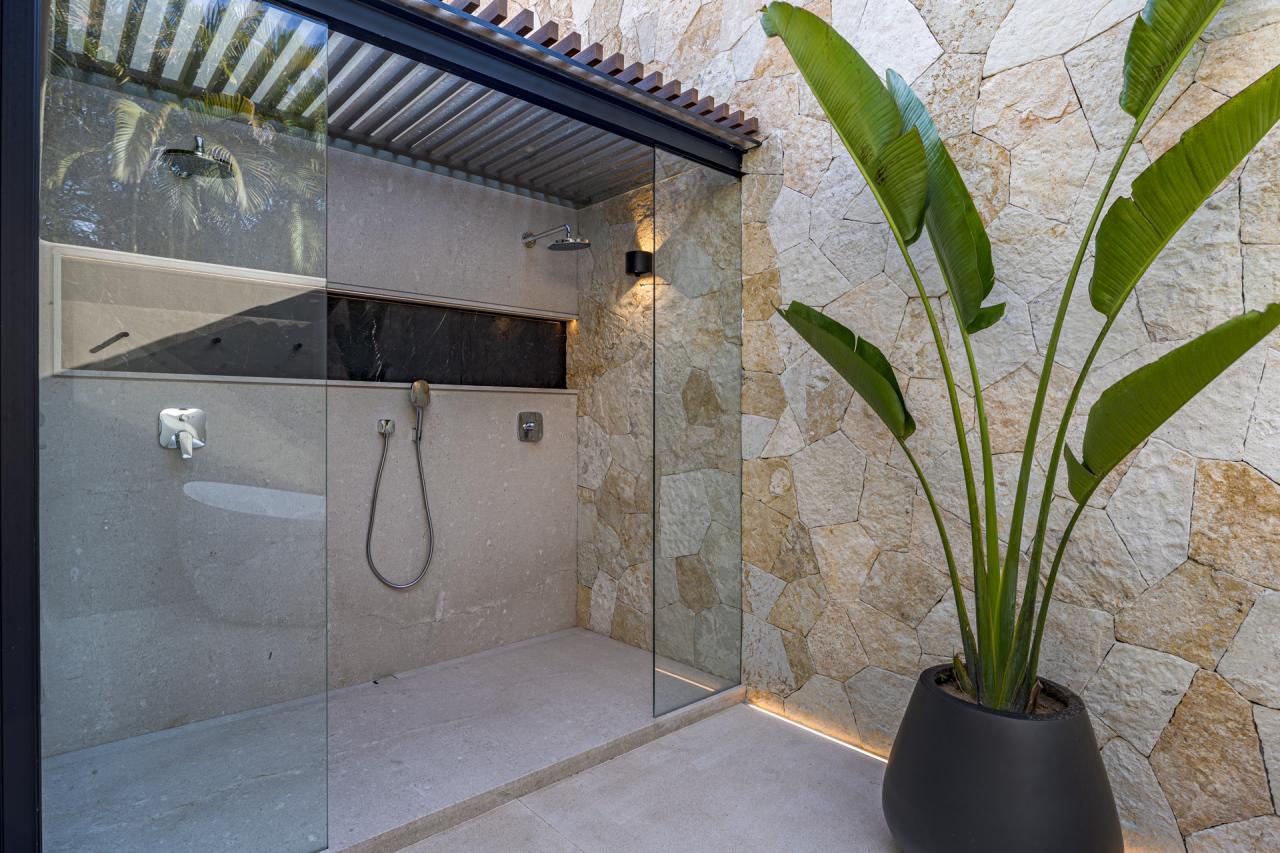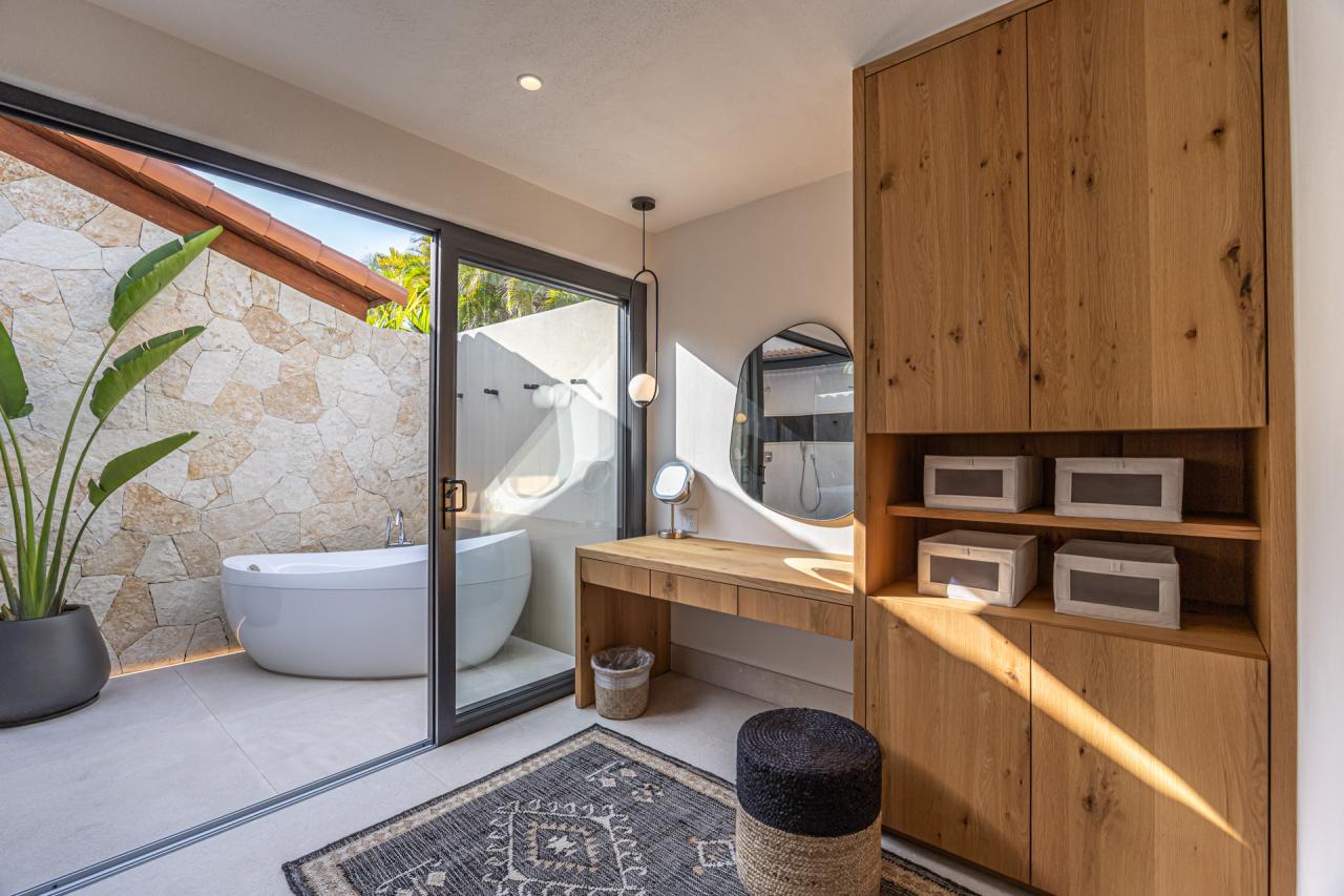 Primary Suite 1 – 1 King bed, workspace, TV, ensuite with outdoor double shower & soaking tub. Ocean view terrace with direct pool access.