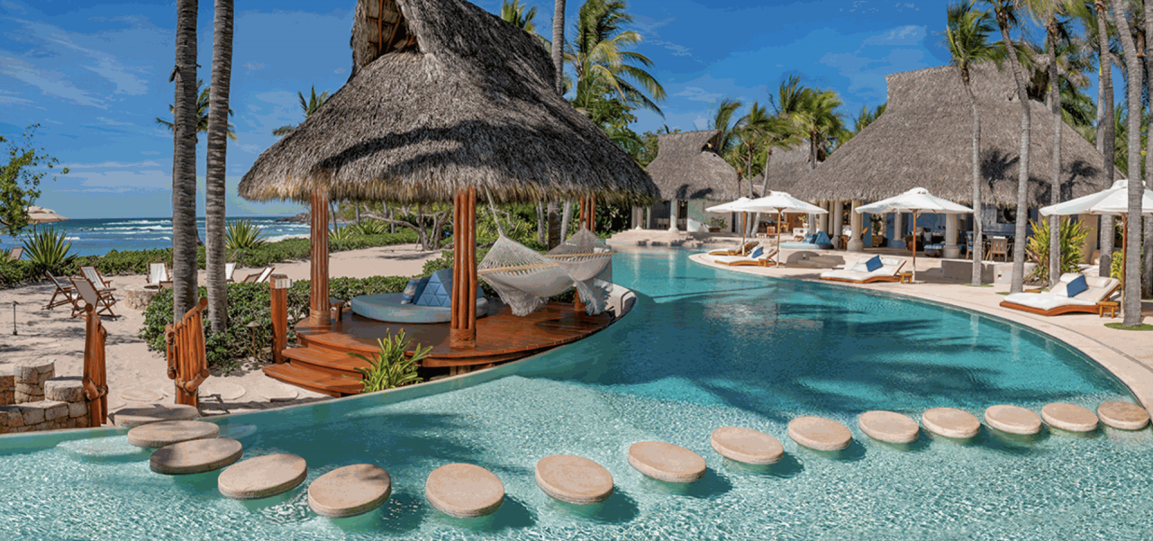 Located in the Punta Mita resort, Palmasola offers guests 25,000 square feet of spacious living, comprised of eleven beautifully designed structures in a village like beachfront setting. A three bedroom master residence, a four bedroom guest residence, and two garden apartments comfortably sleep 18 guests, and is perfect for three or four families traveling together, nine couples, a corporate retreat, or a wedding.