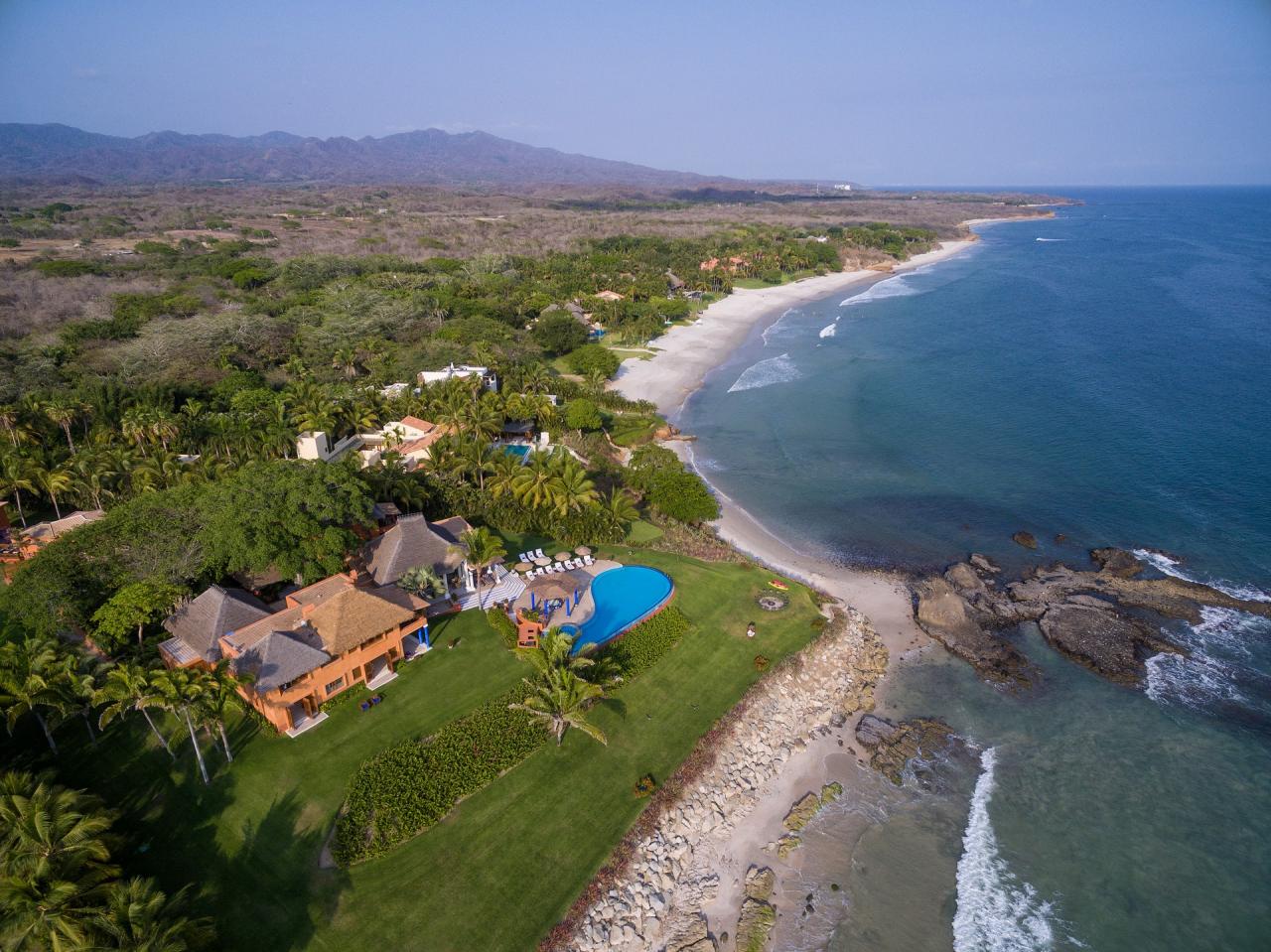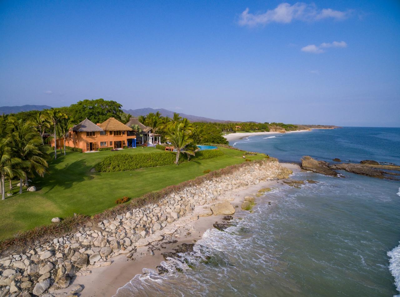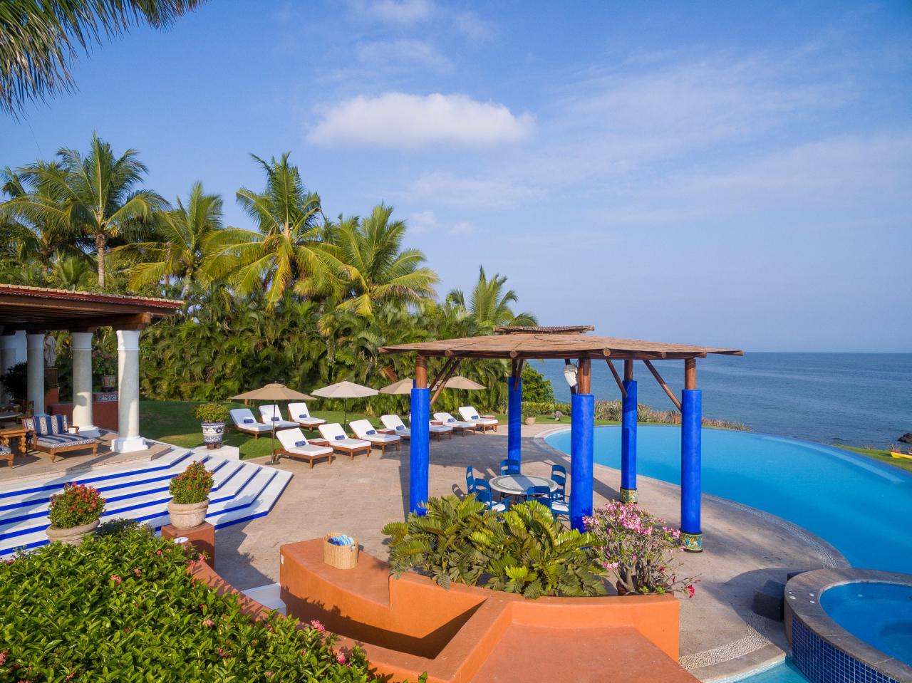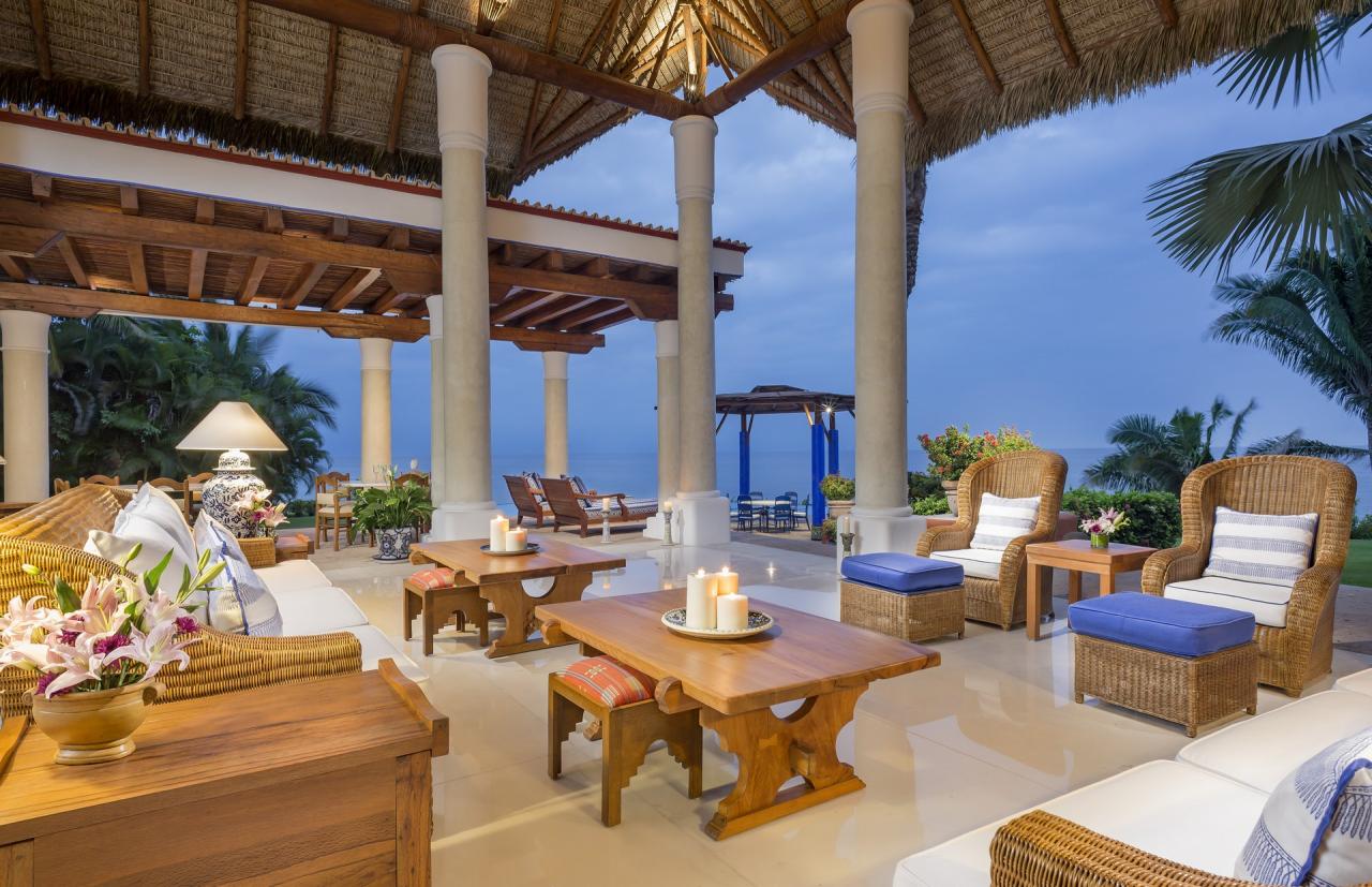 This dramatic 25,000 square foot Palapa-style home was designed by renowned Mexican architect Aldaco. Upon entering the compound known as Rancho 9, you walk into a stunning open space living room with 180 degree ocean views. This Punta Mita villa is perched on a point with beaches to both sides and has the best views of any home in the entire area. From the very large palapa living room you step down to the deck, yard and infinity pool area where there are comfortable lounge chairs lined up overlooking the ocean and pool.
