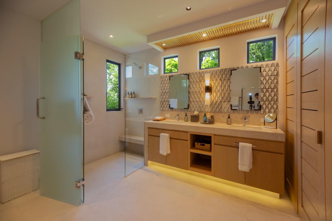 Primary Bedroom: King-sized bed, TV, and an ensuite bathroom with twin vanities and a shower.