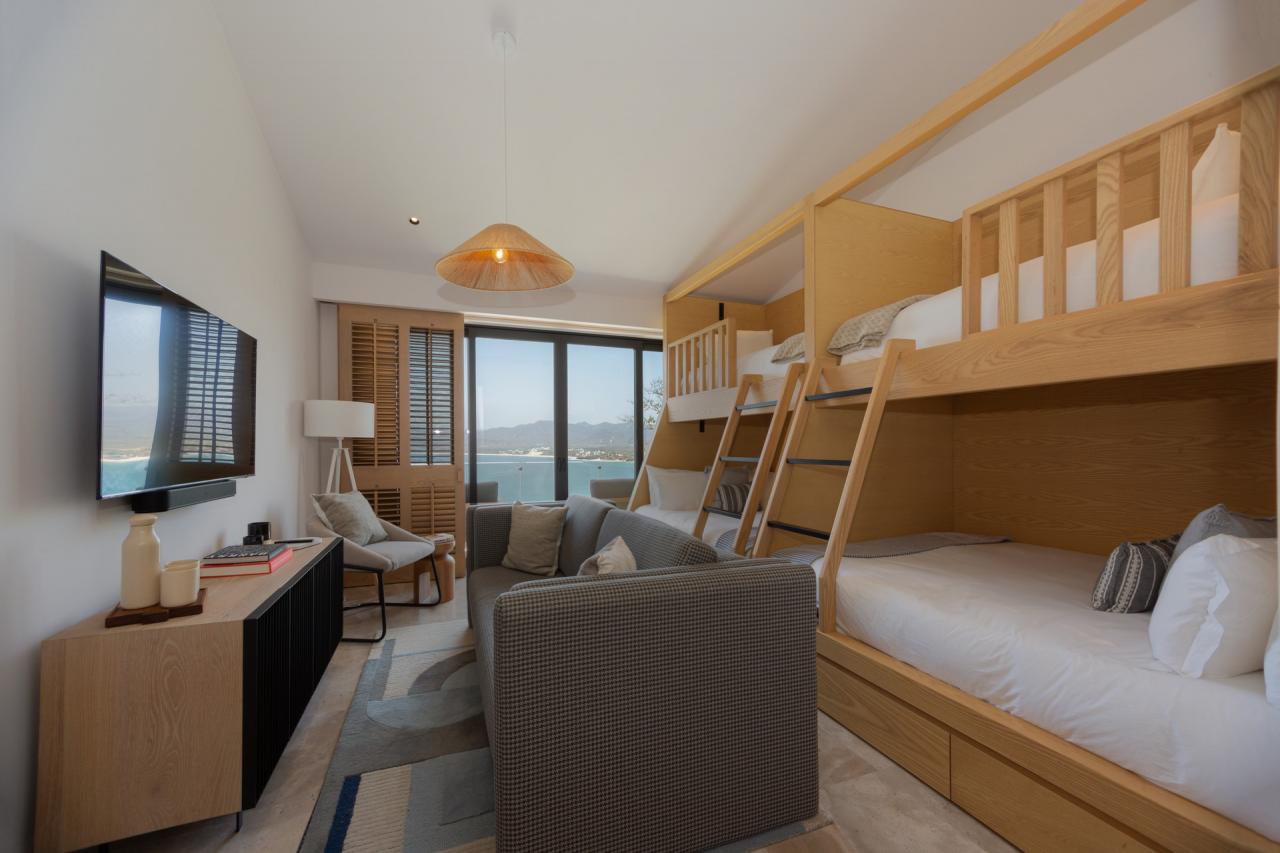 Bedroom 3: Three twin-sized beds, a pull-out couch, and an ensuite bathroom with twin vanities and a shower.
