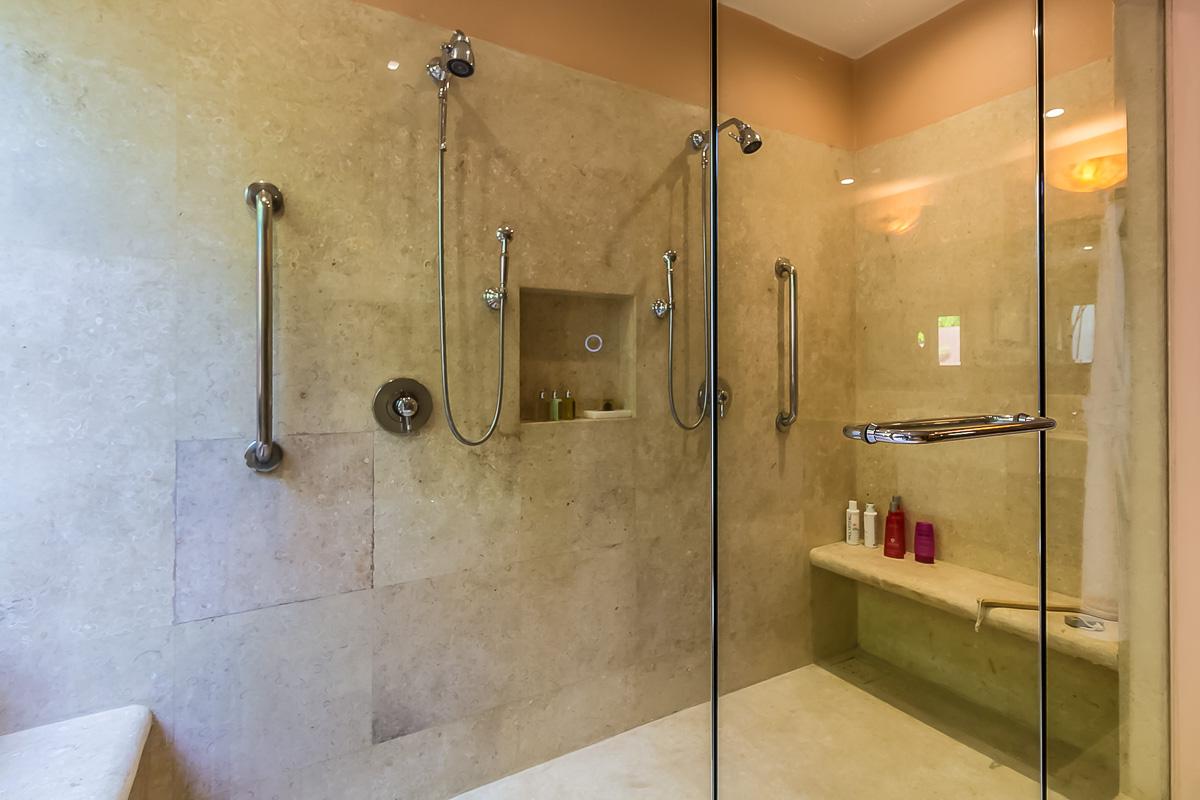 - Bedroom 2: Queen bed, en suite bathroom with shower, dual vanity, TV, AC, ceiling fan, terrace