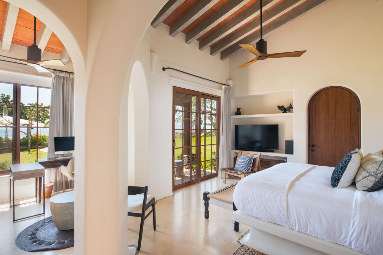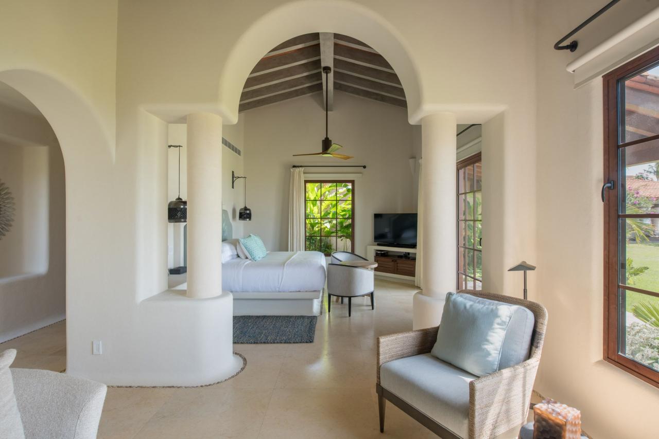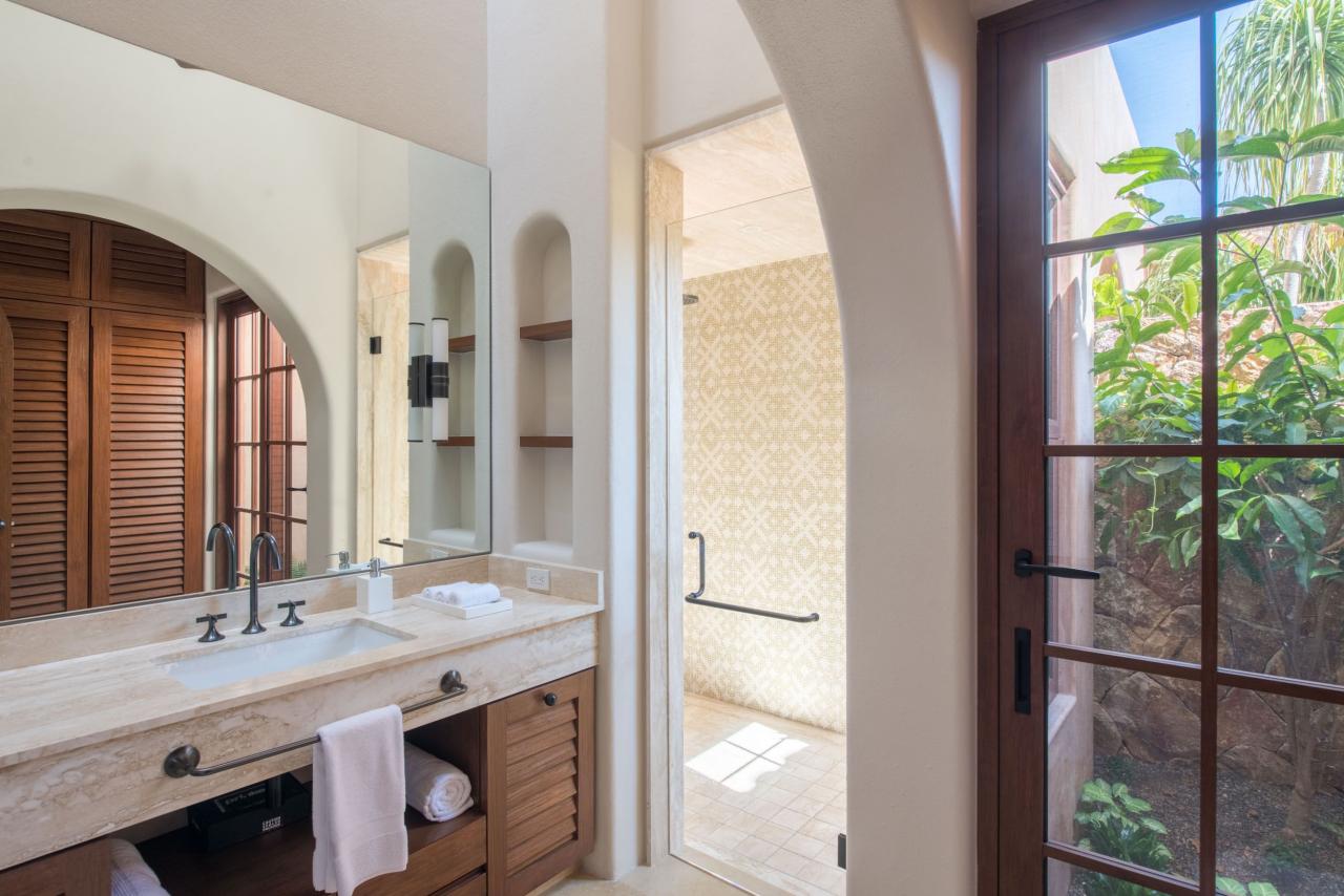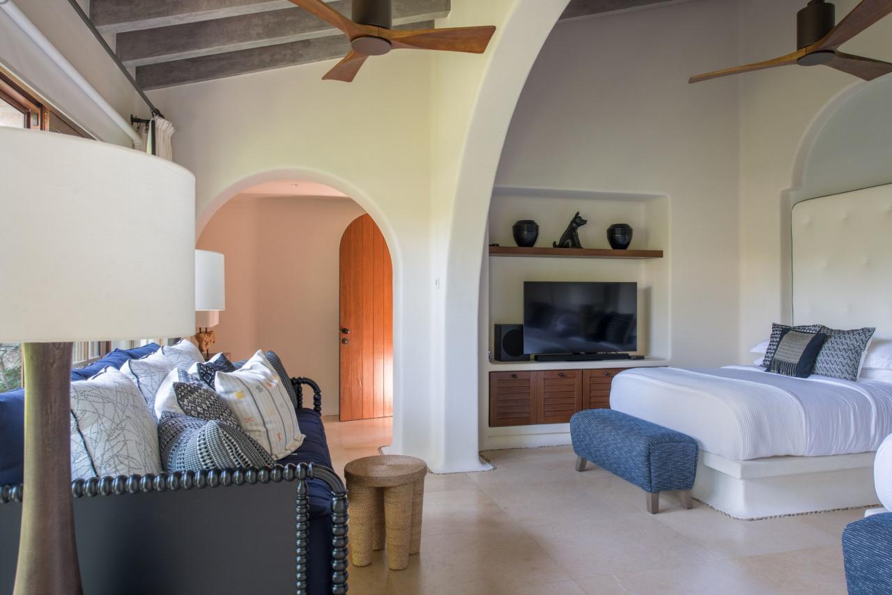 Bedroom 1: This suite is equipped with a king-sized bed, service station (minibar), 65" TV, bathroom with an indoor and outdoor shower, an outdoor marble tub in a private garden, dressing room, and a terrace with an ocean view and direct access to the main garden.