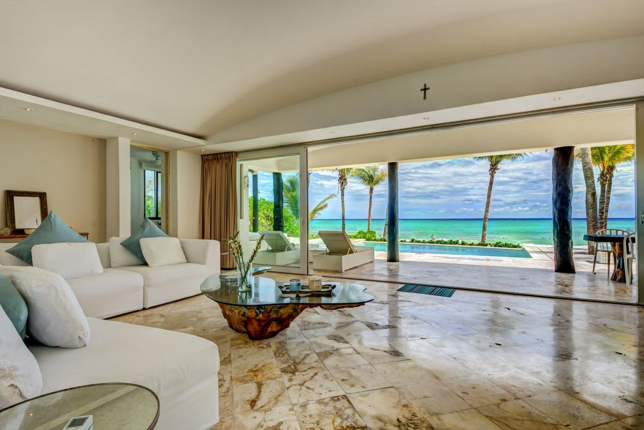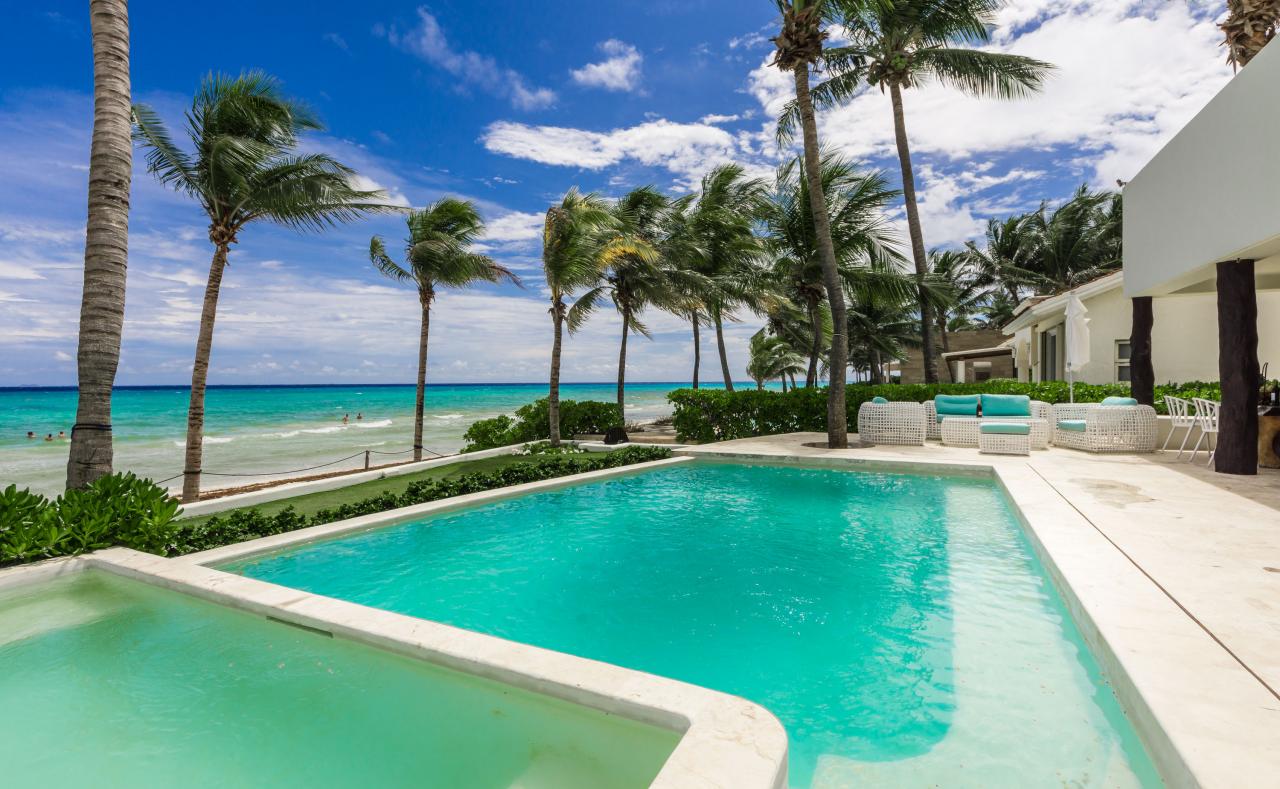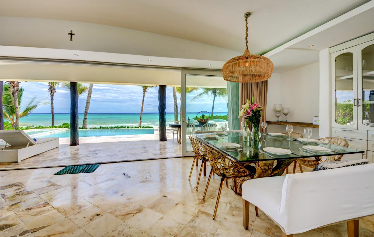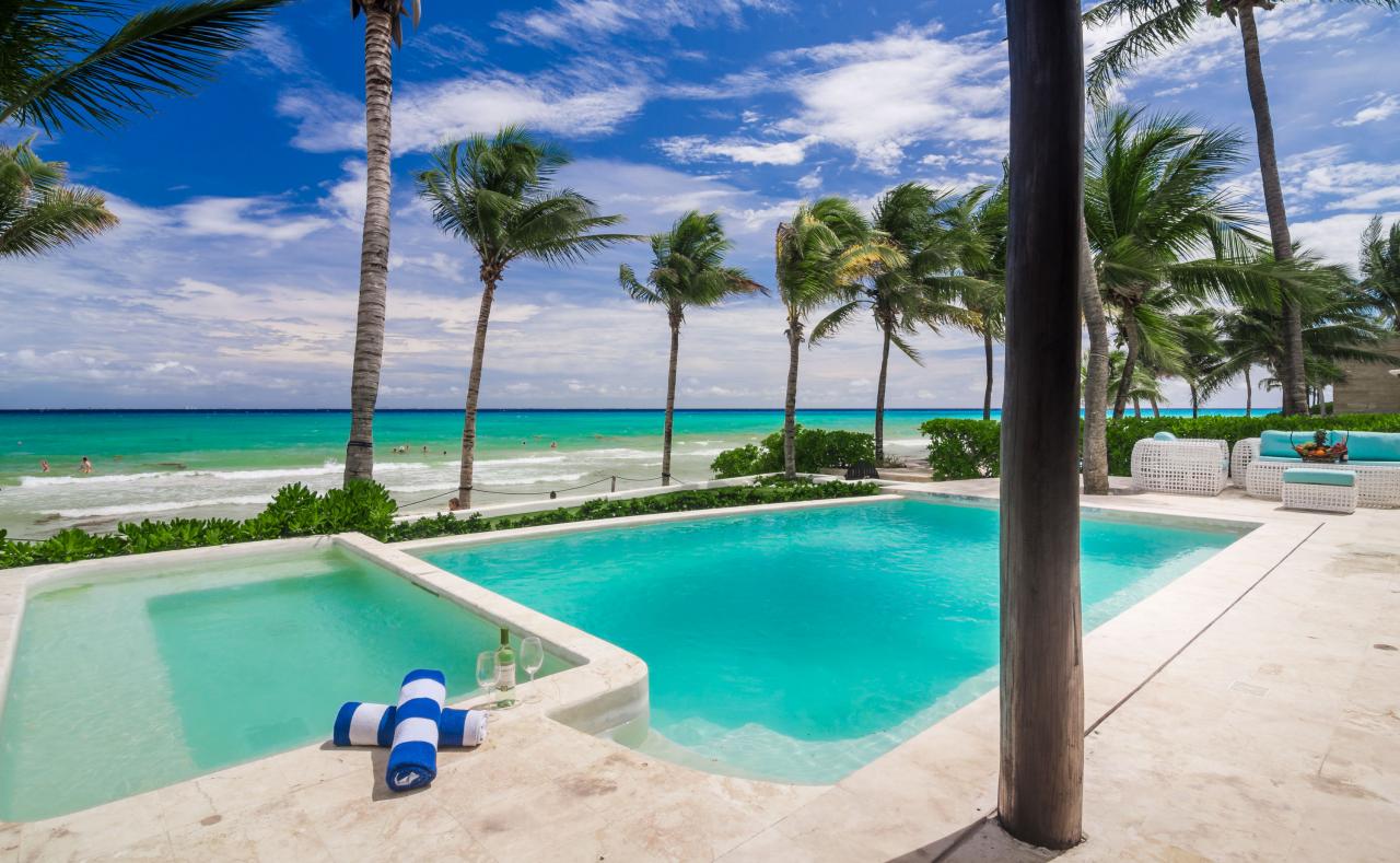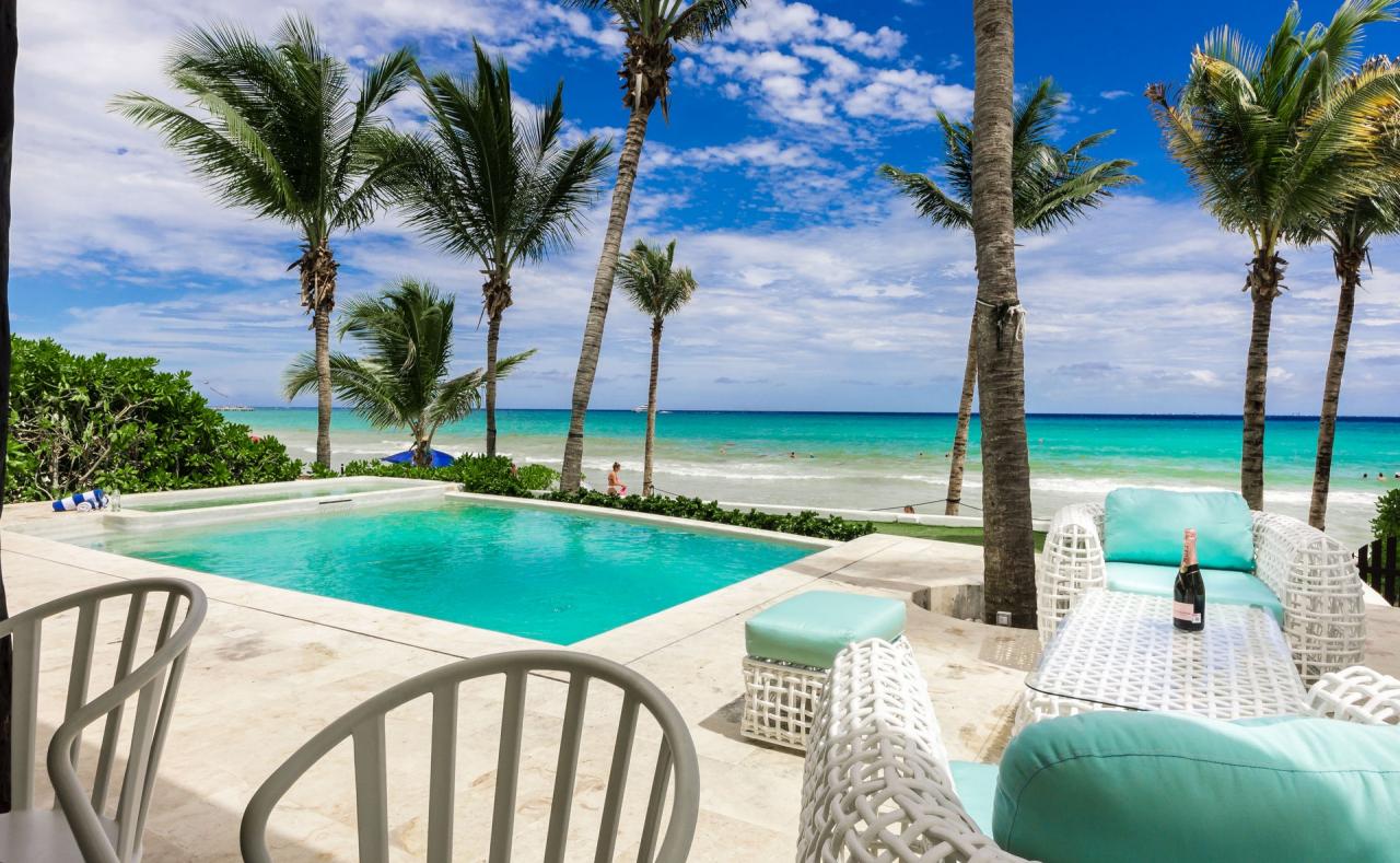 Casa Caramelo is an exceptionally bright, spacious, and elegant beachfront house with an entire wall of windows to enjoy unbeatable Caribbean Sea views from the living room, dining room, kitchen, master bedroom, TV room, and oversized terrace.This gorgeous home features a brand-new swimming pool and quality wooden lounge chairs and patio furniture perfect for a group to enjoy a Mexican vacation in a beachfront dream house.