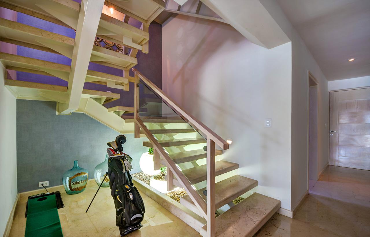 | Third level, King bed, en suite bathroom, AC, CD player, ceiling fan, en suite steam room, lagoon view, ocean view, safety box, satellite flat screen TV, walk in closet |