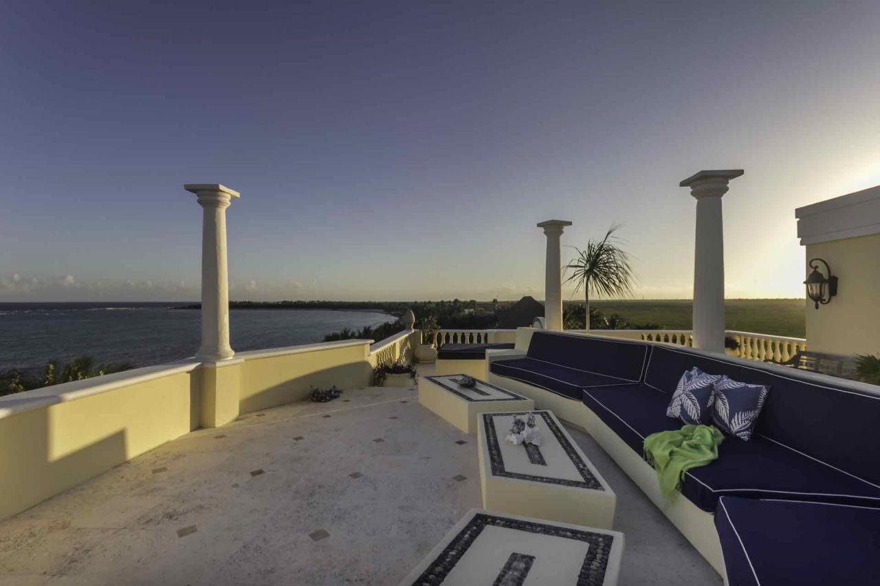 The beachfront patio is a perfect place to entertain; the spacious infinity pool is surrounded by chaise lounges and an outdoor dining area. The stone Grecian aqueduct spills into the pool, while the surrounding palm trees provide an atmosphere of seclusion and privacy. Our live-in staff is available for your every need, and arrangements can be made for day-trip and dining excursions to the best spots in the Riviera Maya, All you need do is ask.
