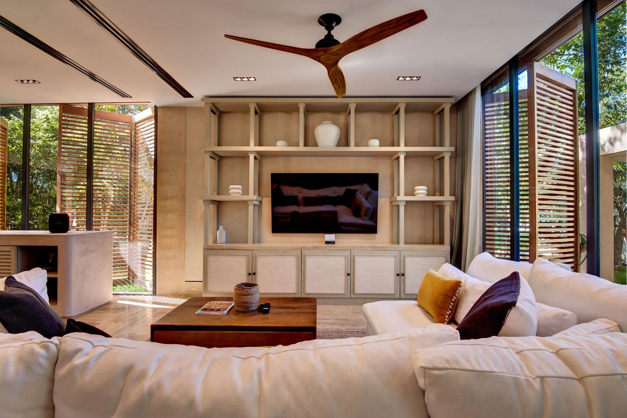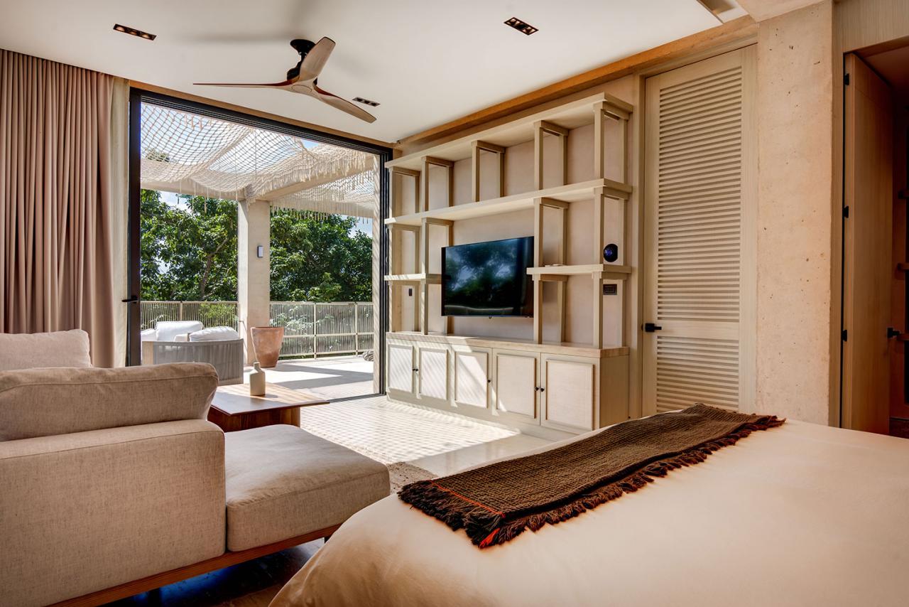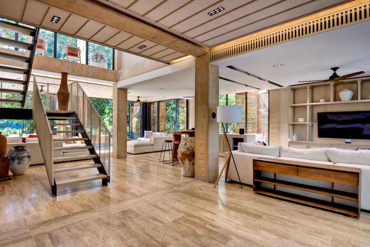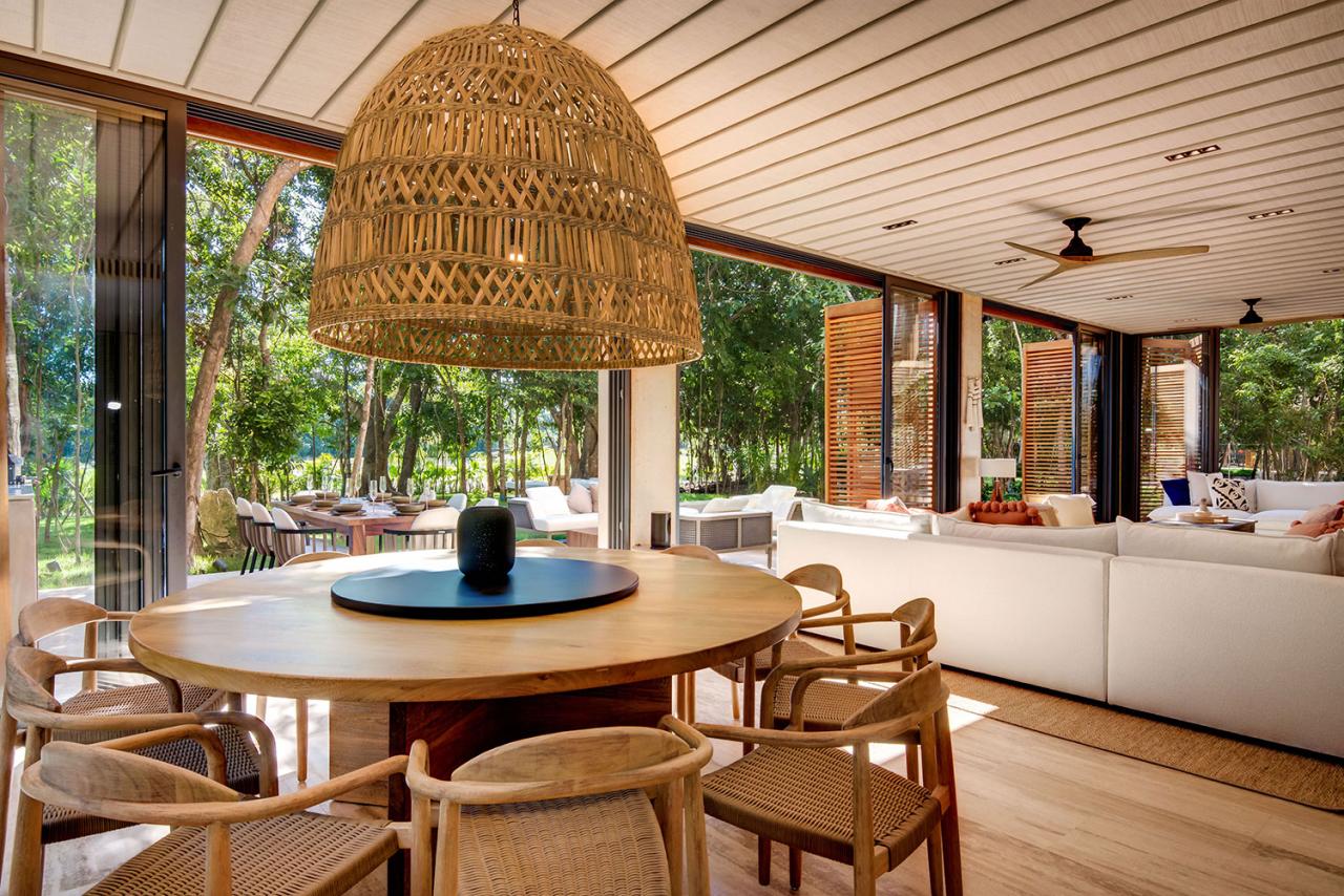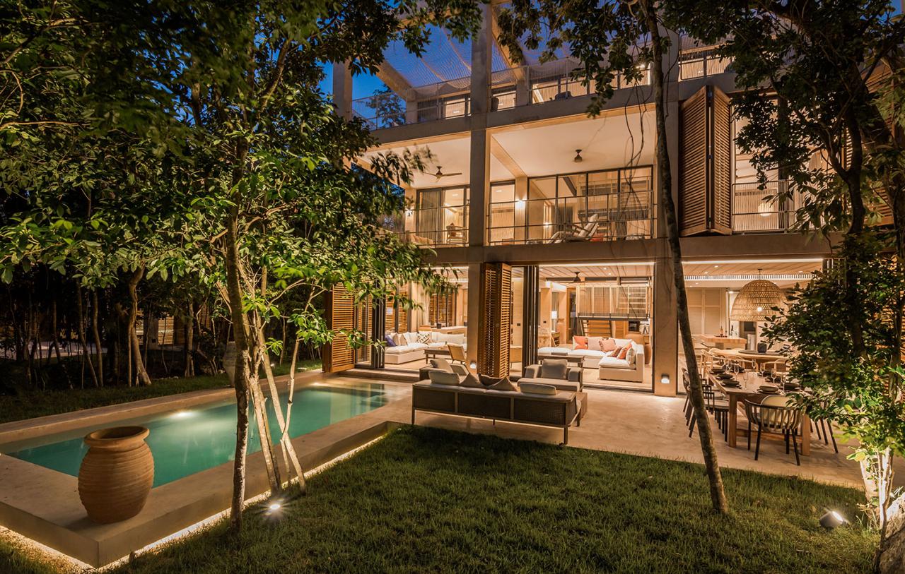Palm Villa, located in the prestigious Corasol community in Playa del Carmen, is a masterpiece of seamless indoor-outdoor living and organic design. This five-bedroom villa is a perfect blend of modern architecture and natural surroundings, providing an unparalleled experience for family vacations. With 900 square feet of outdoor space, including a stylish plunge pool, terrace lounge, and expansive balconies, the residence is framed by lush greenery that offers both beauty and privacy. Its open-concept cubic layout integrates the villa's elegant interiors with the vibrant natural environment, creating a harmonious retreat.