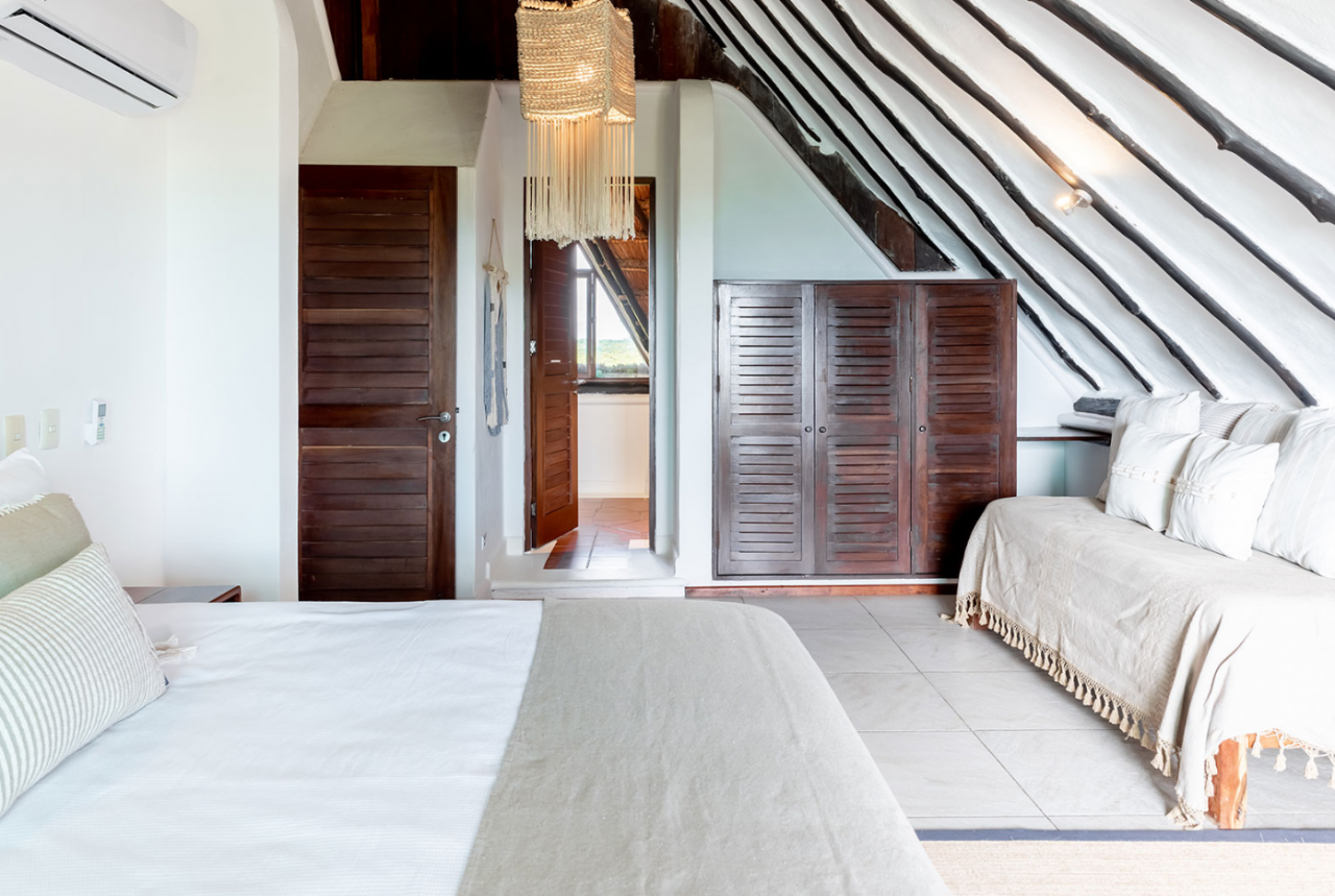 On the top floor, under the palapa, a Caribbean atmosphere is assured. You will discover a large King bedroom with en suite bathroom. It also has a private terrace where you will enjoy the beautiful picture-frame view of the bay.