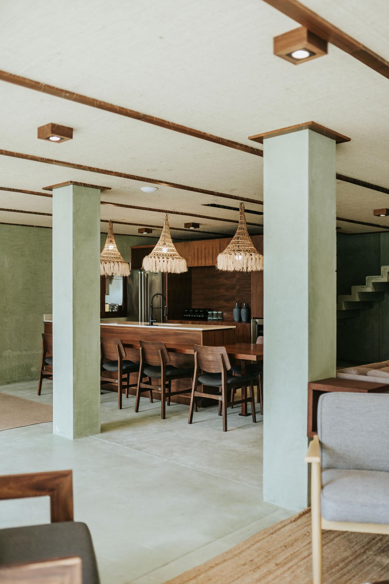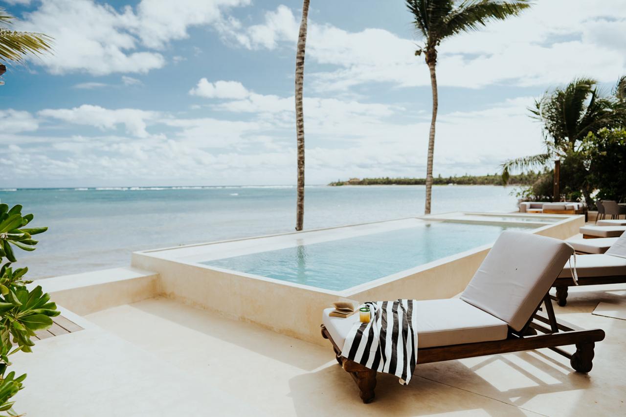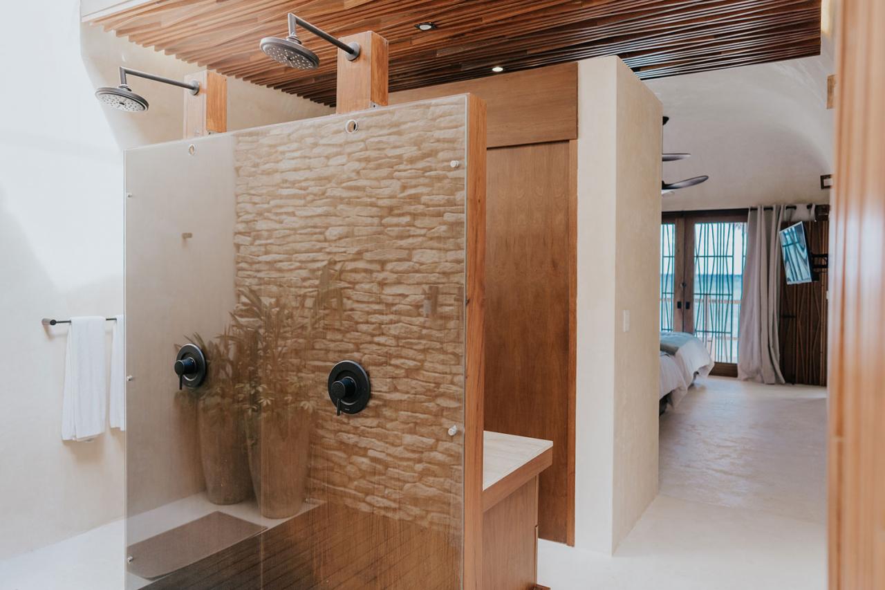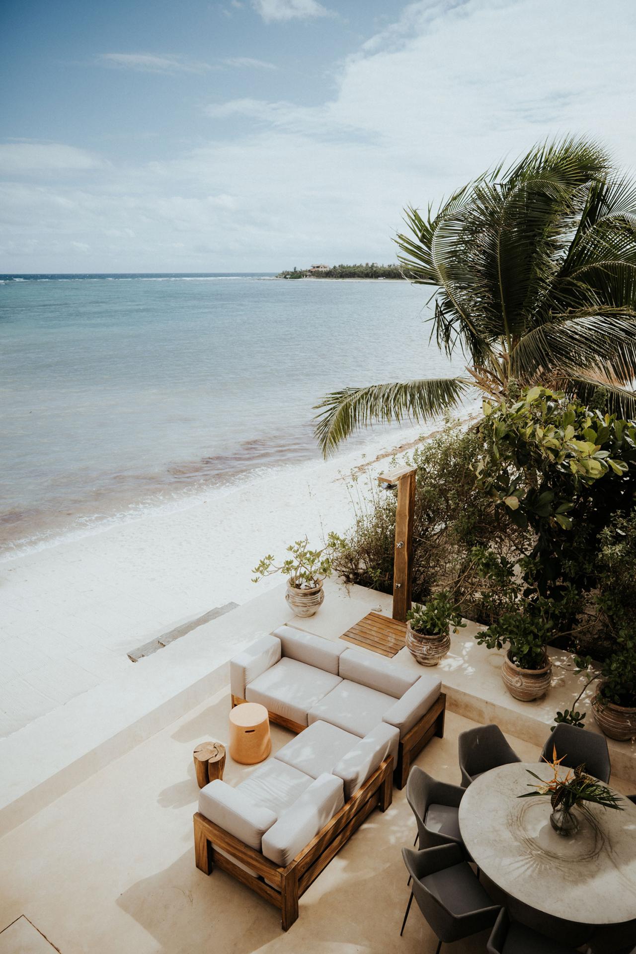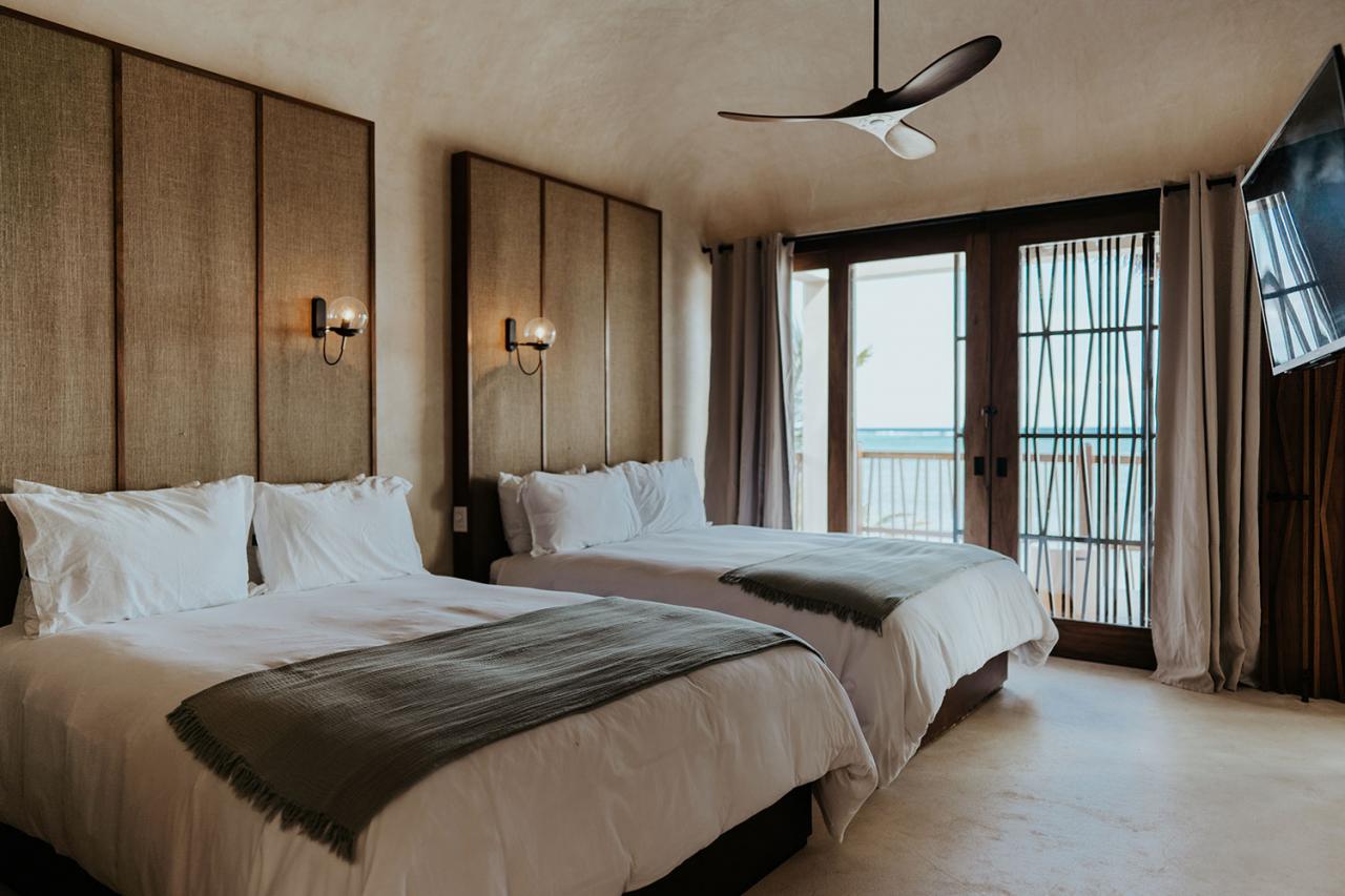 The main house comfortably sleeps 12 guests in five suites, each thoughtfully designed with clean lines, local materials, and air conditioning. These bedrooms offer queen-size beds, exquisite stone-fitted bathrooms, and breathtaking ocean views, with sea-facing balconies perfect for unwinding during long, peaceful afternoons. The casita, built in the same elegant style, includes three additional bedrooms and features a sandy area with palm trees, creating a charming space for hosting celebrations.