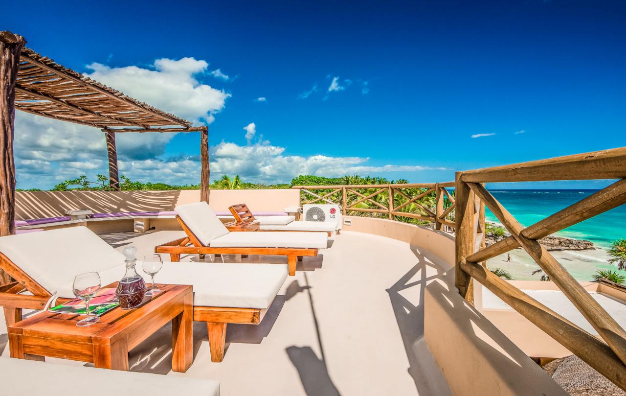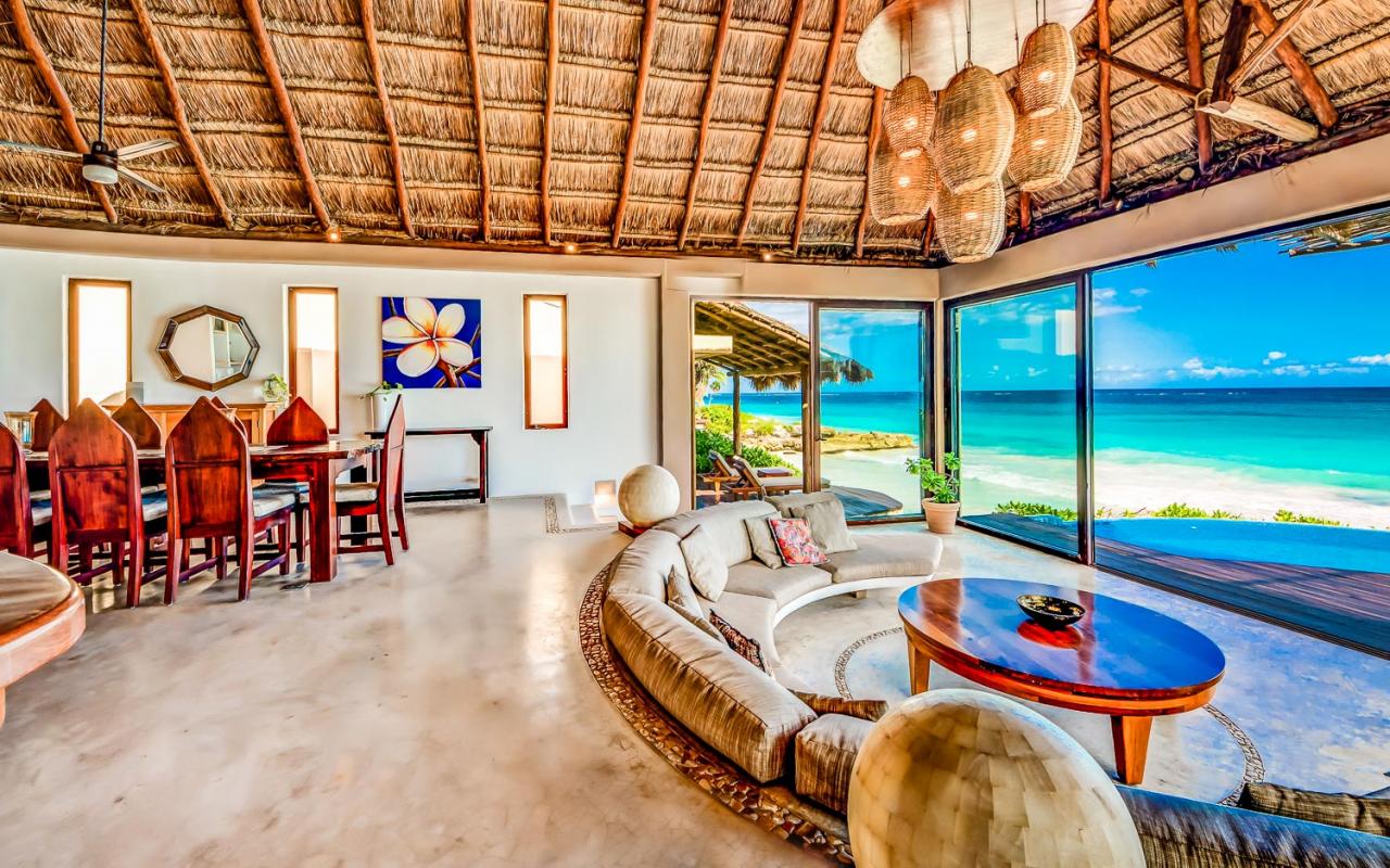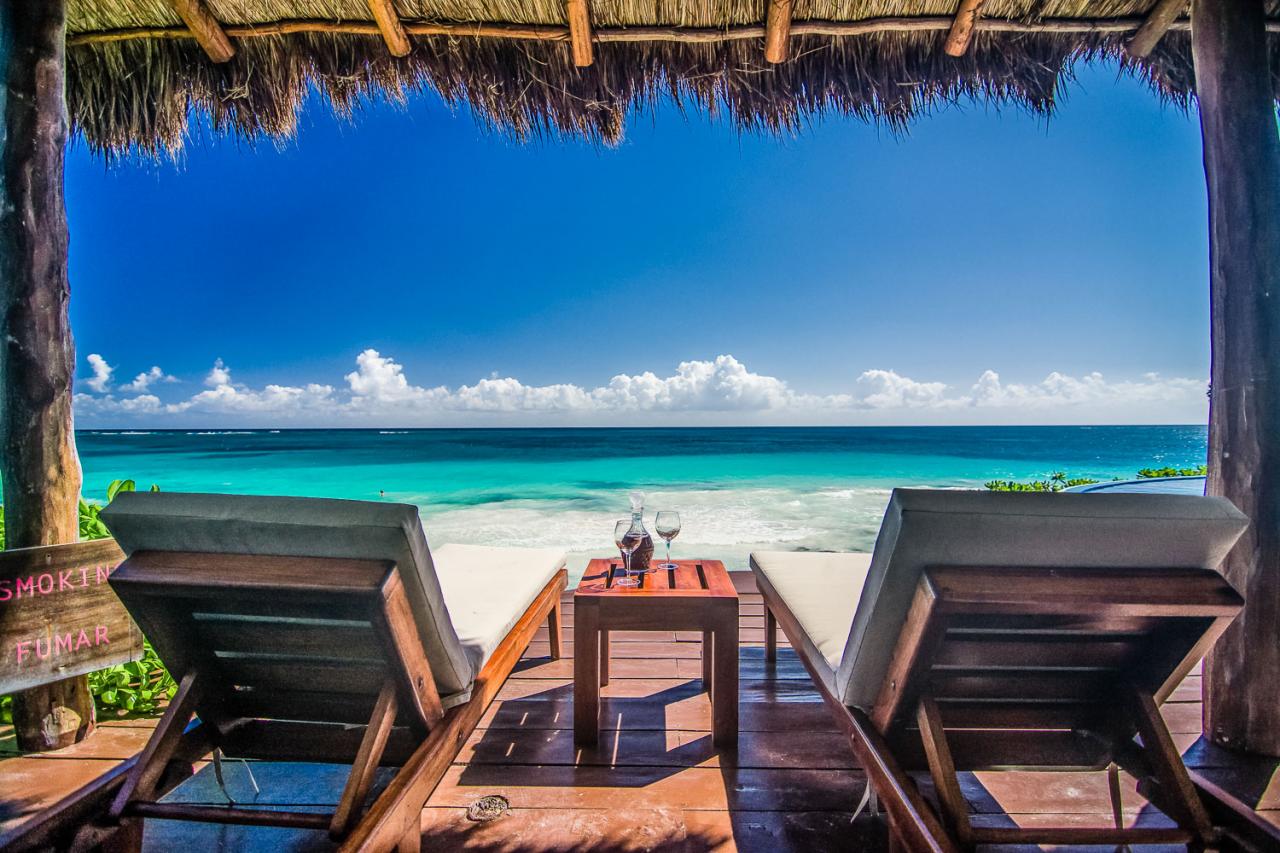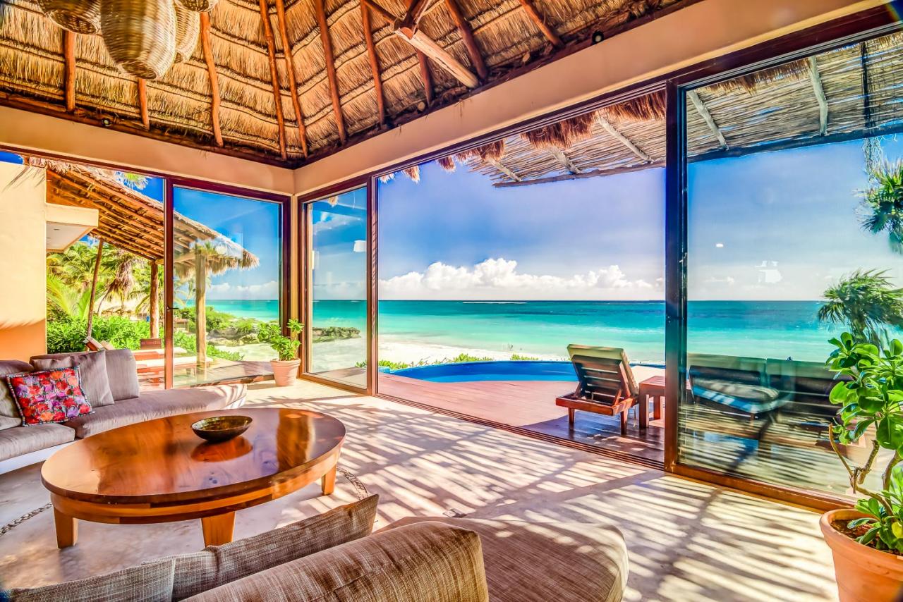Villa Miramar is a new oceanfront beach house located in the heart of Tulum’s famous Caribbean coast, one and a half miles south of the historic Mayan ruins. Where the surf breaks directly in front of the grand palapa room is some of the best snorkeling in Tulum.