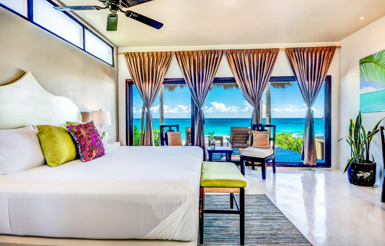Emperor Suite: Ground level, King bed, En suite bathroom, Air conditioning, Bathroom with shower, Ceiling fan, Ocean view, Private entrance, Private Palapa, Safety box, Toiletries, Window Screen