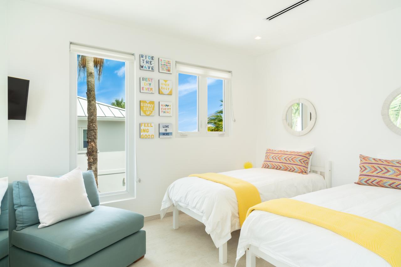 Kids Bedroom: This room is located in the Guest House. The Kids' Bedroom is equipped with twin-sized beds, a TV, a garden view, and a closet.